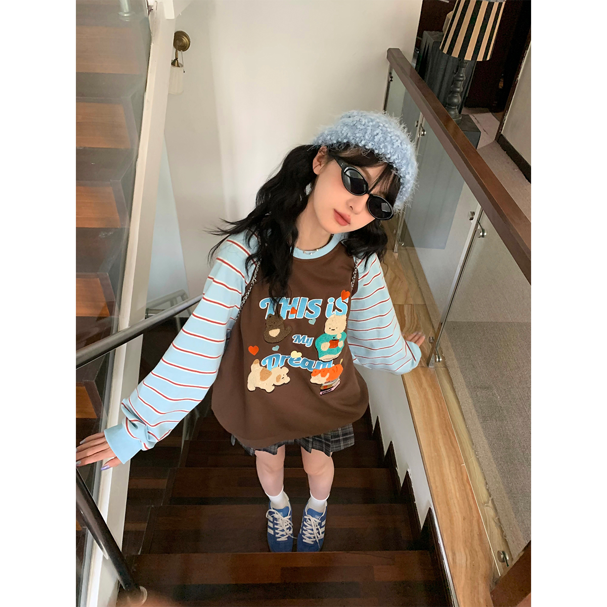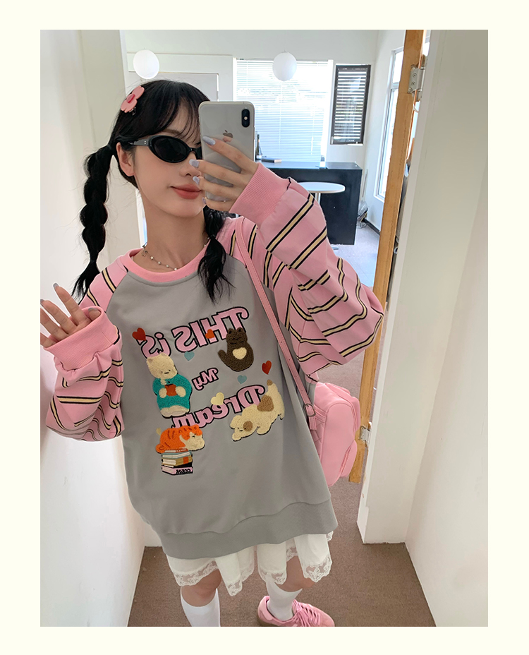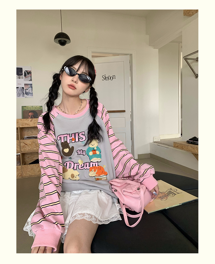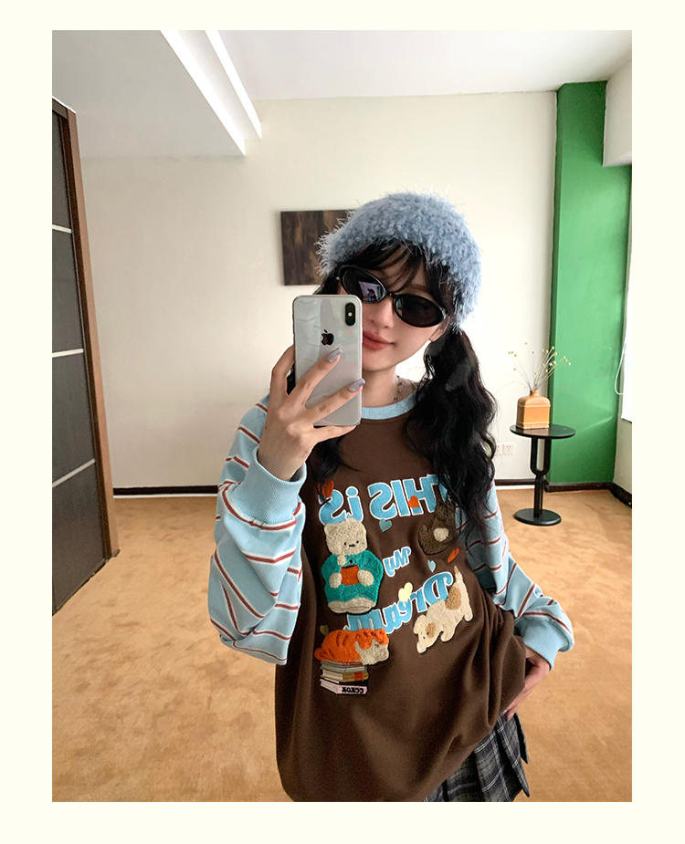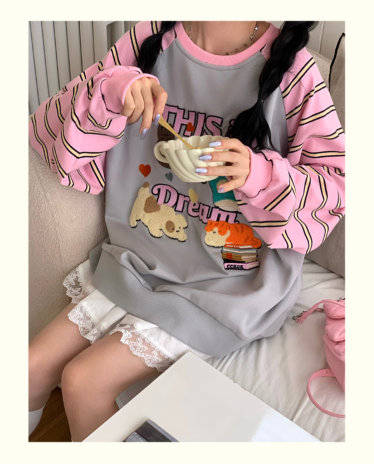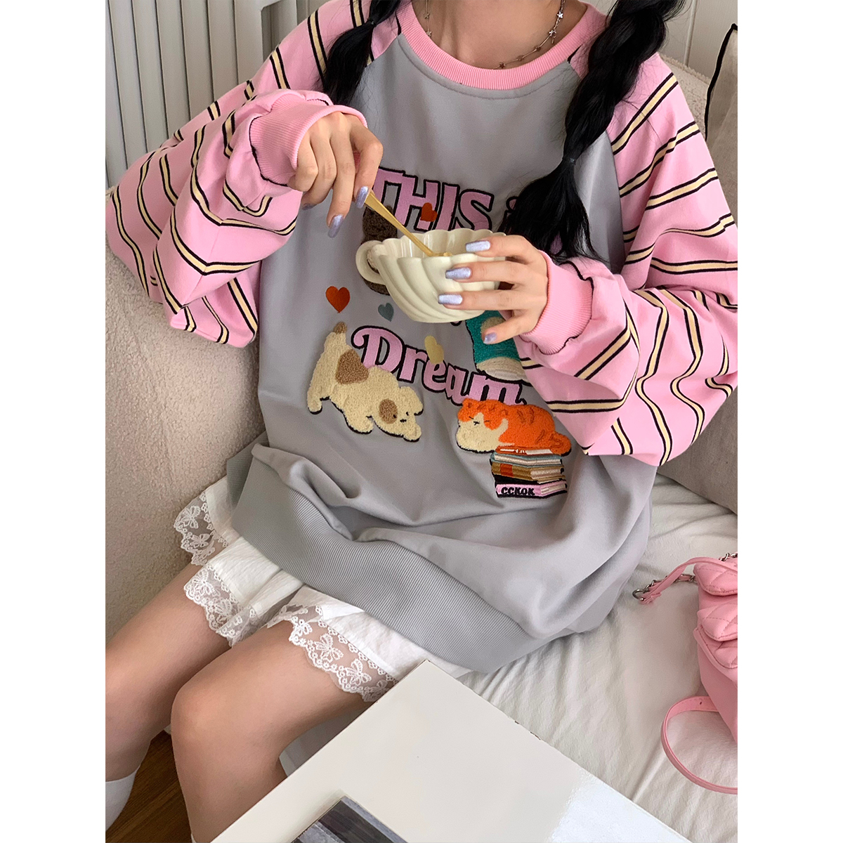 【現貨】CCKOK 2023年秋條紋插袖可愛甜美寬鬆圓領套頭毛巾繡衛衣