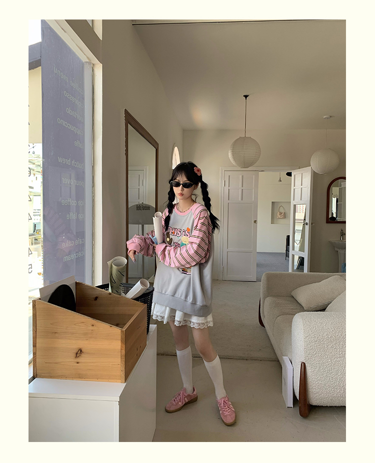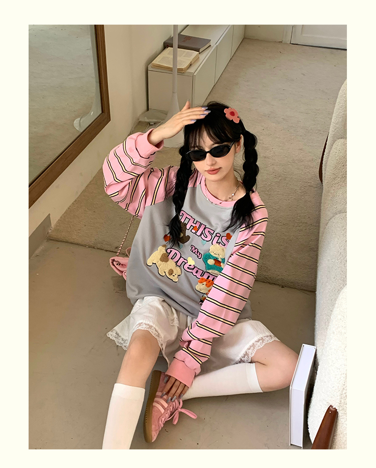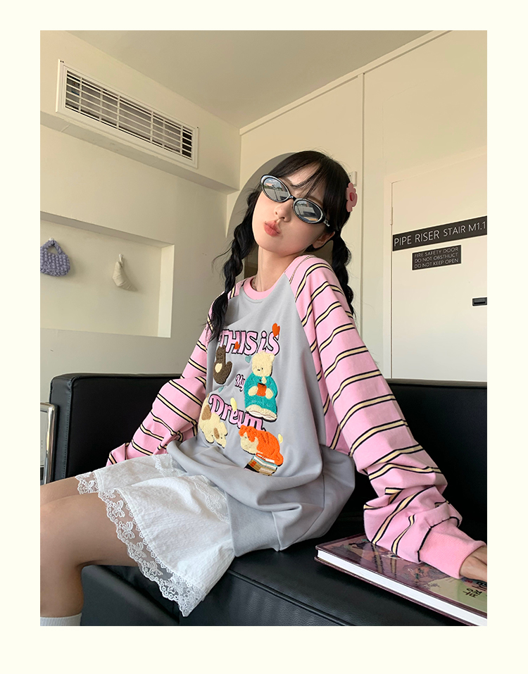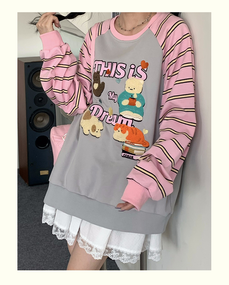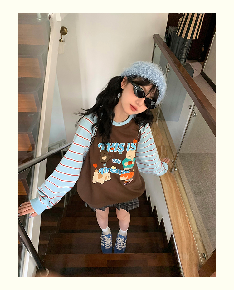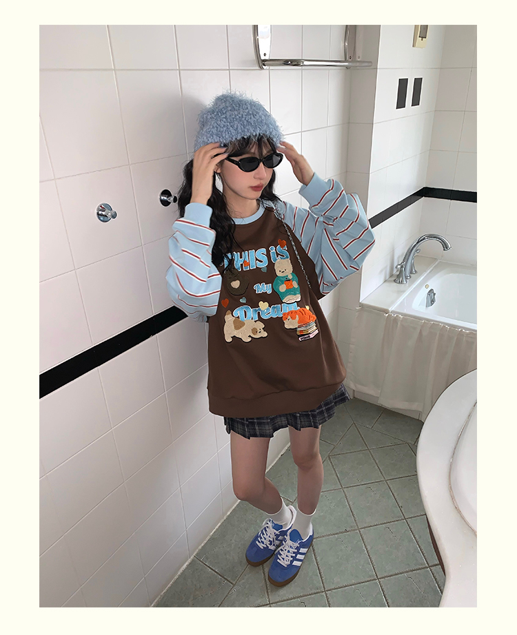 【現貨】CCKOK 2023年秋條紋插袖可愛甜美寬鬆圓領套頭毛巾繡衛衣