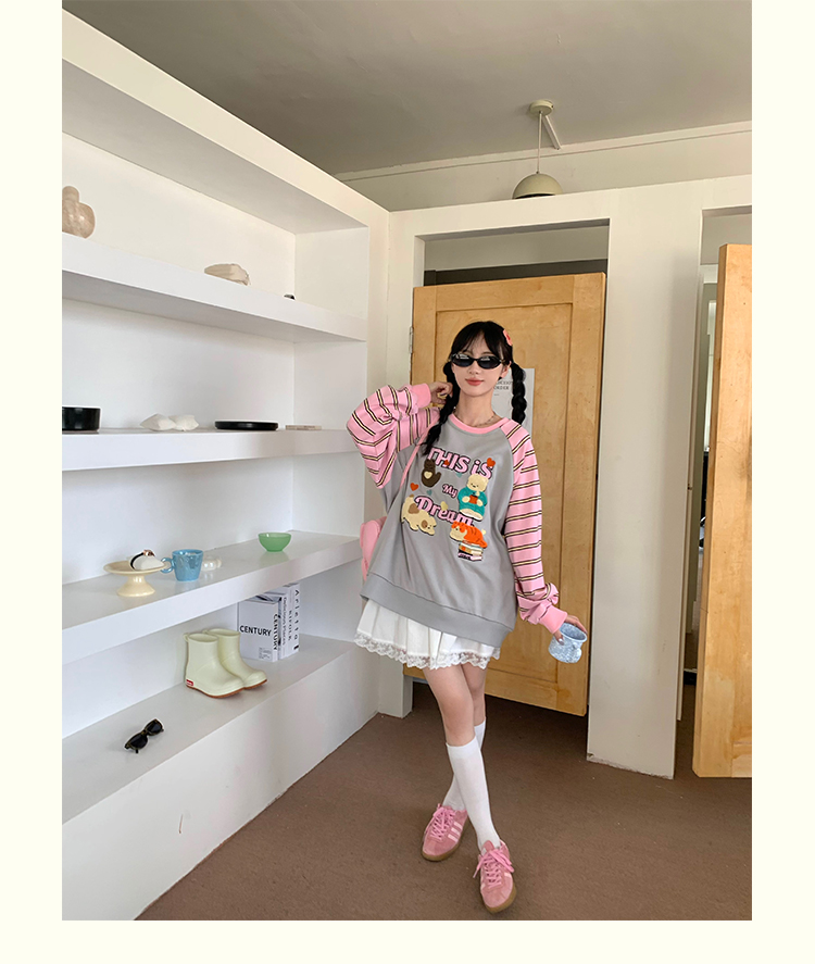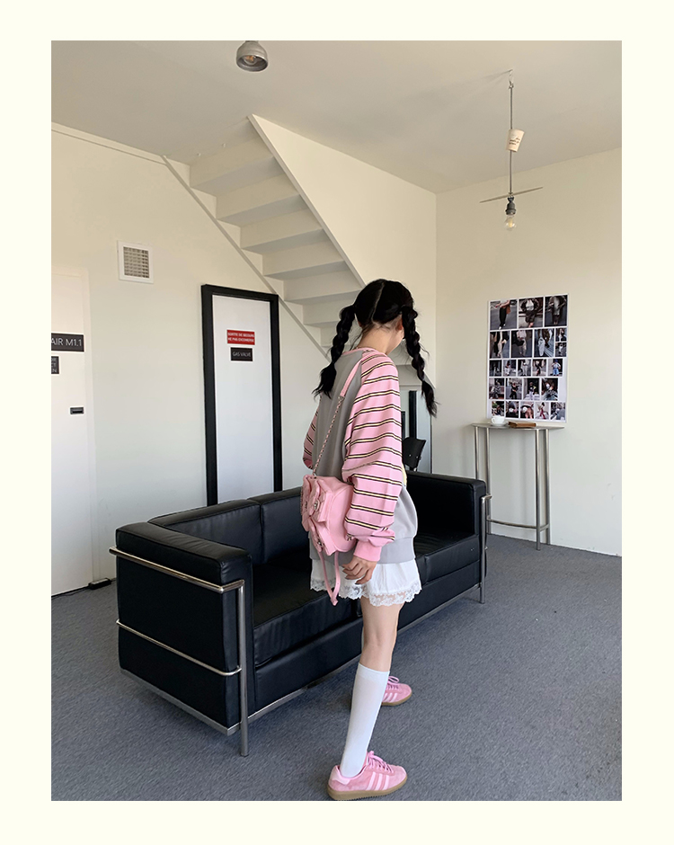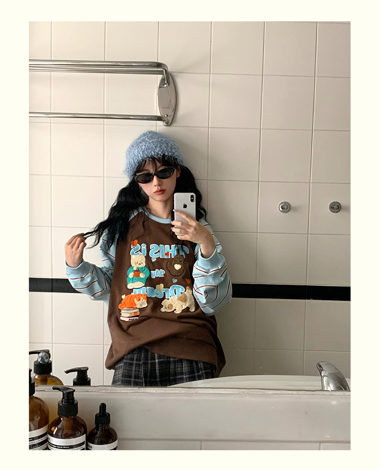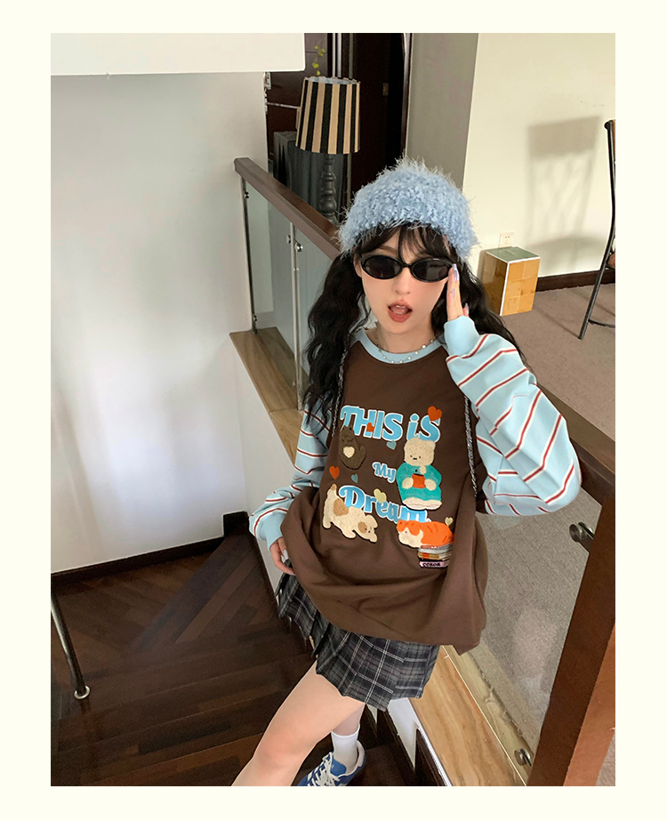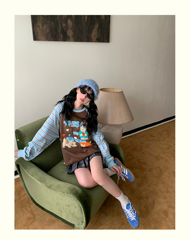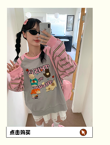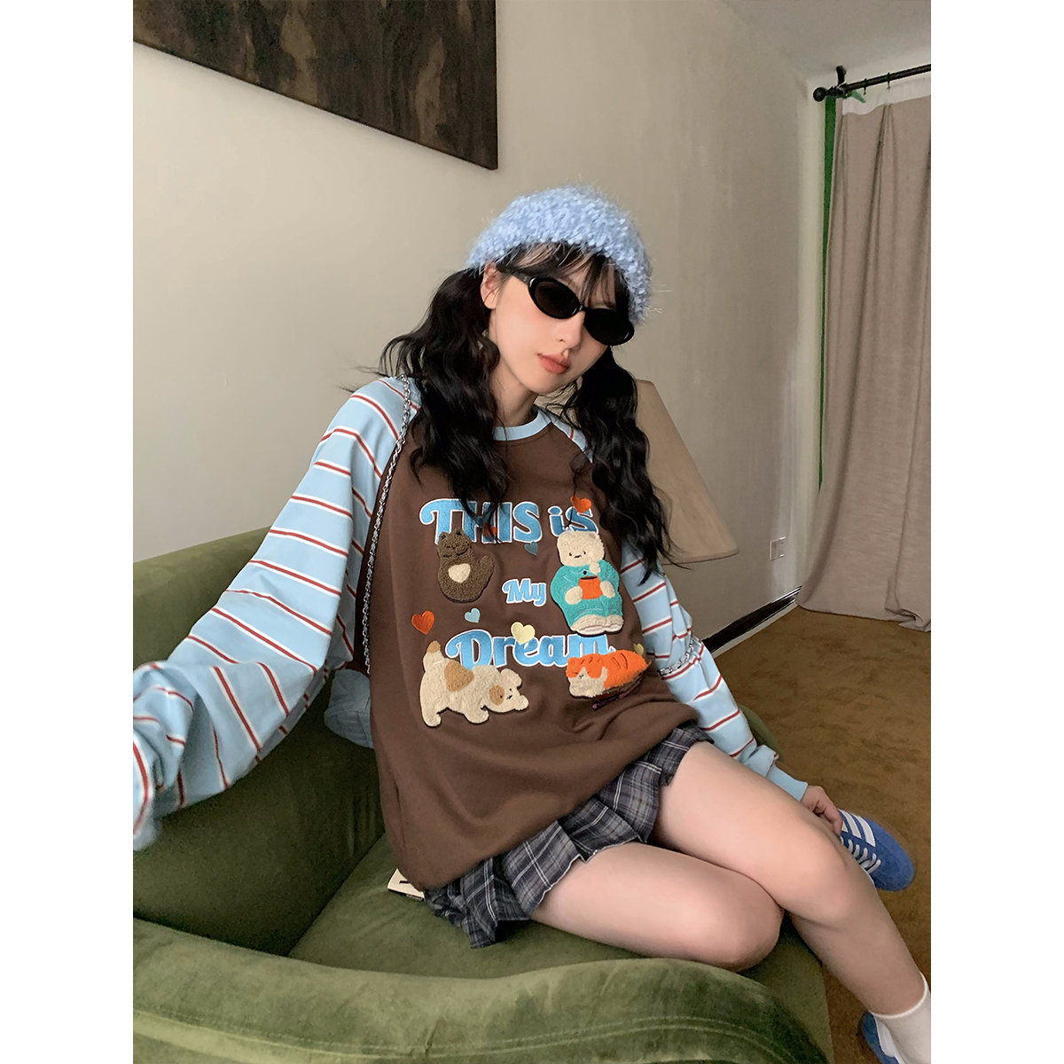【現貨】CCKOK 2023年秋條紋插袖可愛甜美寬鬆圓領套頭毛巾繡衛衣