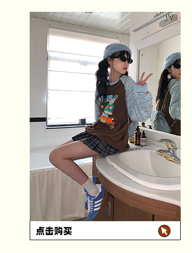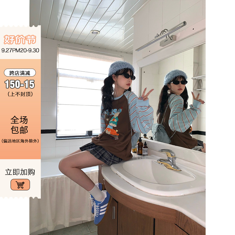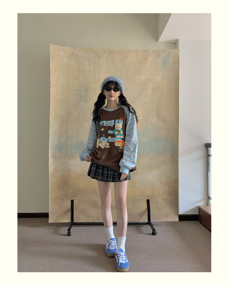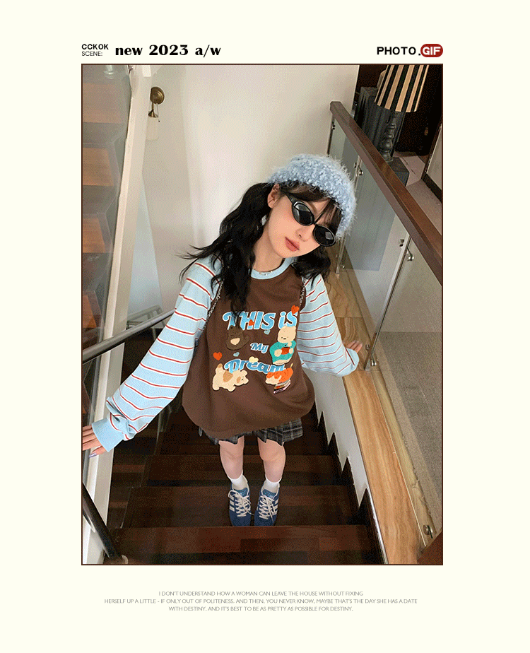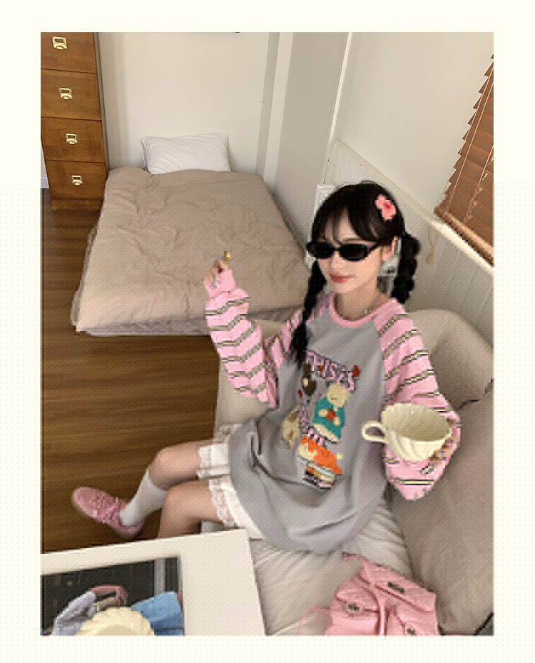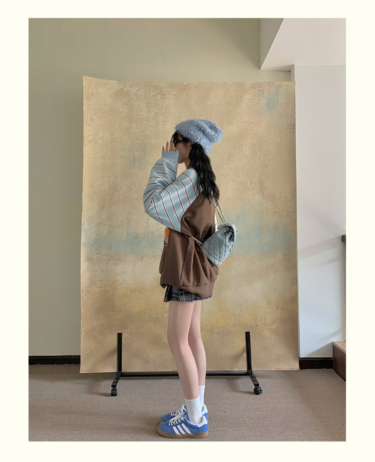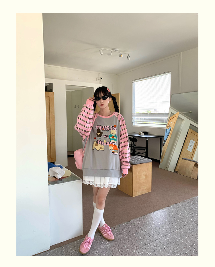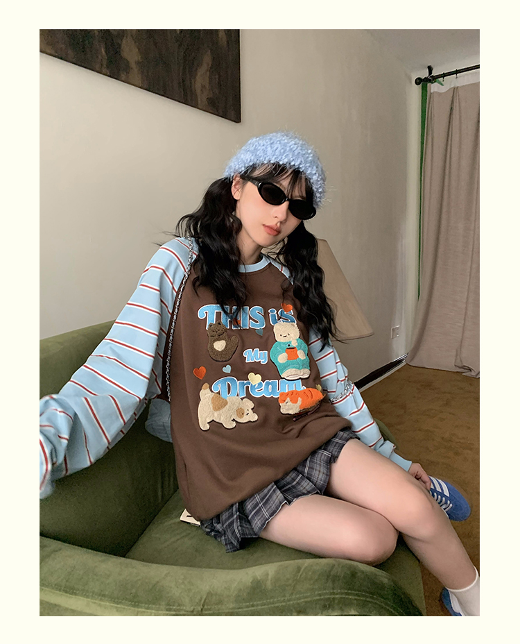 【現貨】CCKOK 2023年秋條紋插袖可愛甜美寬鬆圓領套頭毛巾繡衛衣