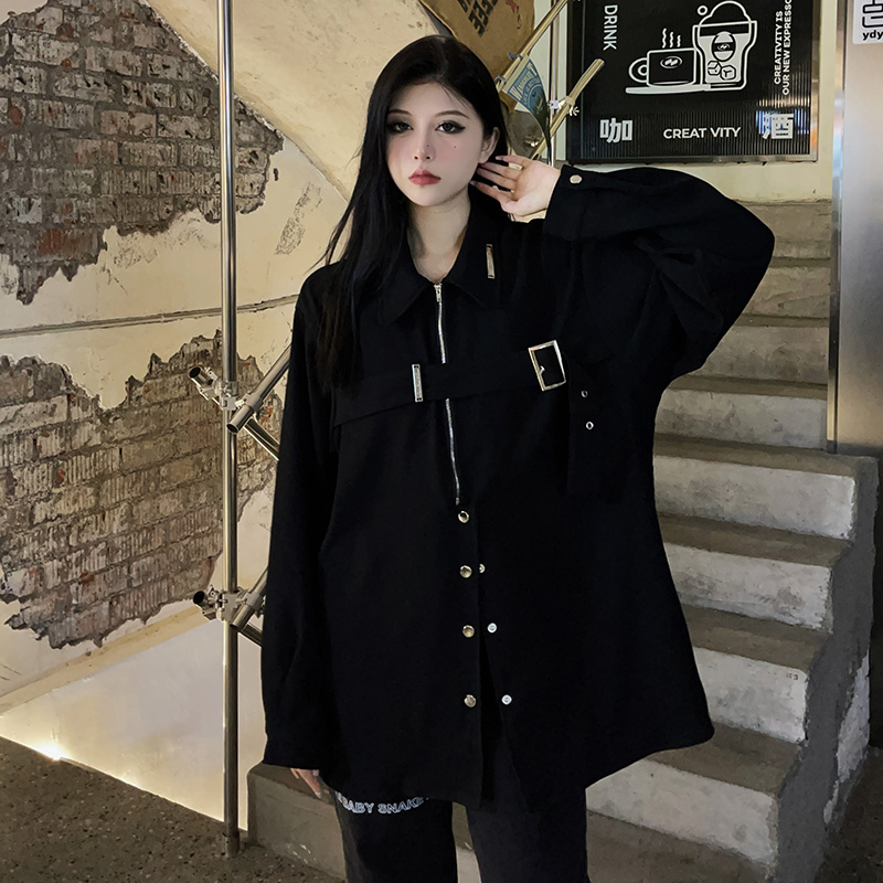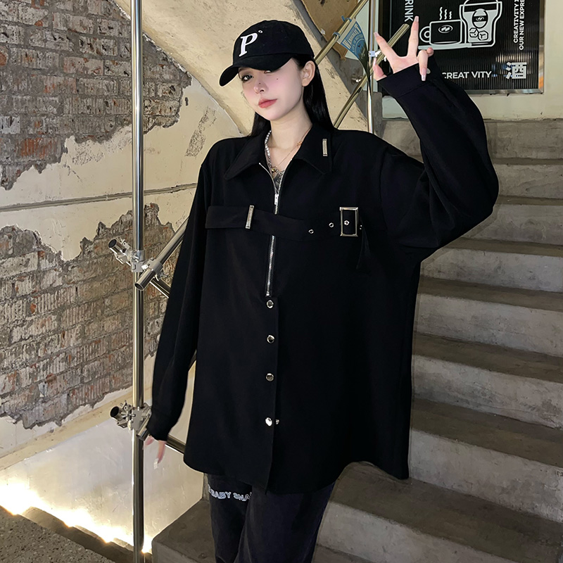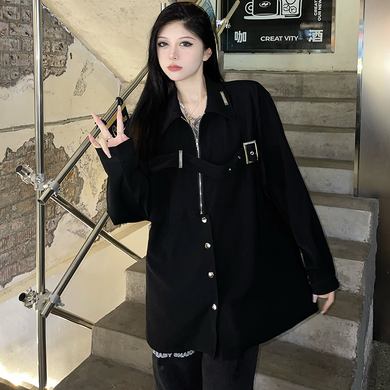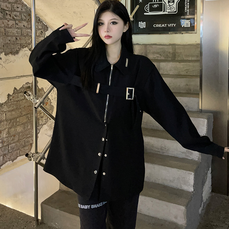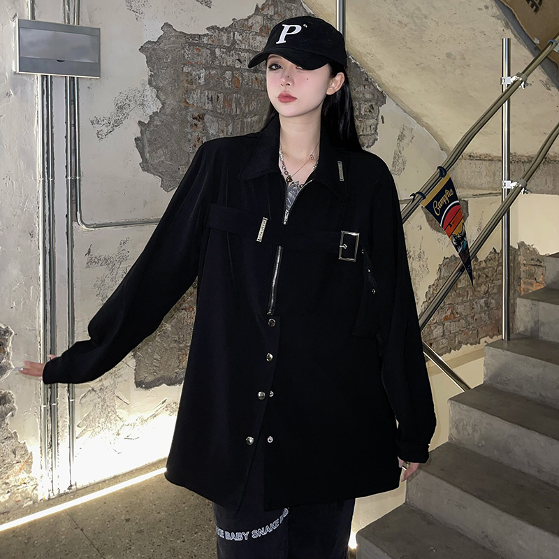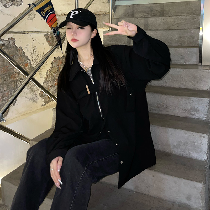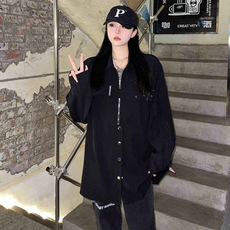 黑色長袖襯衫女春季美式復古設計感小眾襯衫寬鬆百搭休閒外套上衣