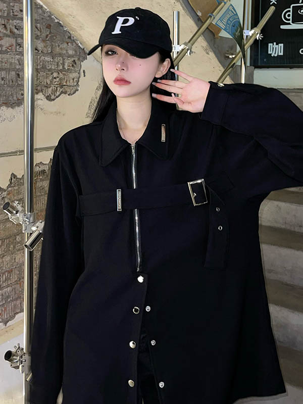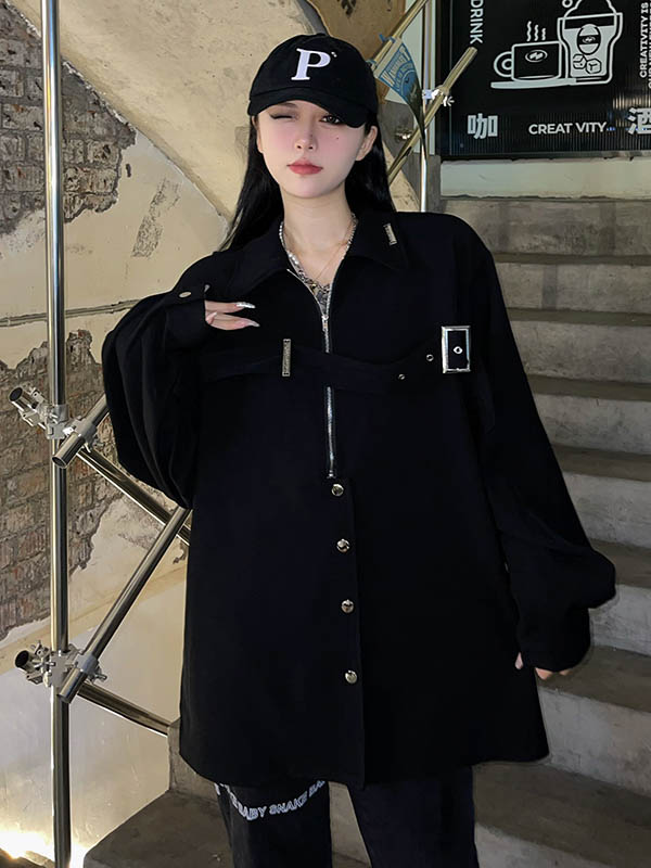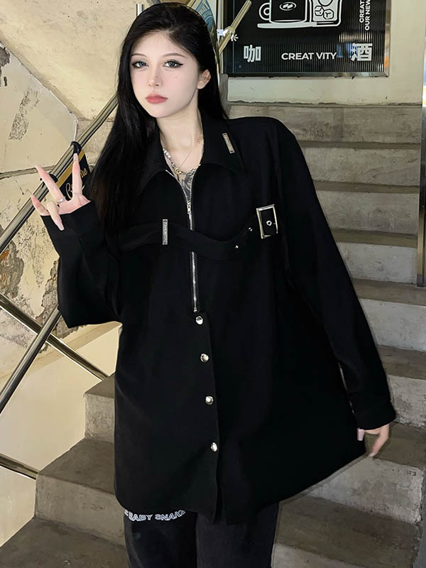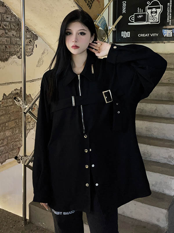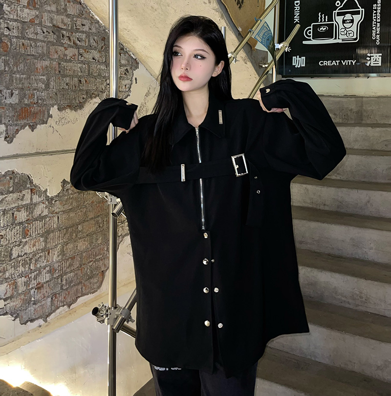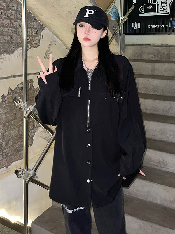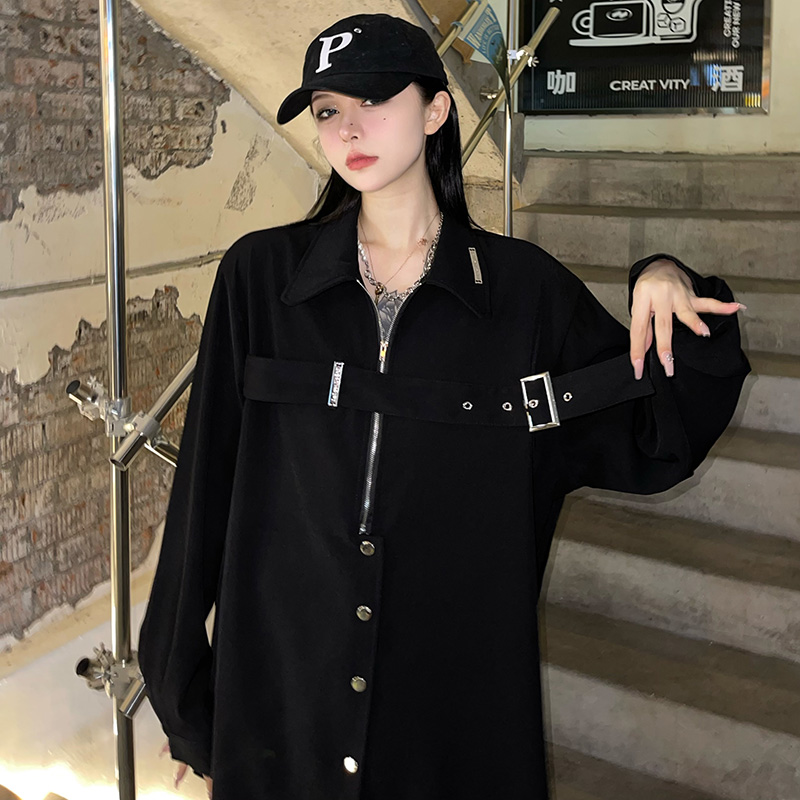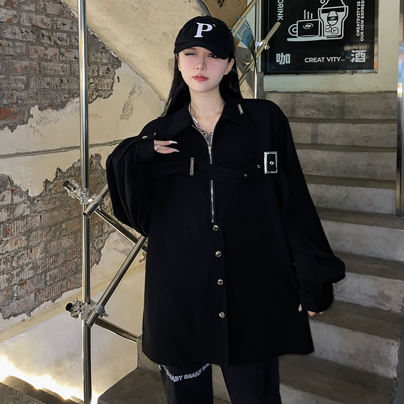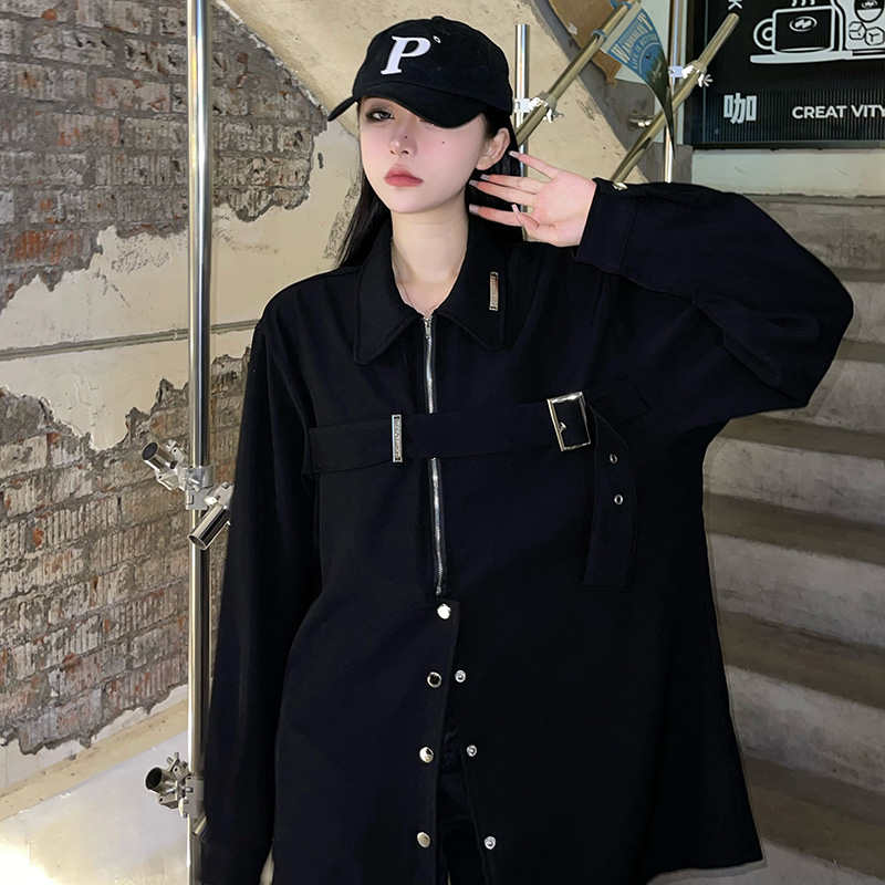 黑色長袖襯衫女春季美式復古設計感小眾襯衫寬鬆百搭休閒外套上衣