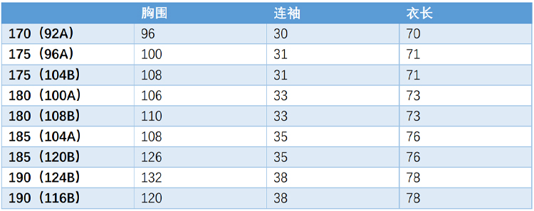 尺碼 170(92A)建議身高173cm體重130斤左右,175(96A)建議身高173cm體重130-150斤左右,175(104B)建議身高173cm體重150-170斤左右,180(100A)建議身高175cm體重150-165斤左右,180(108B)建議身高175cm體重165-180斤左右,185(104A)建議身高180cm體重165-180斤左右,185(120B)建議身高180cm體重195-225斤左右,190(116B)建議身高185cm體重180-195斤左右,190(124B)建議身高185cm體重220-240斤左右