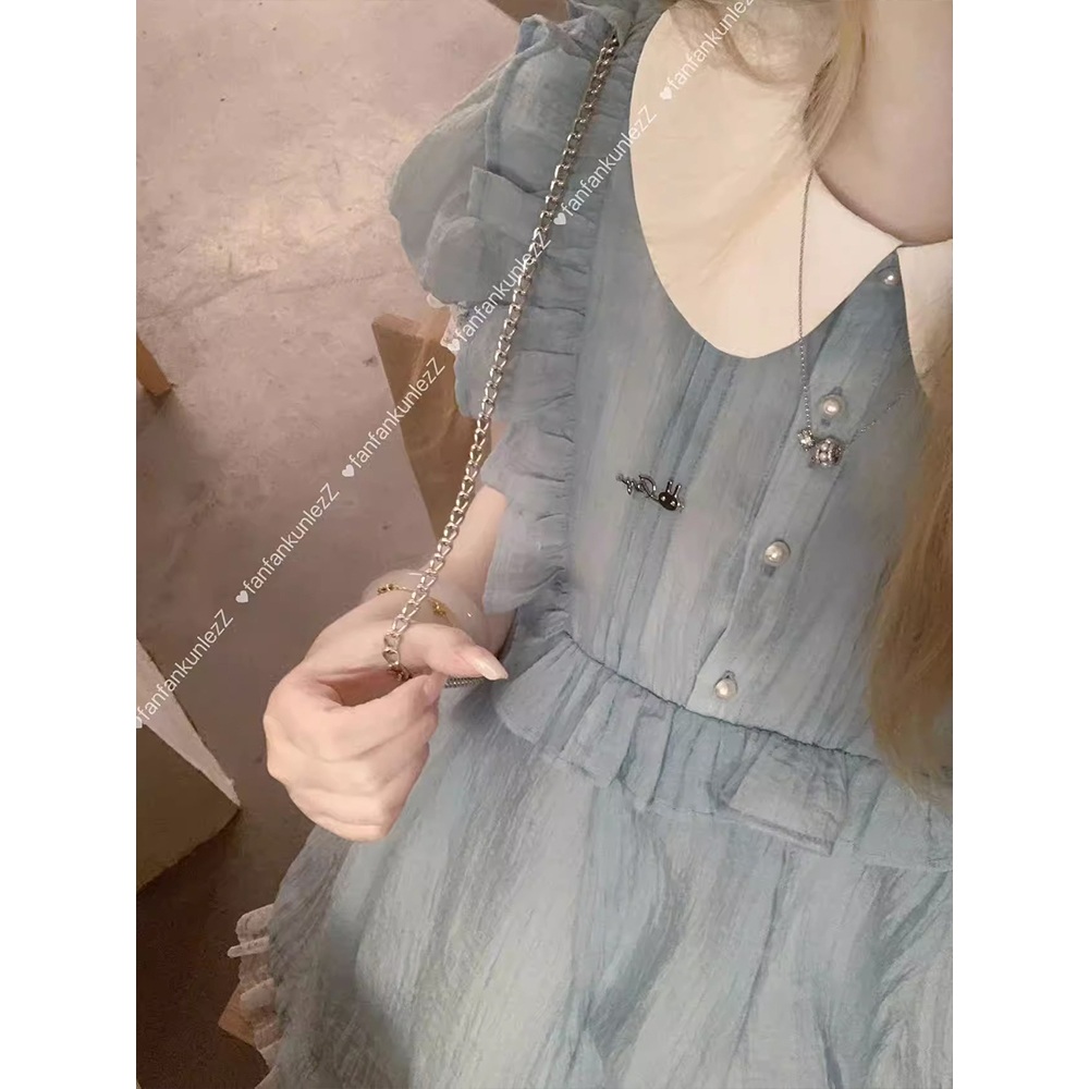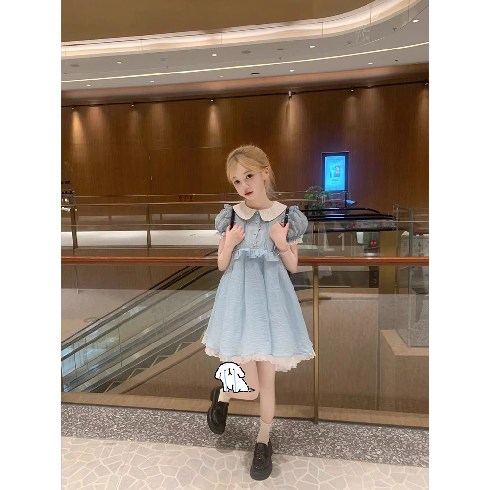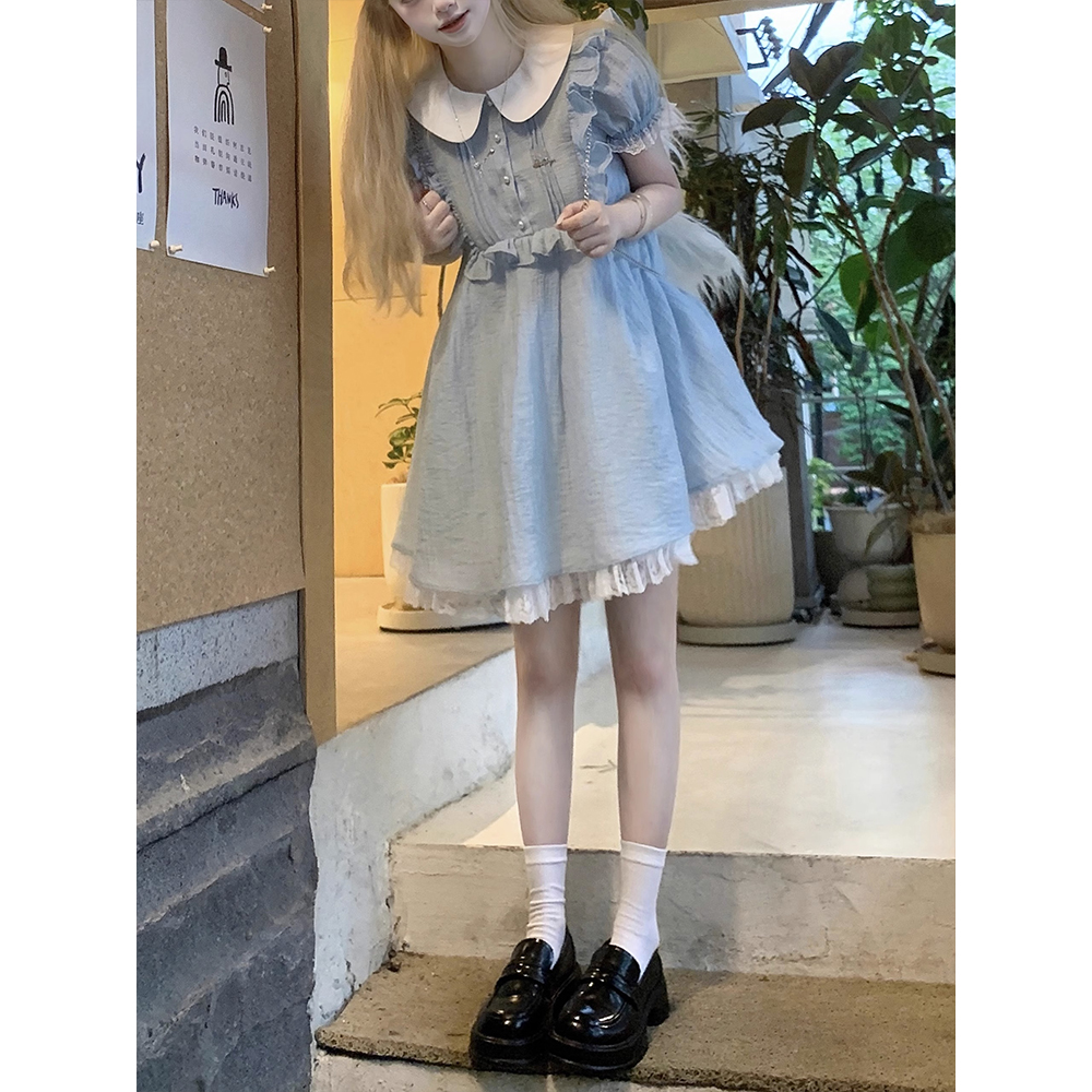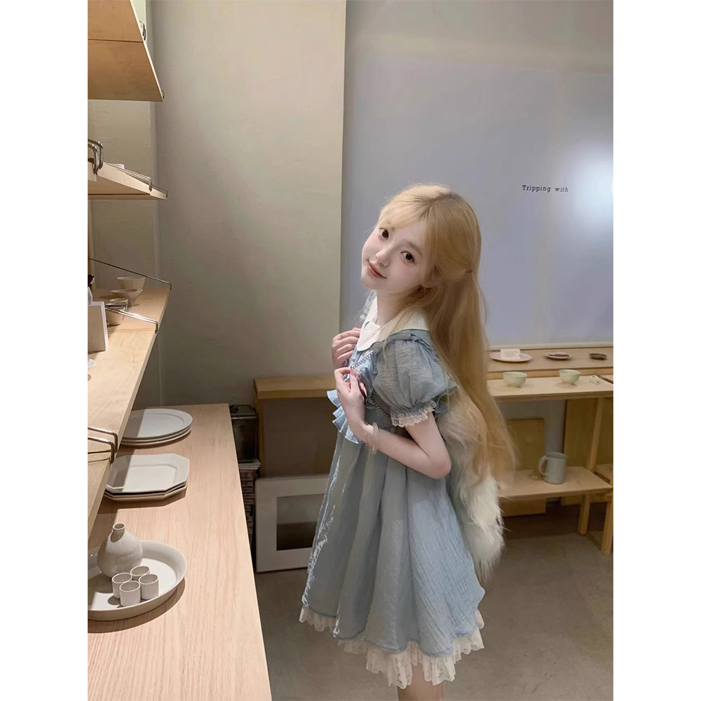 法式可愛藍色娃娃領泡泡袖洋裝女夏季蕾絲花邊小個子a字短裙子
