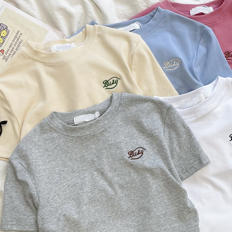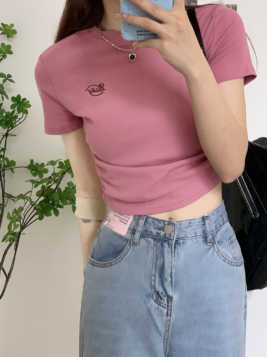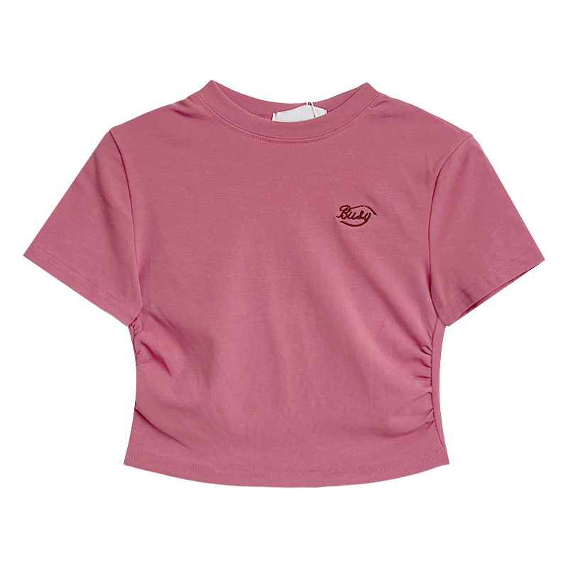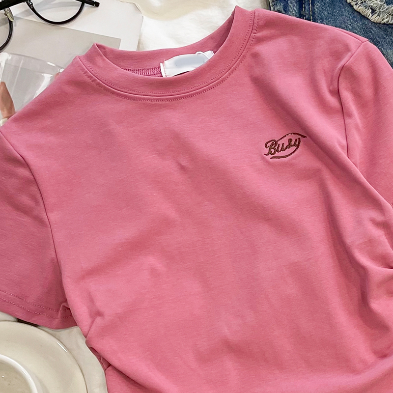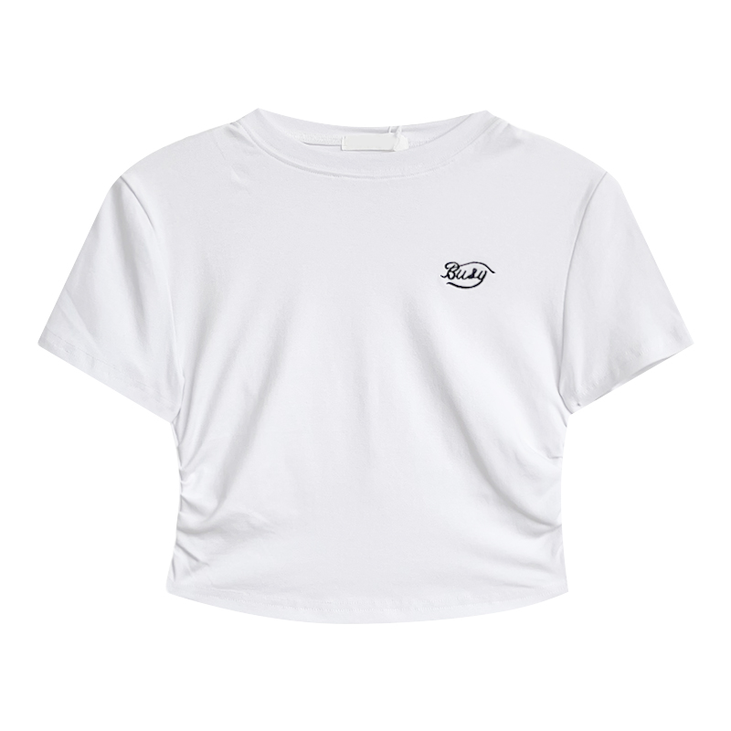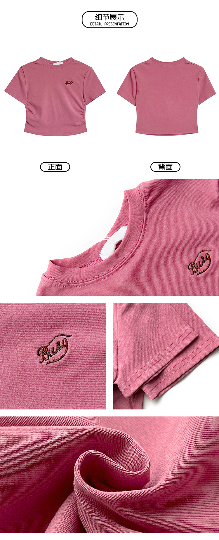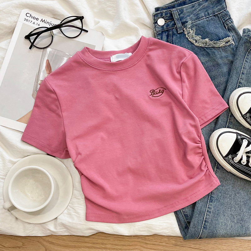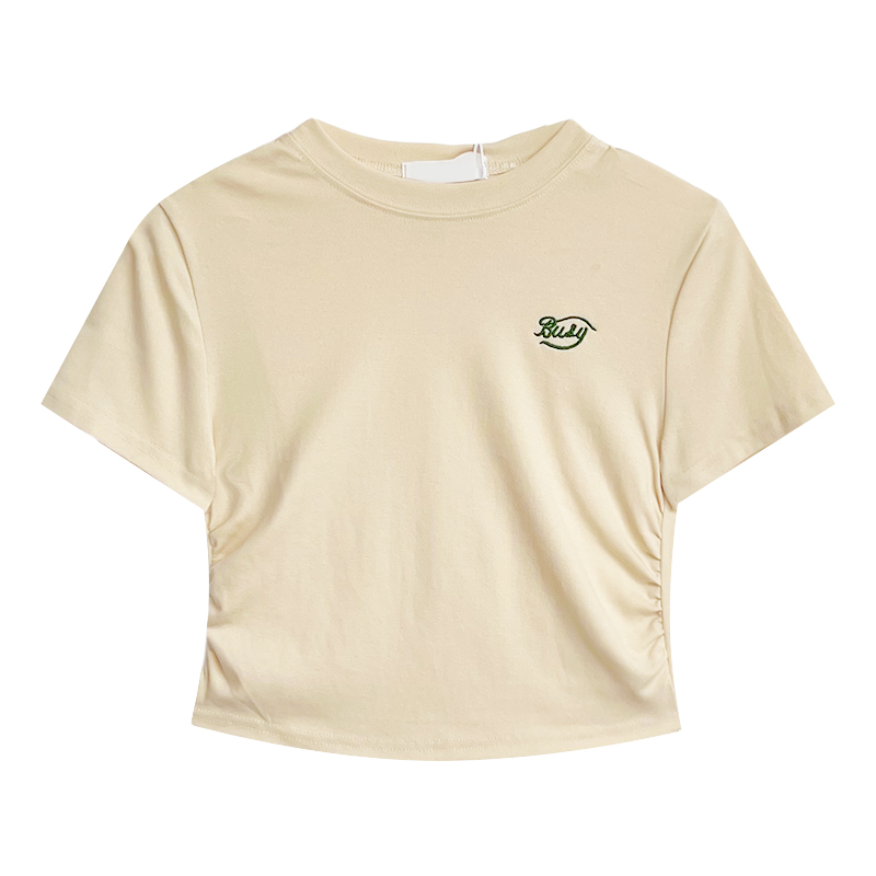 RENA美式休閒小字母刺繡百搭壓褶收腰顯瘦舒適彈力棉短款正肩T恤