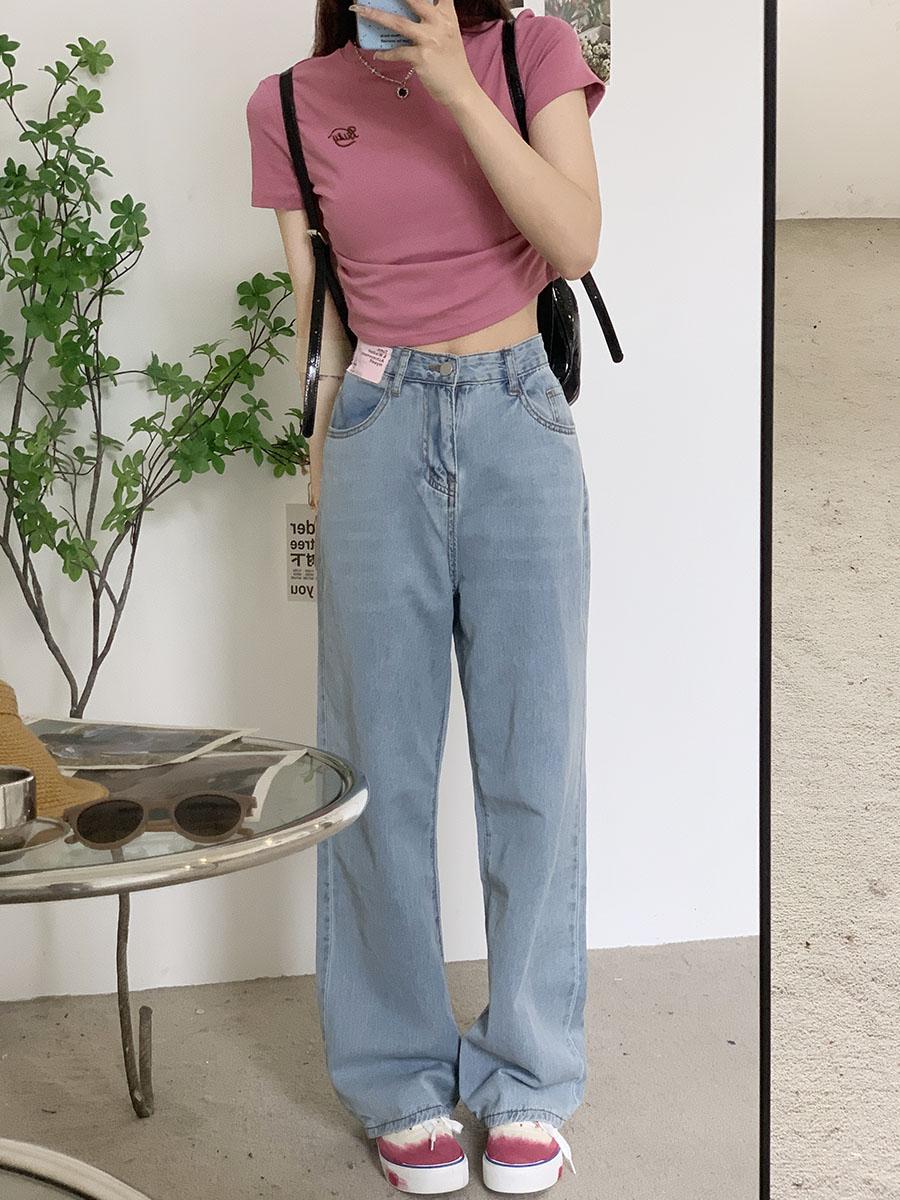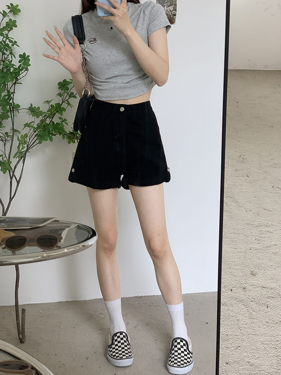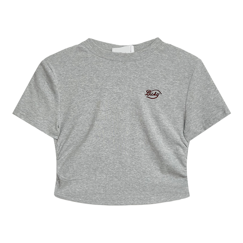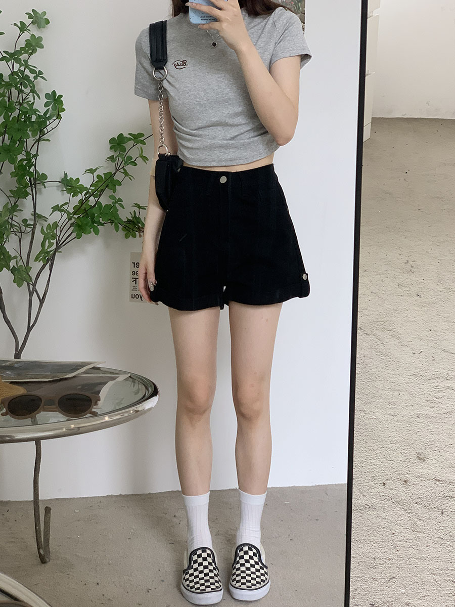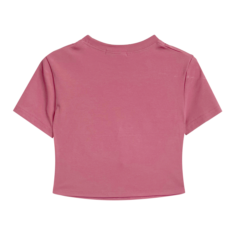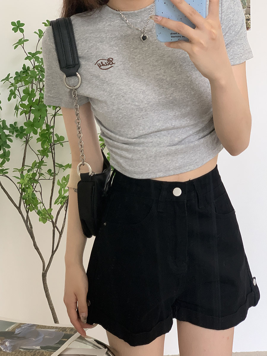 RENA美式休閒小字母刺繡百搭壓褶收腰顯瘦舒適彈力棉短款正肩T恤