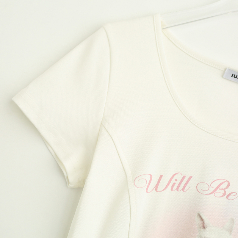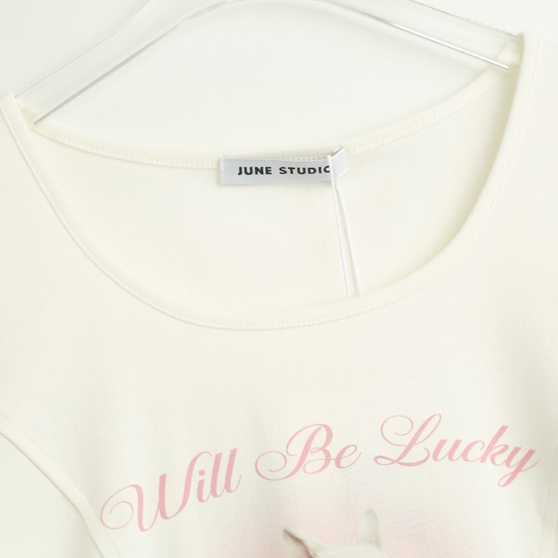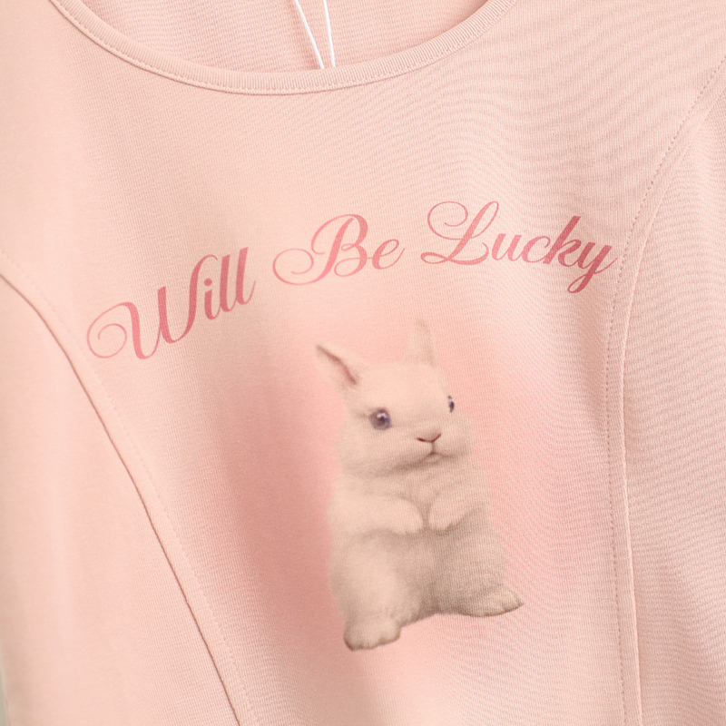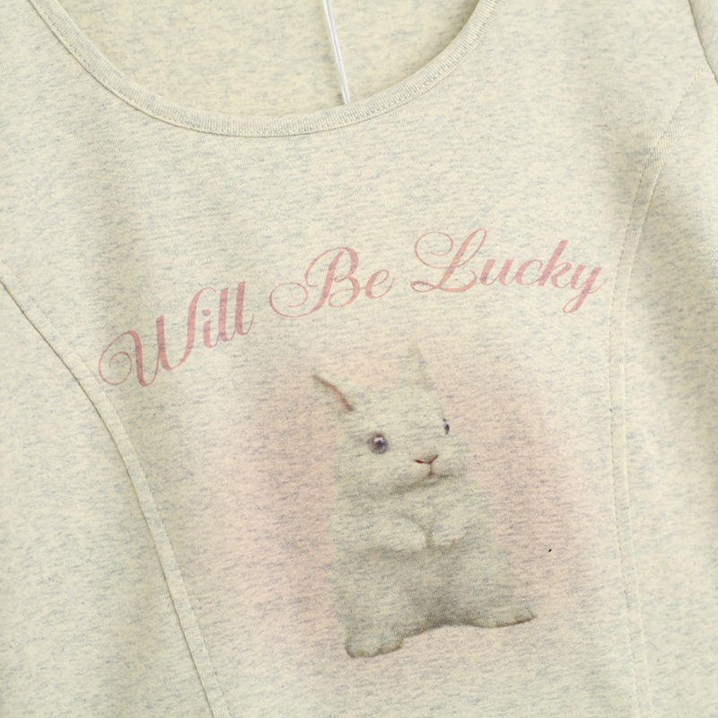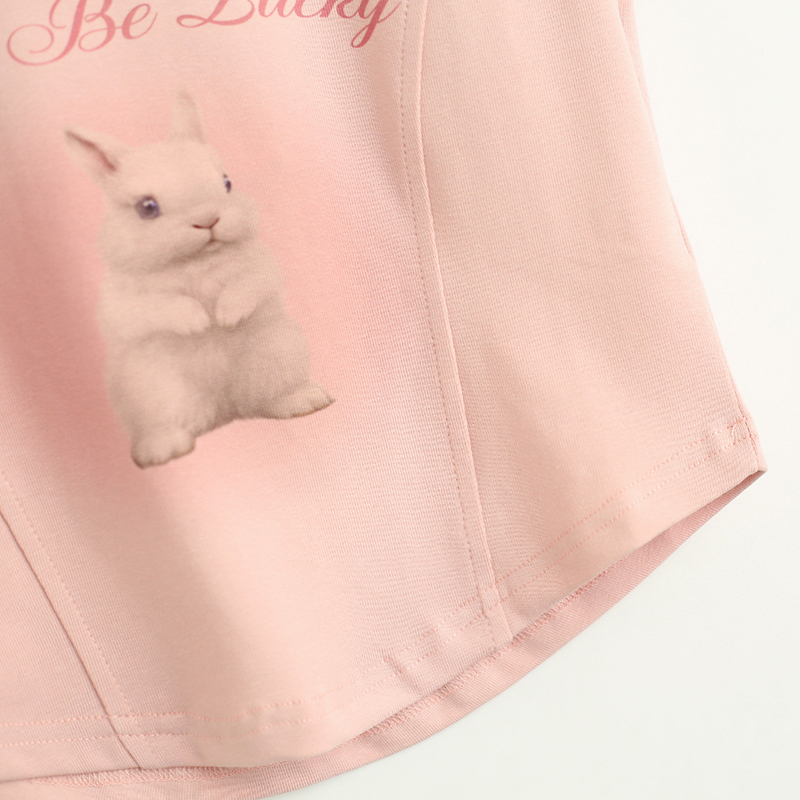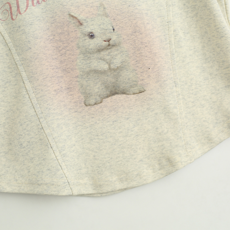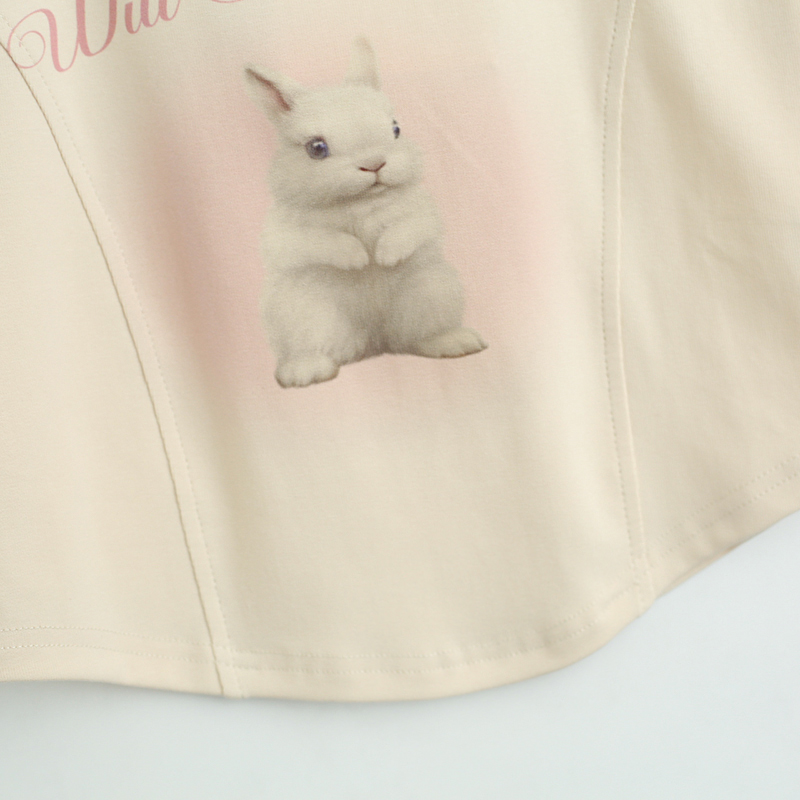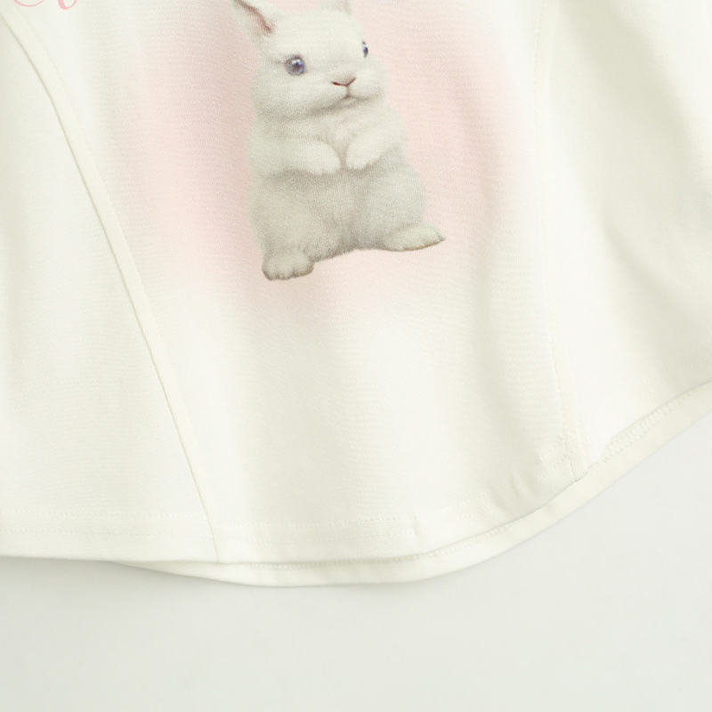 拾野森 夏裝新款bm風純欲短款魚骨弧形兔子印花U領短袖T恤女上衣