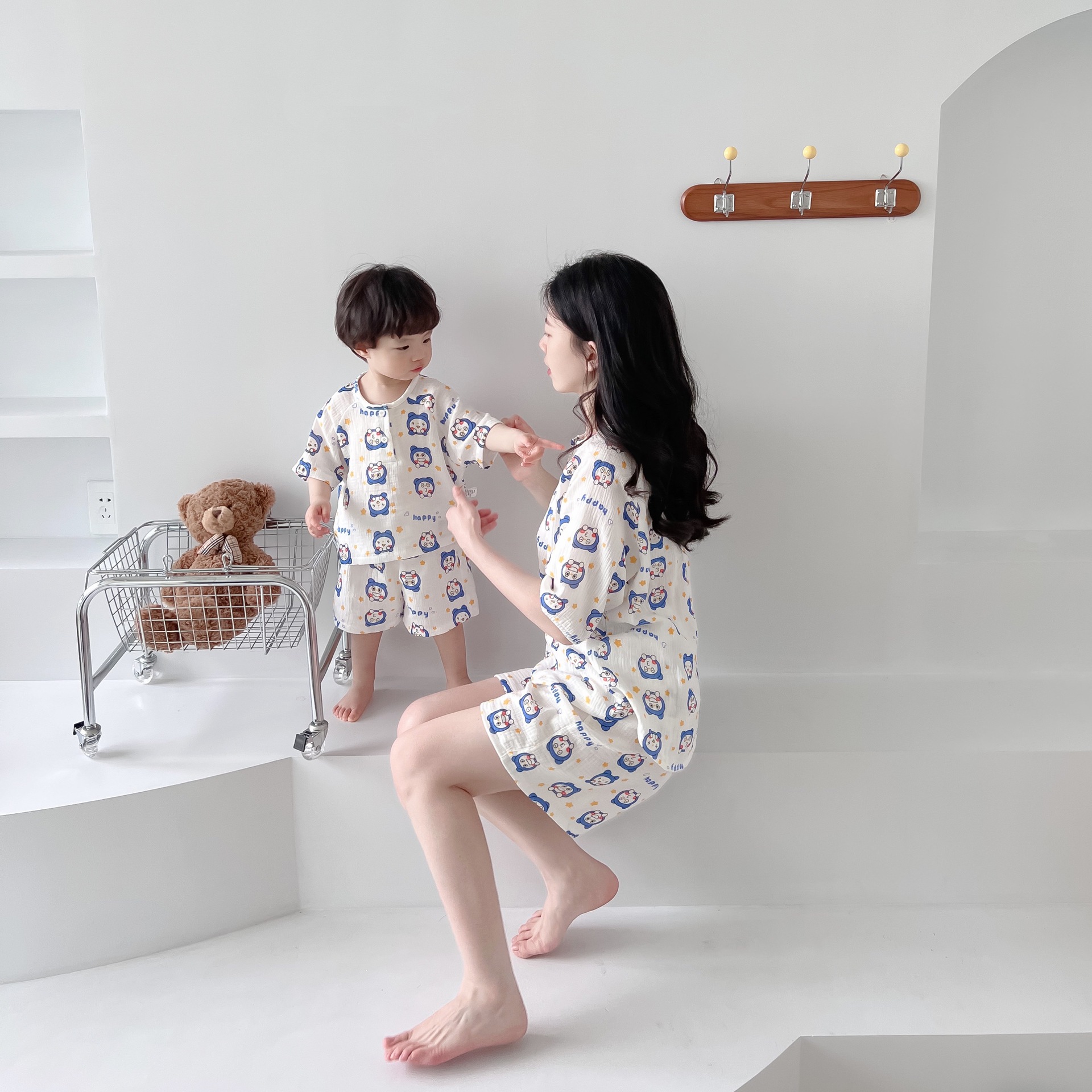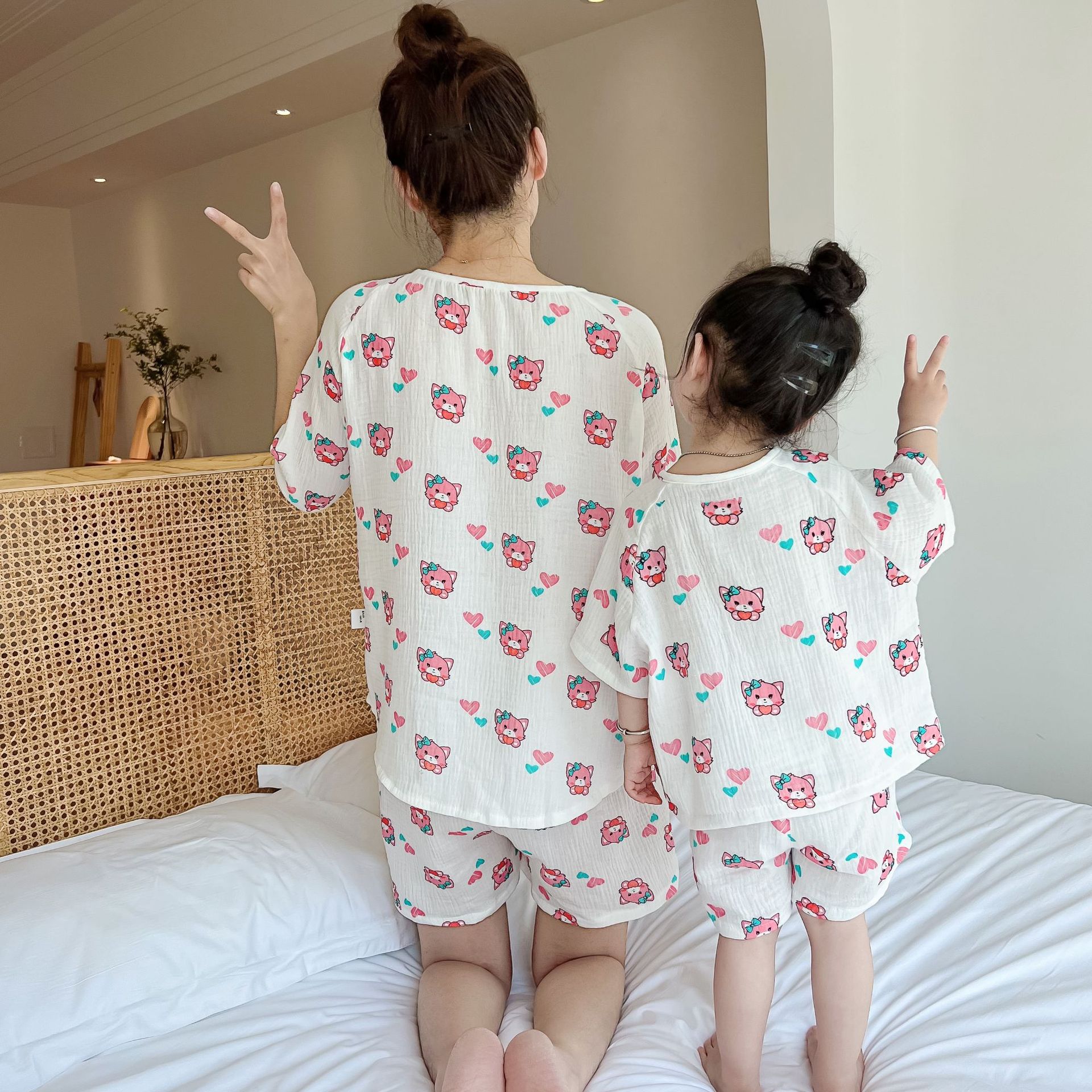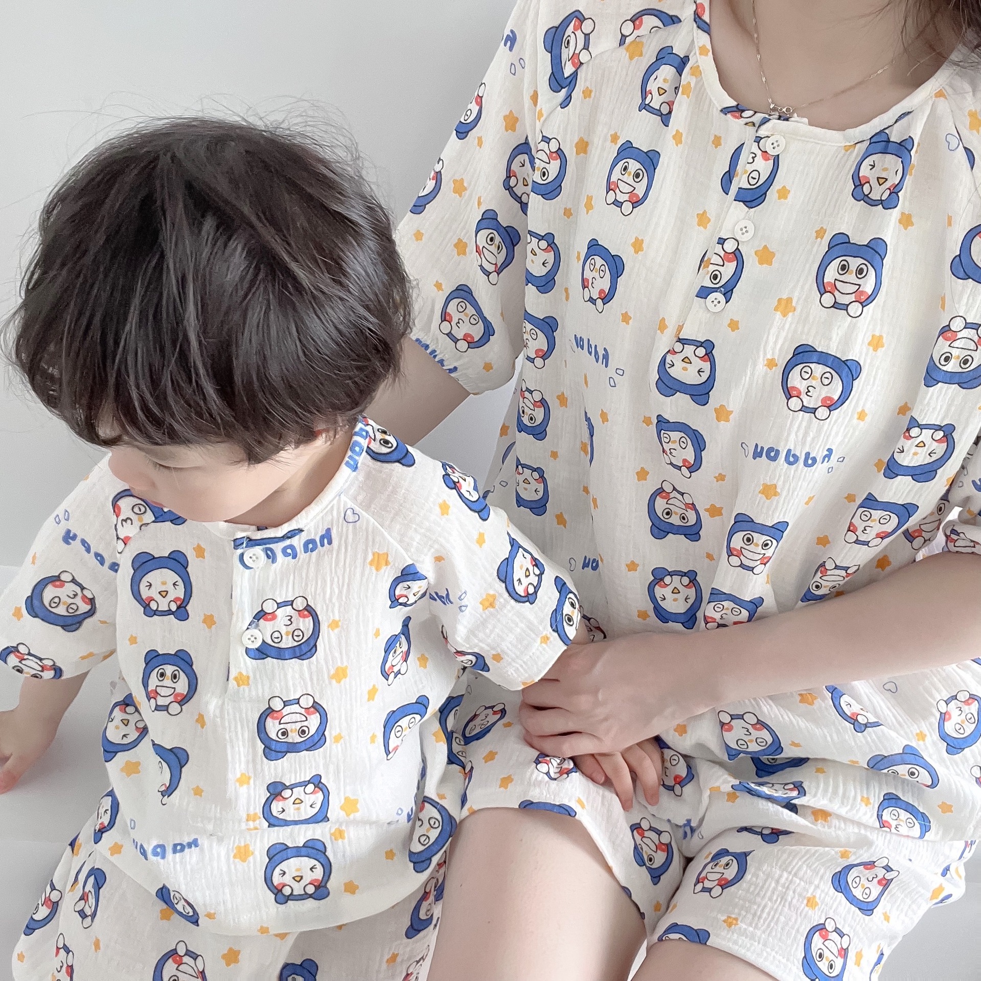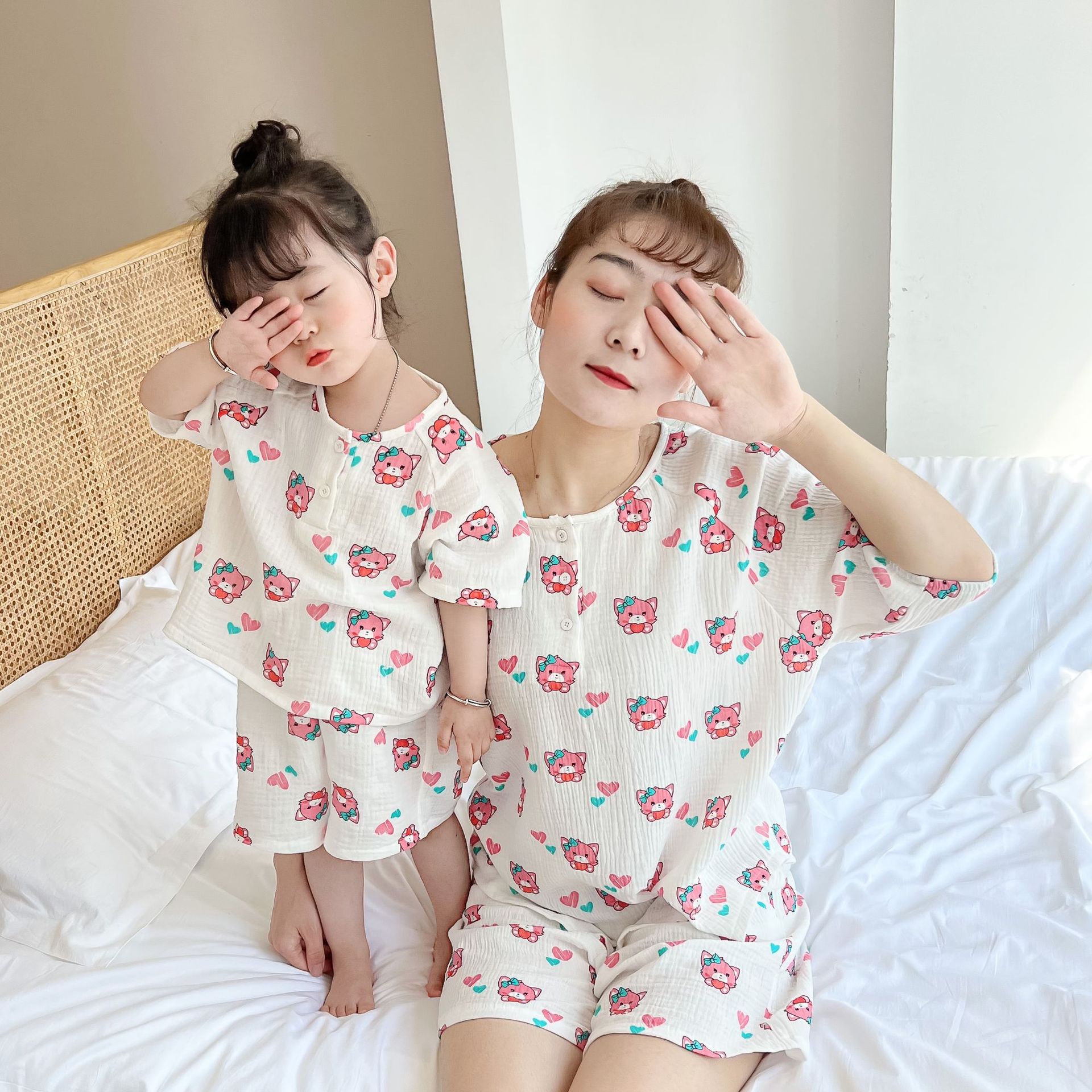 2022夏季新款 亲子双层棉纱水洗套装 妈妈款短袖短裤空调房睡衣
