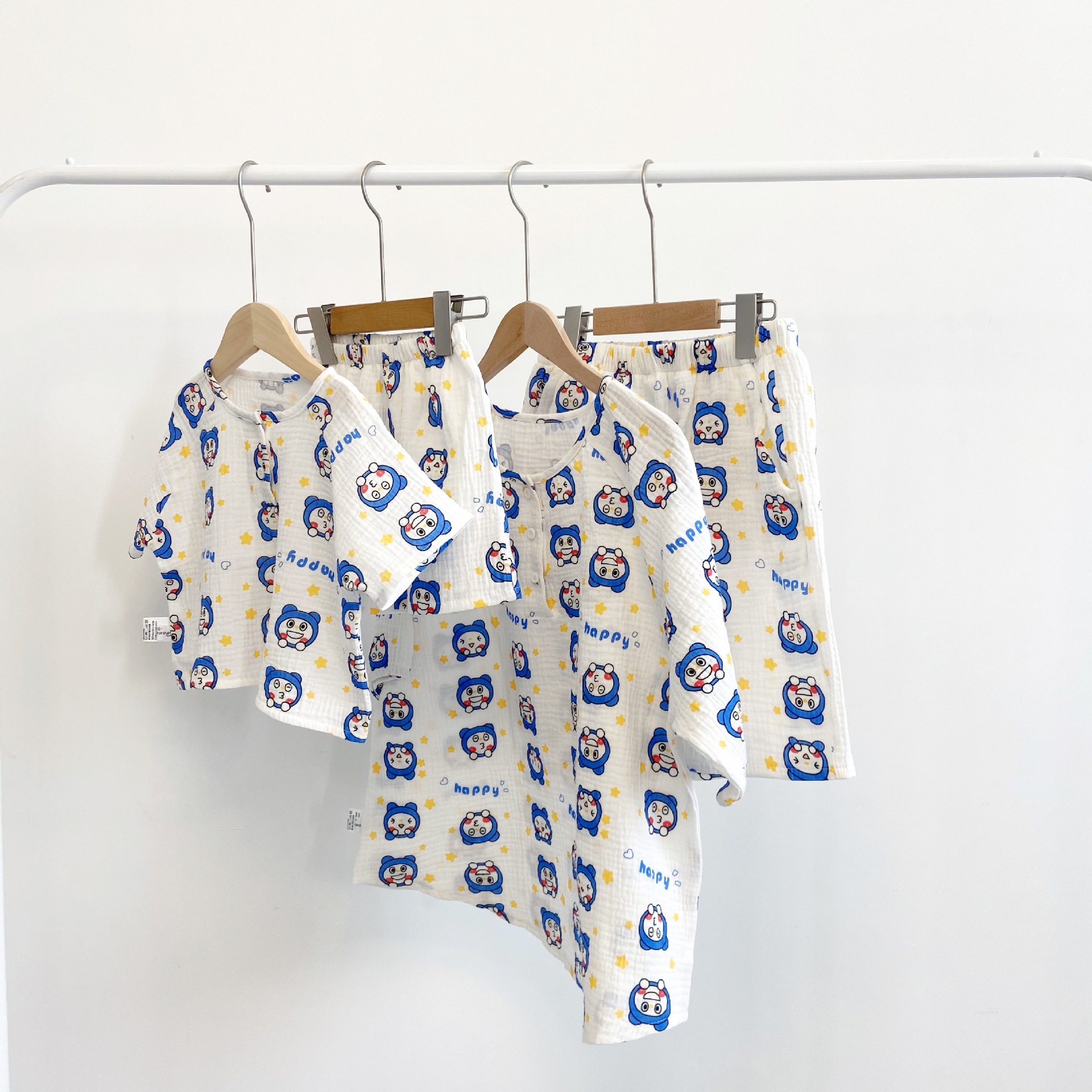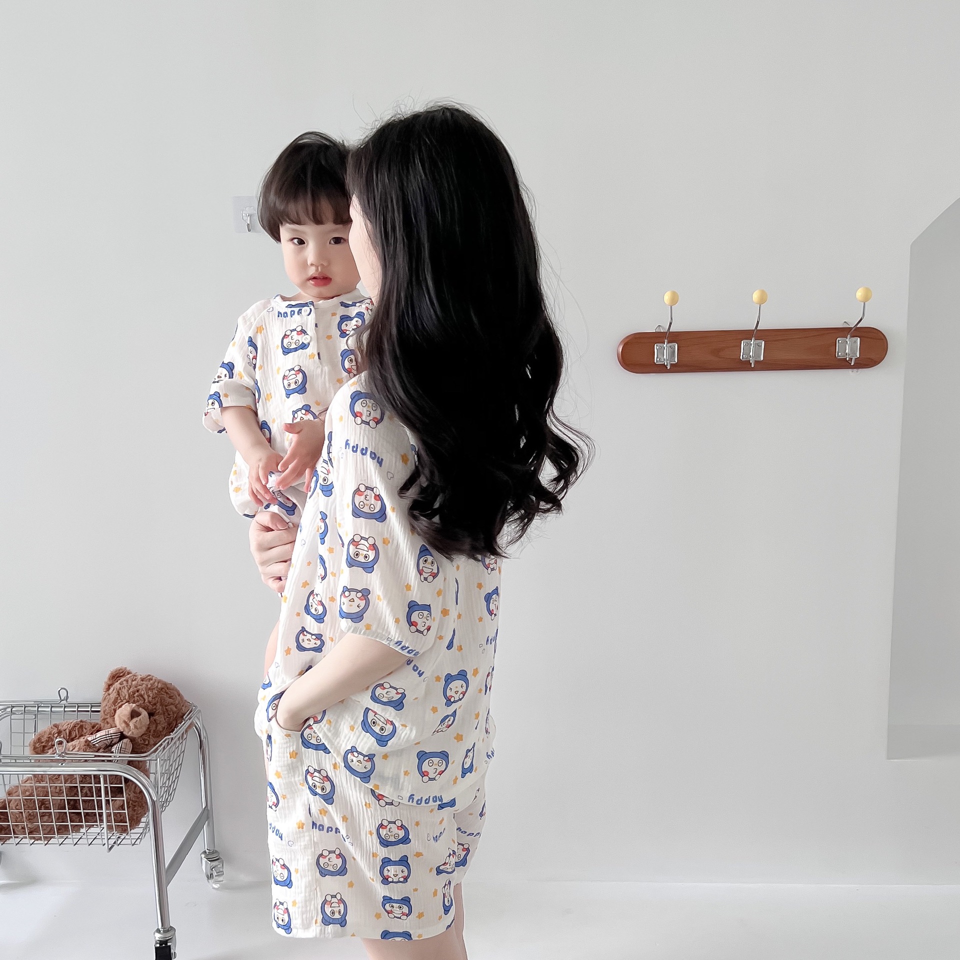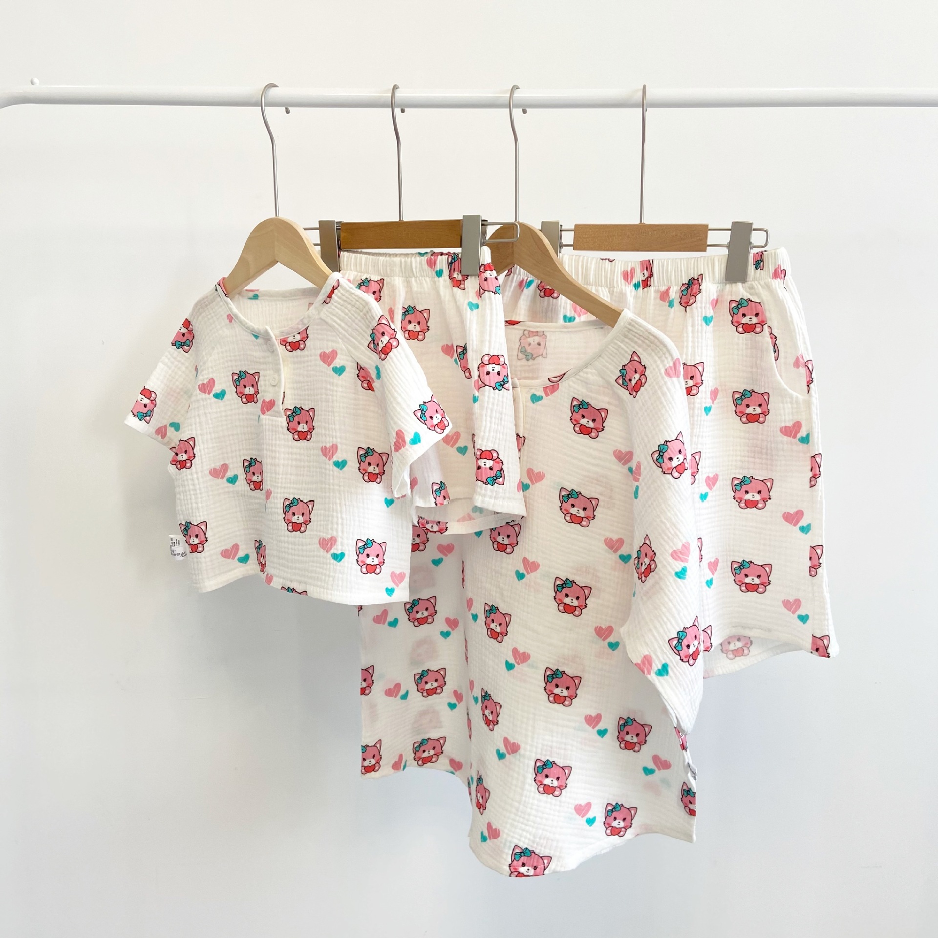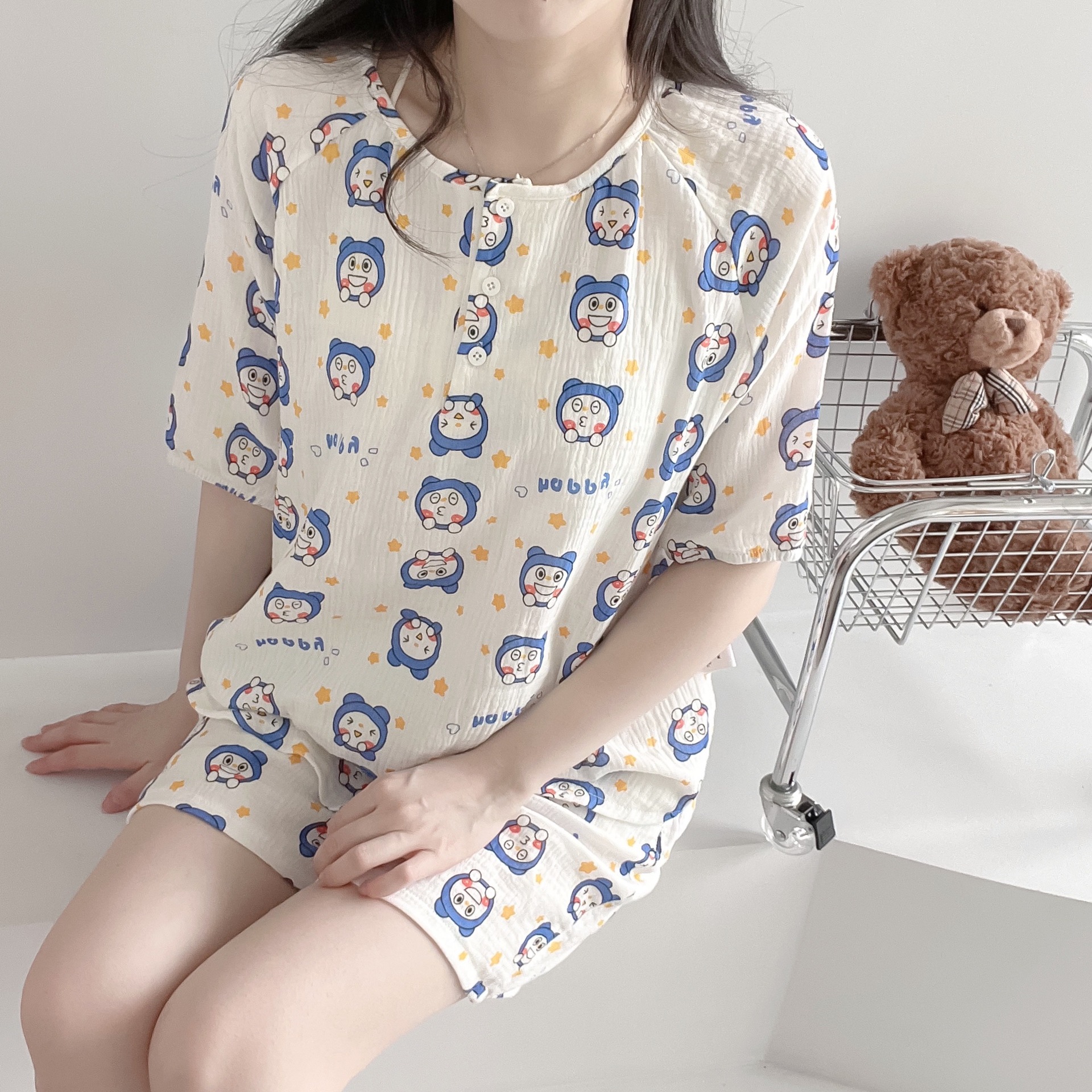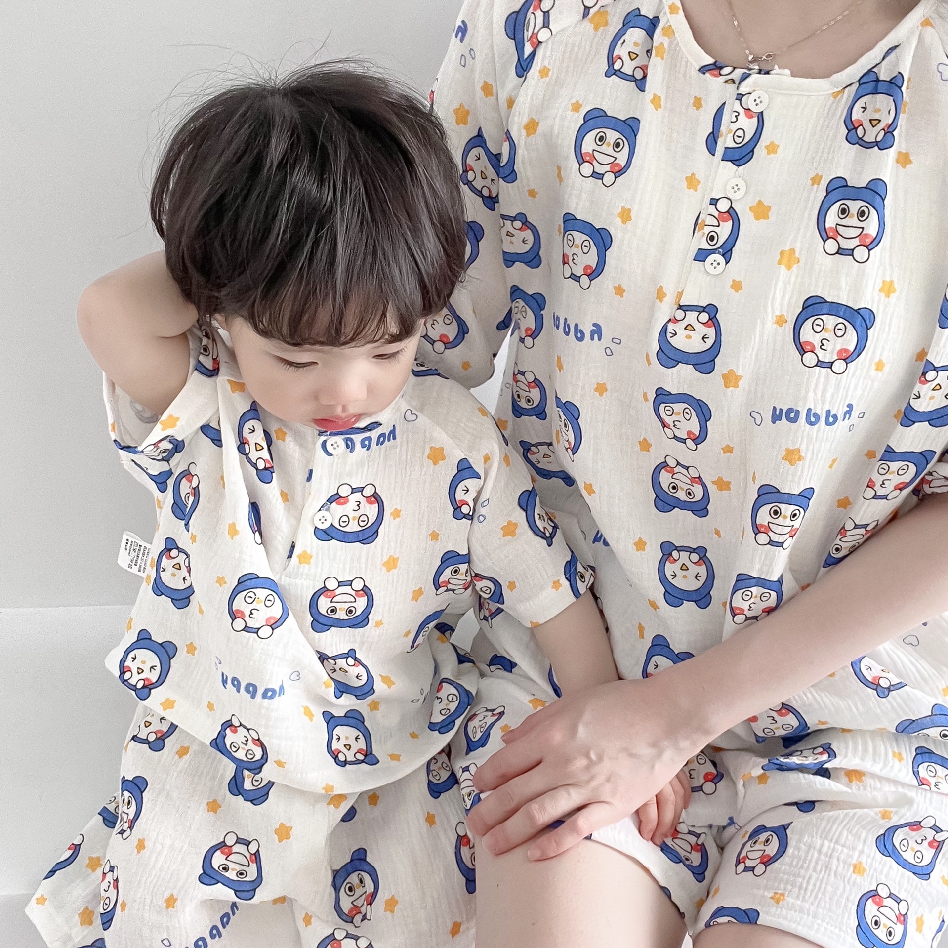 2022夏季新款 亲子双层棉纱水洗套装 妈妈款短袖短裤空调房睡衣