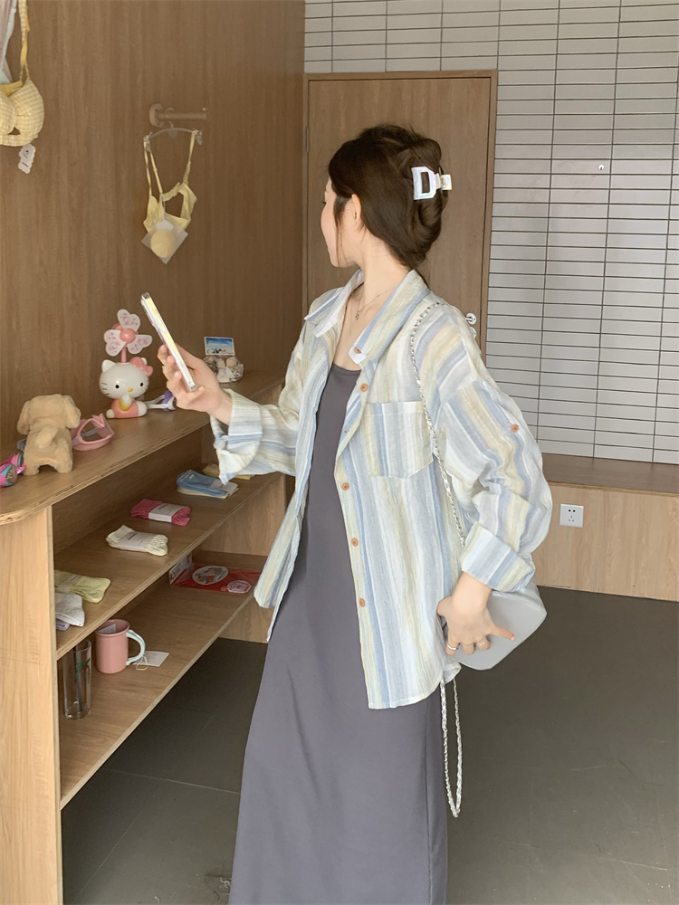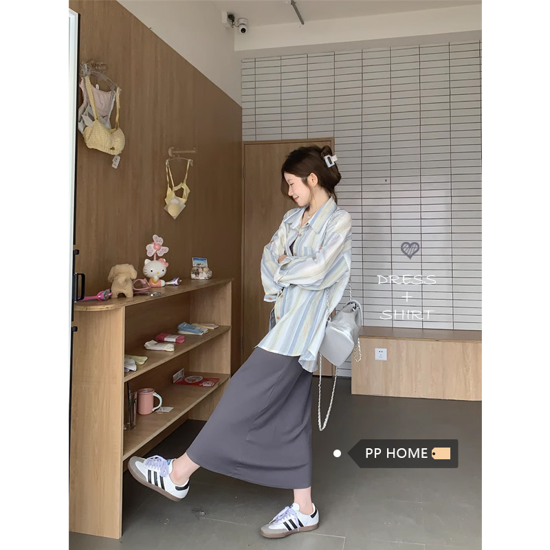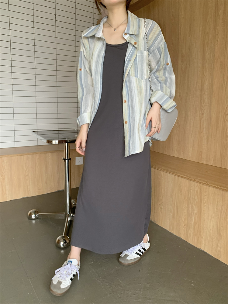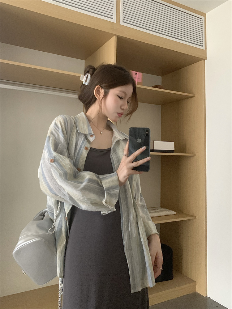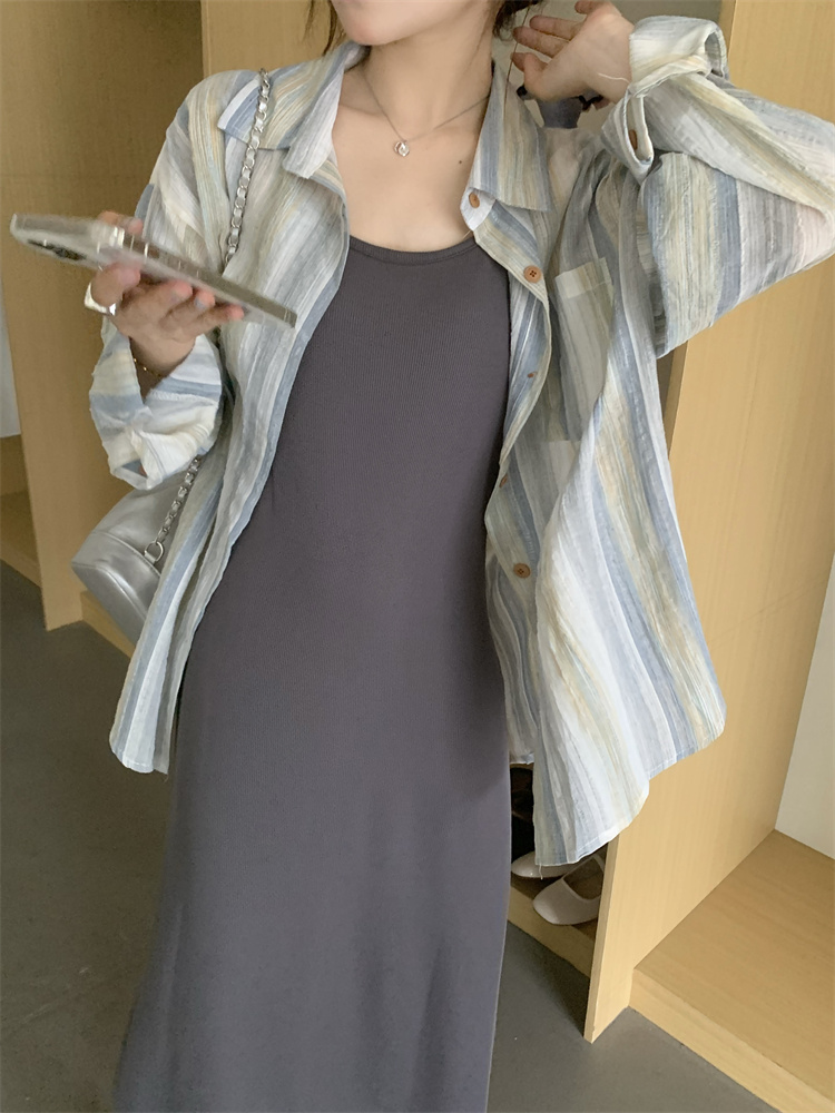 PPHOME清秀學姐~條紋防曬薄款襯衫外套女+針織吊帶修身洋裝套裝