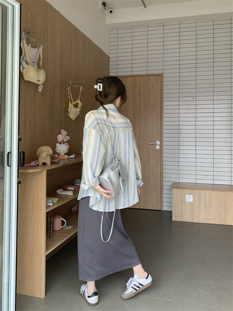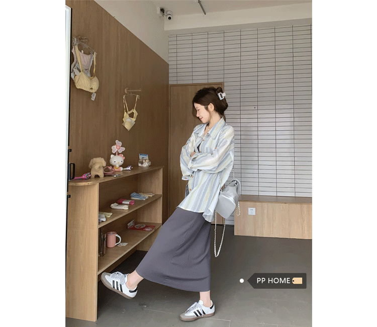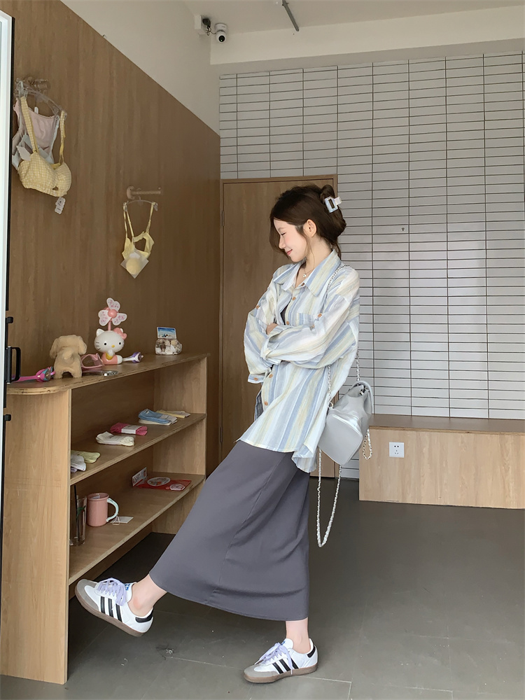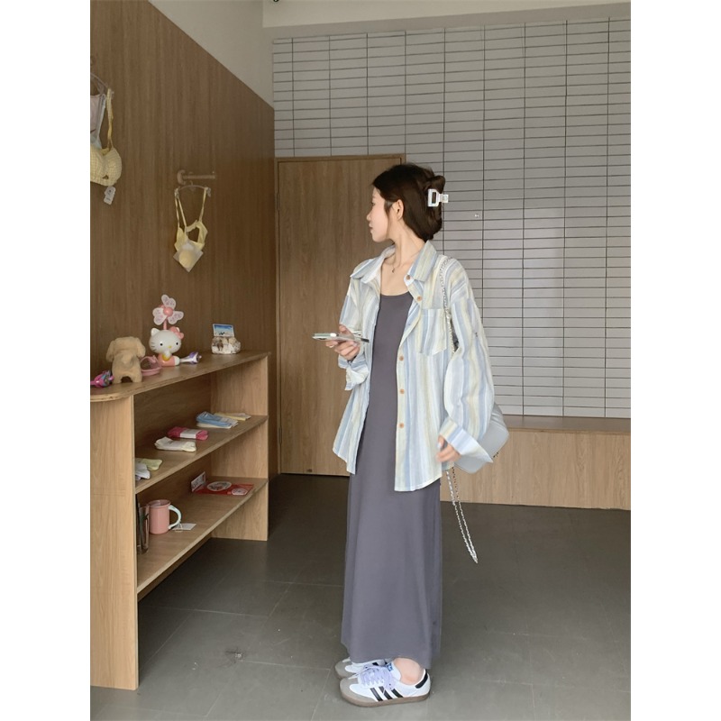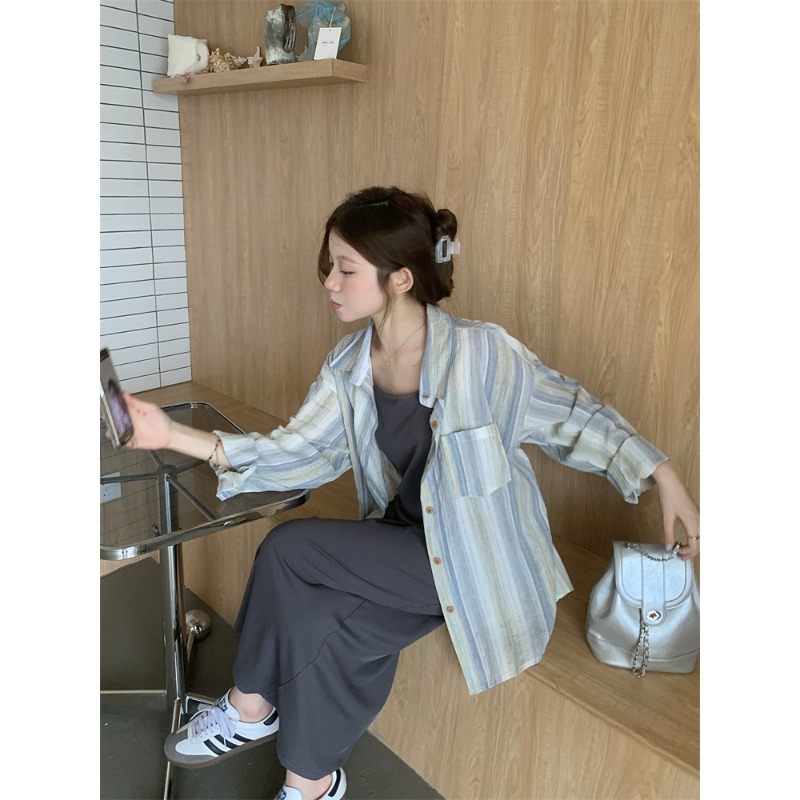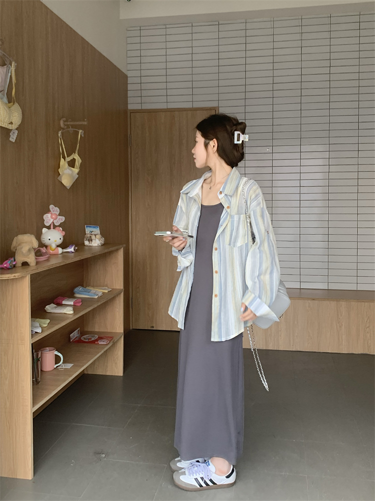 PPHOME清秀學姐~條紋防曬薄款襯衫外套女+針織吊帶修身洋裝套裝