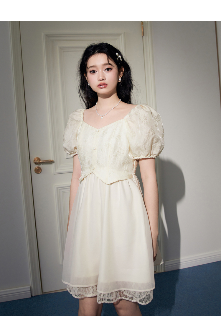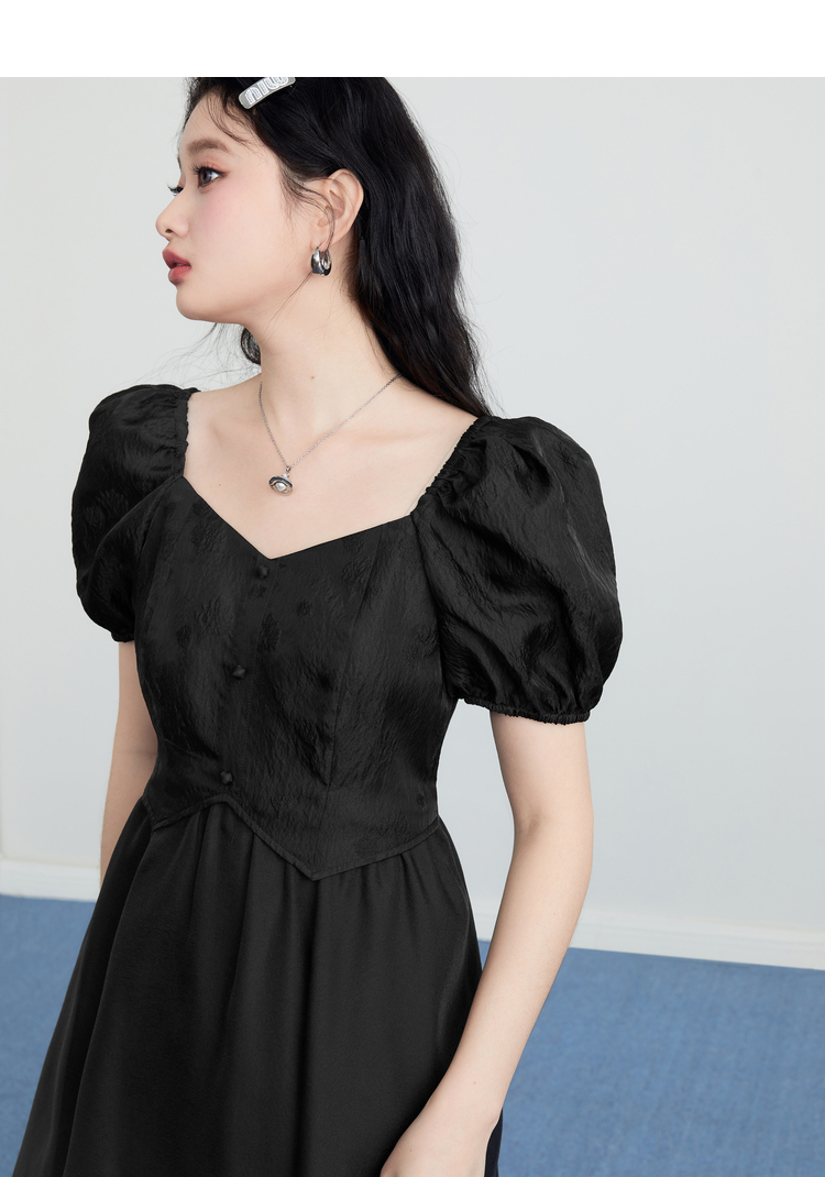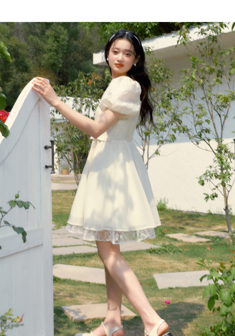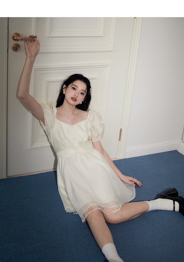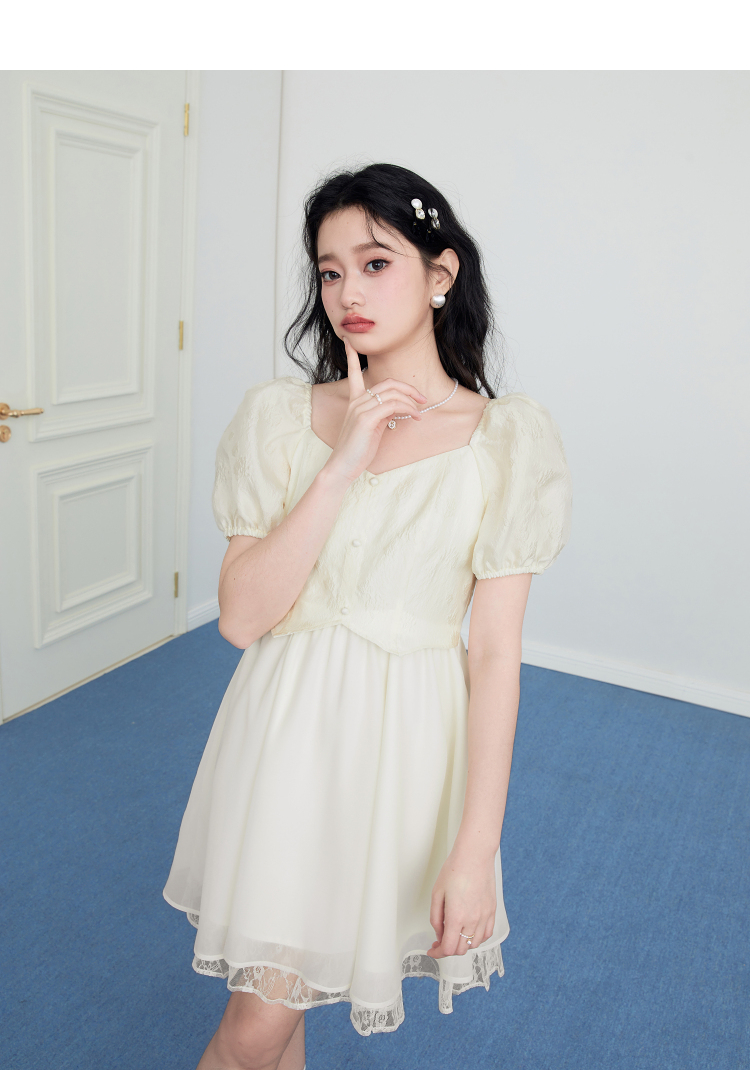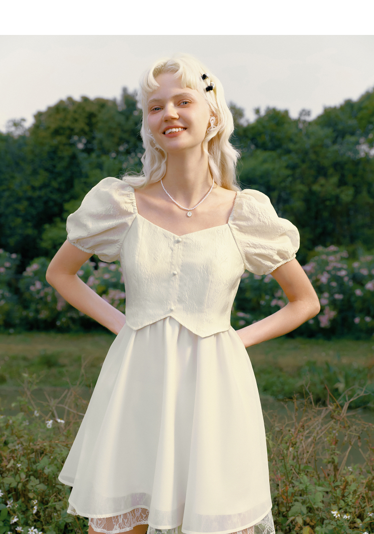 樂町甜美收腰洋裝2023年夏季新款方領泡泡袖法式茶歇在逃公主裙