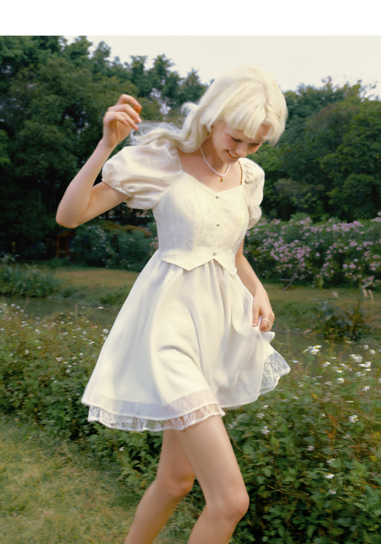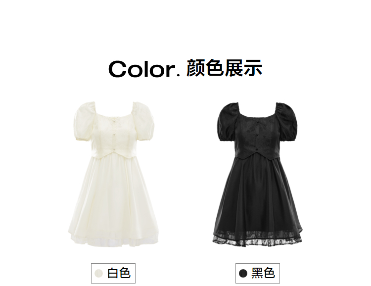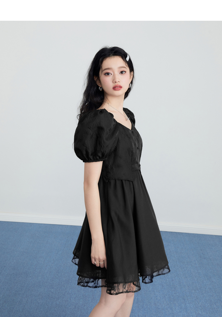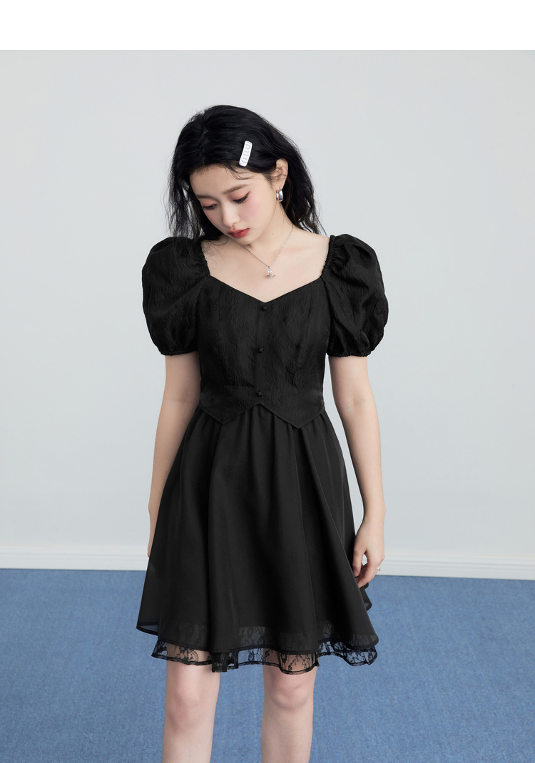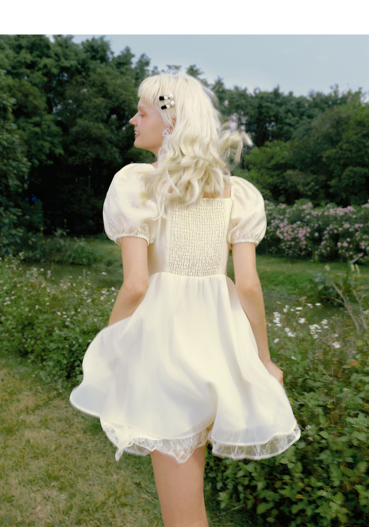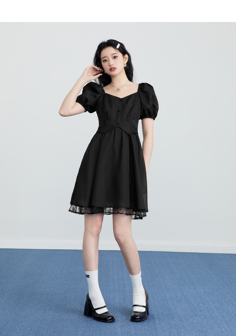 樂町甜美收腰洋裝2023年夏季新款方領泡泡袖法式茶歇在逃公主裙