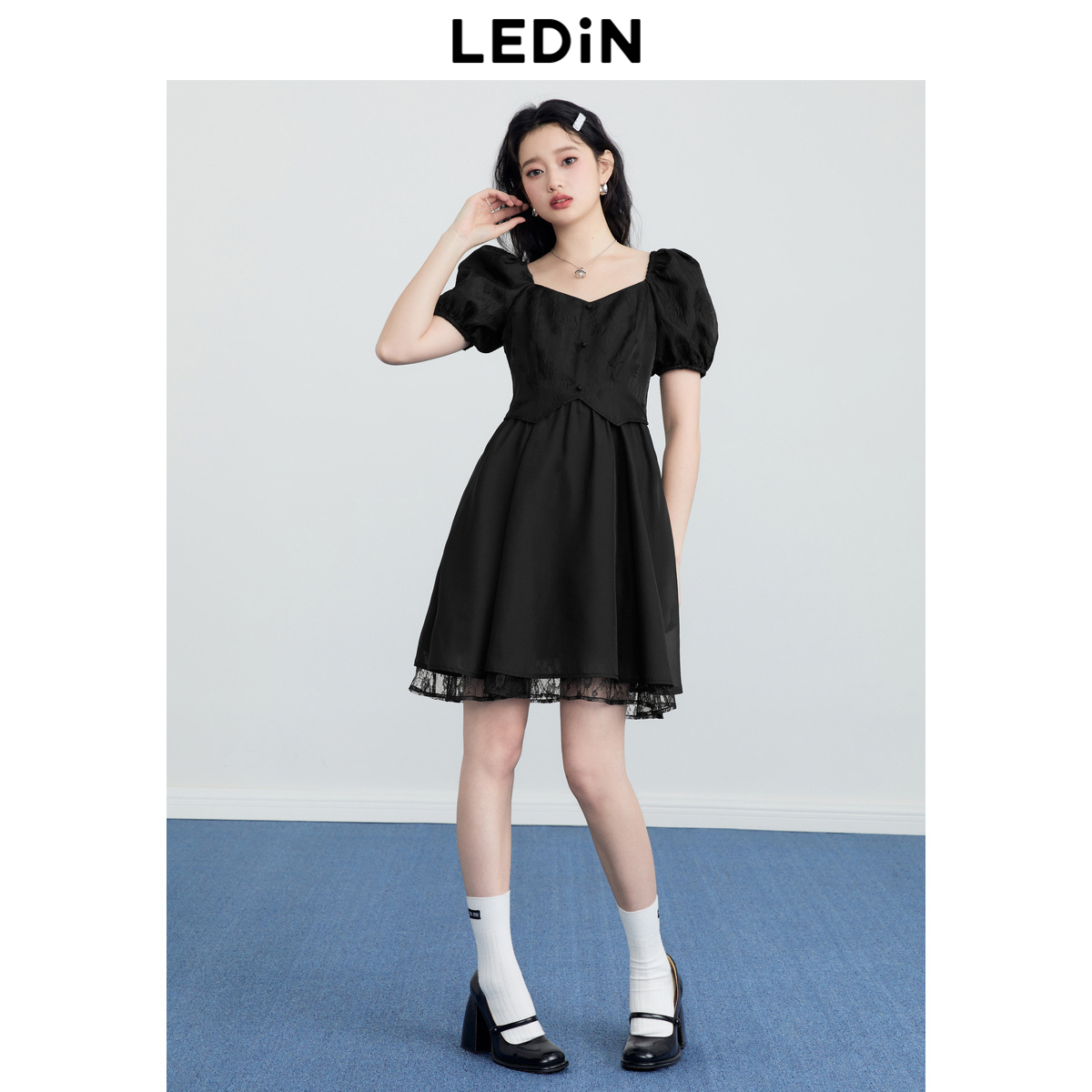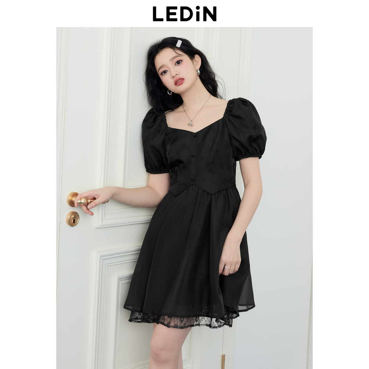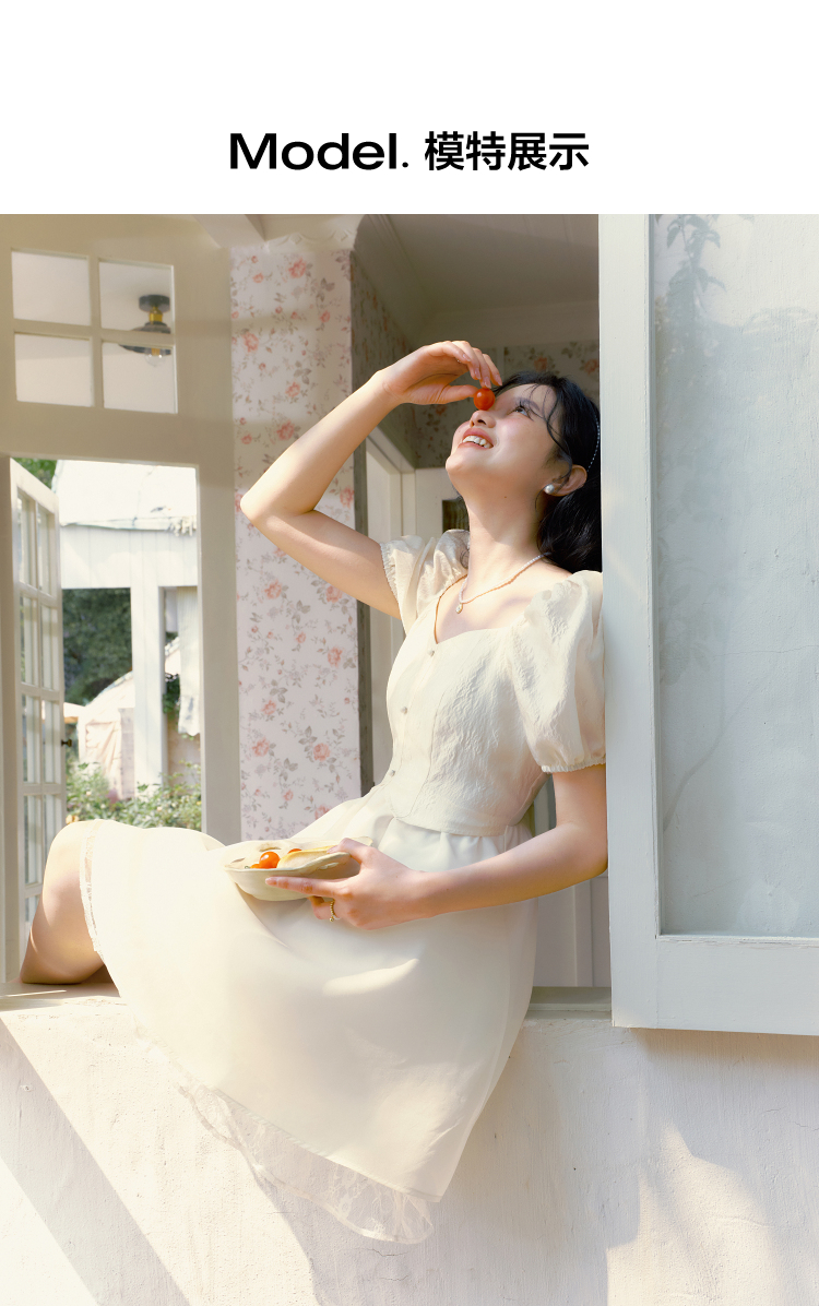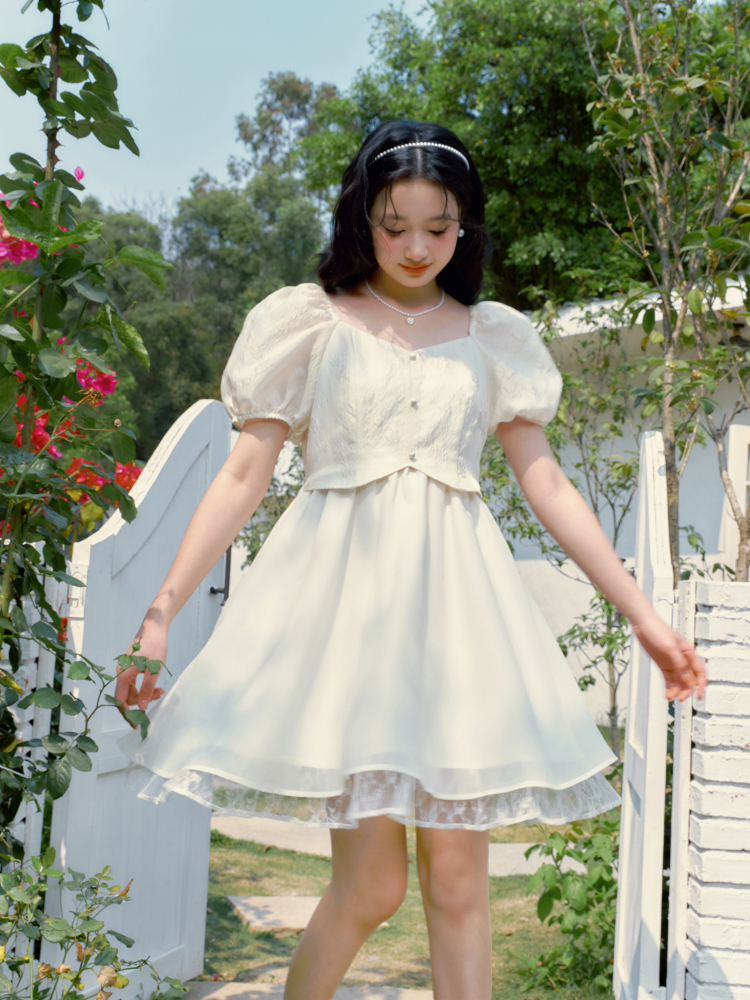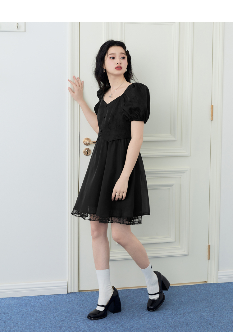 樂町甜美收腰洋裝2023年夏季新款方領泡泡袖法式茶歇在逃公主裙