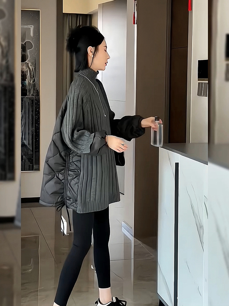 法式慵懶古著vintage高領深灰色拼接棉服毛衣加厚設計感小眾女冬