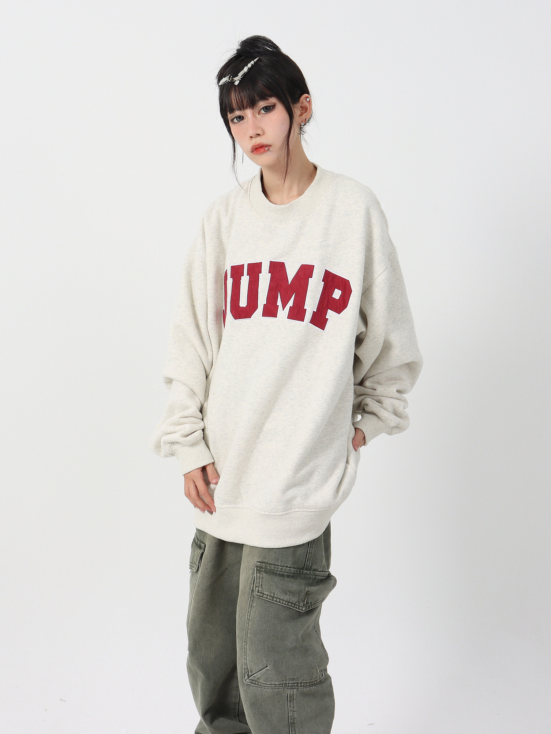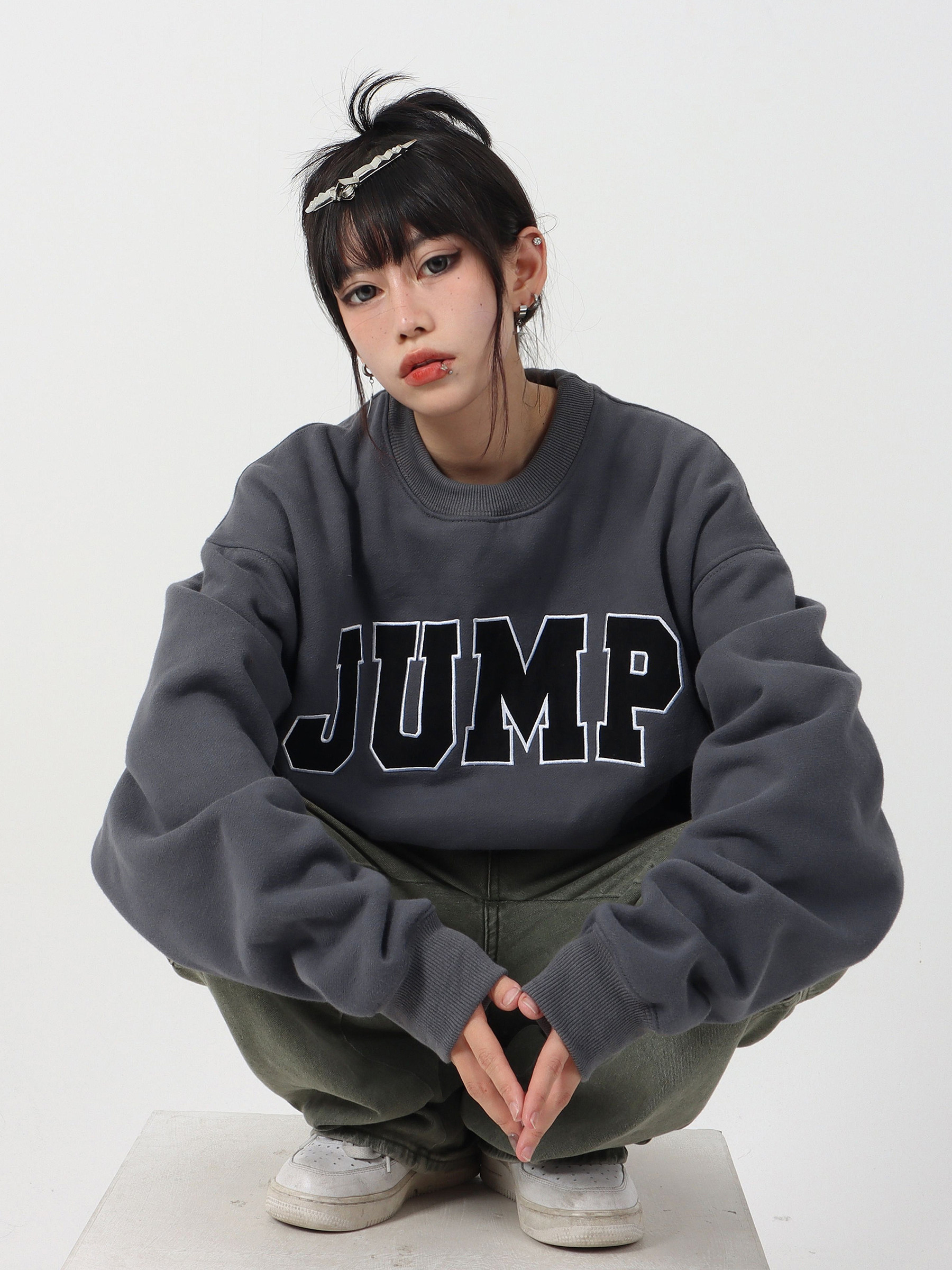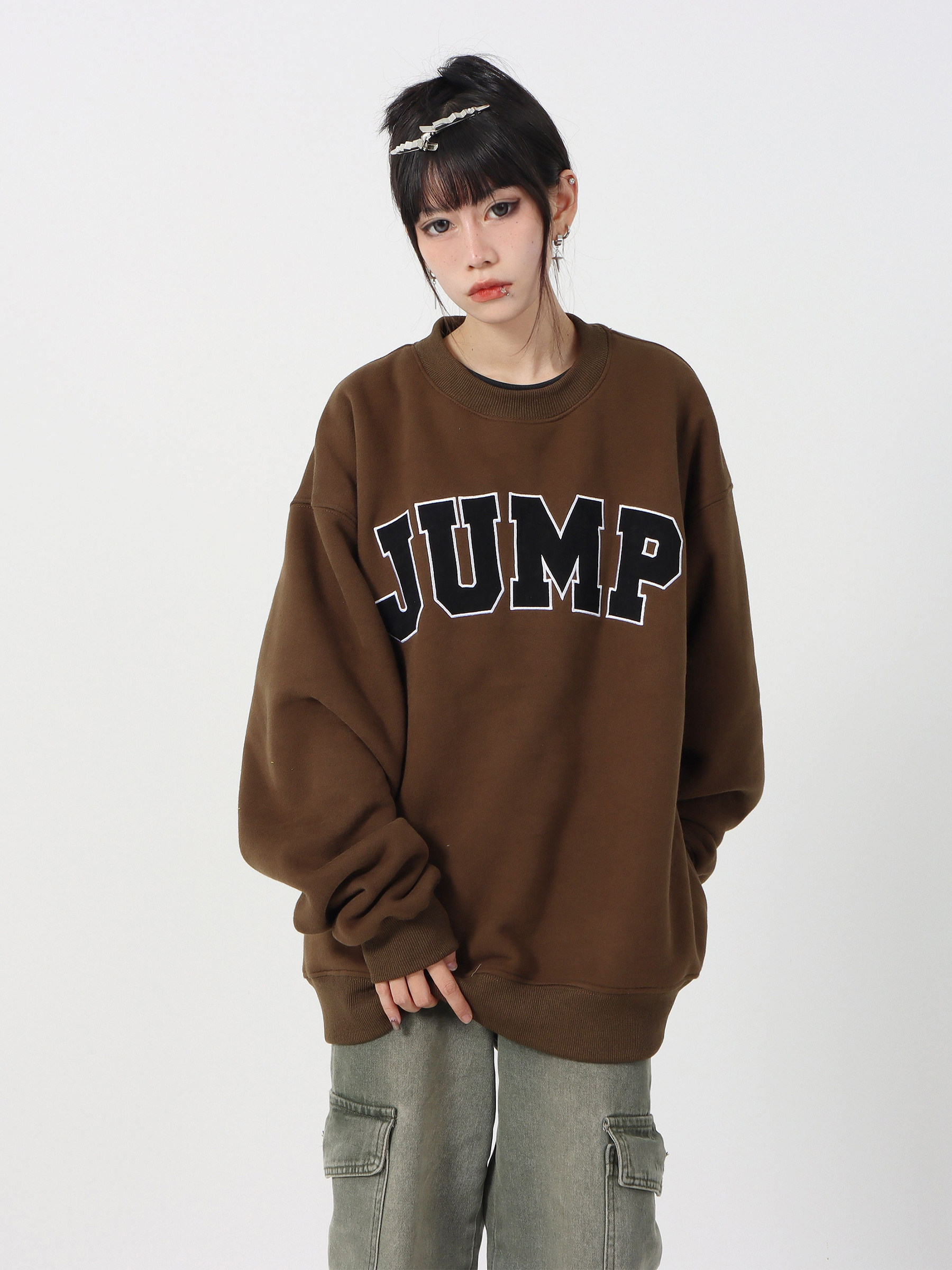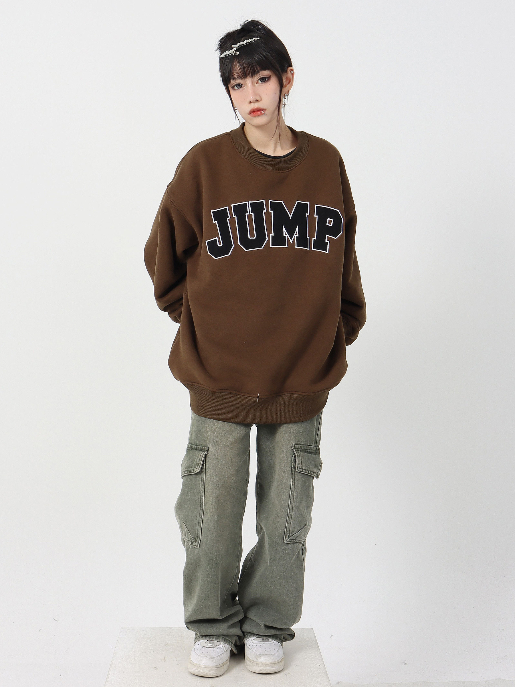 JUMPNEXT國潮牌美式復古麂皮絨布貼繡字母冬加絨寬鬆情侶圓領厚棉T