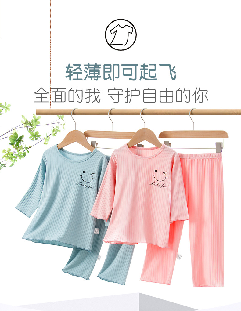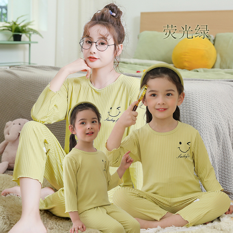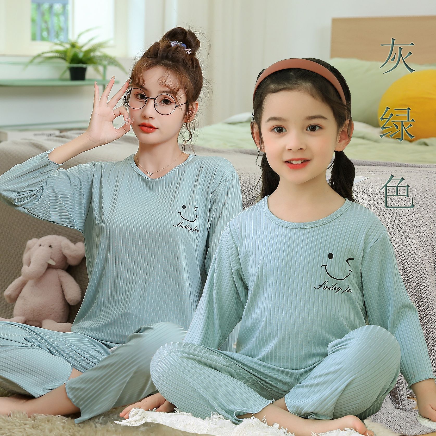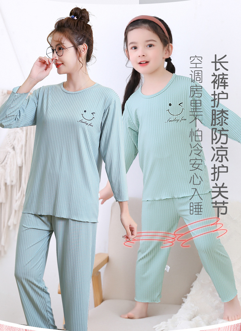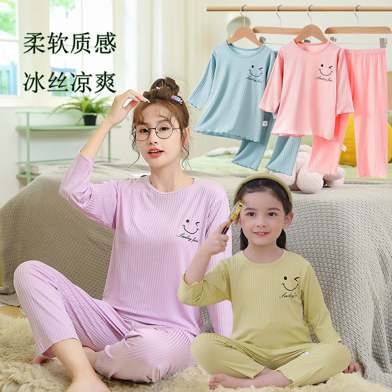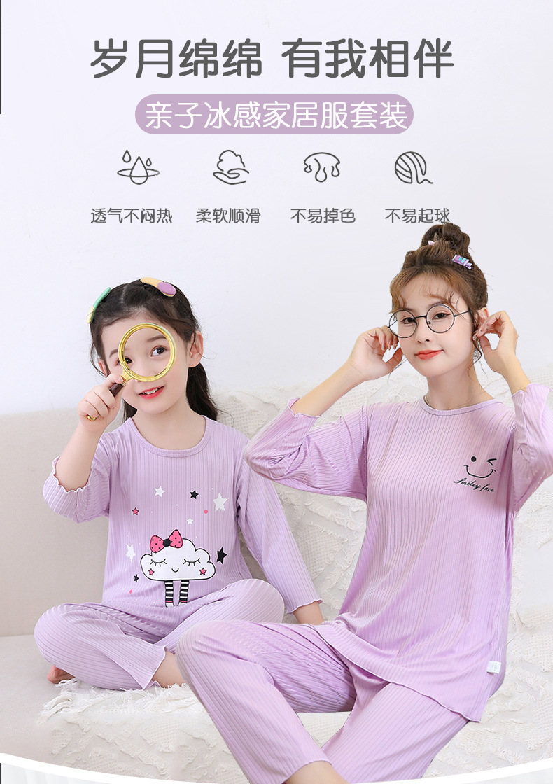 夏季亲子冰丝七分袖套装宝宝卡通透气空调服中大童长裤睡衣家居服