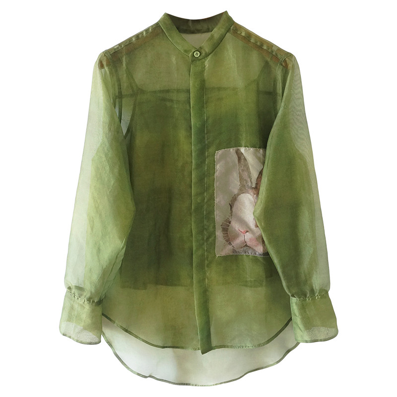大牌外貿出口撿漏2023綠色真絲歐根紗拼接卡通印花長袖襯衫配吊帶