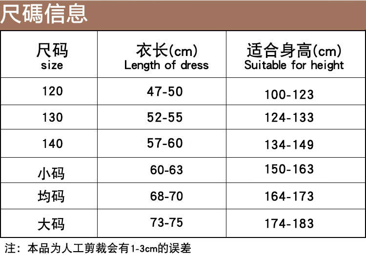 尺码 S,M,L,XL,XXL,XXXL,120【建议身高100~123】,130【建议身高124~133】,140【建议身高134~149】,小码【建议身高150~163】,均码 【建议身高164~173】,大码【建议身高174~185】