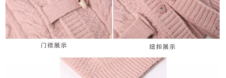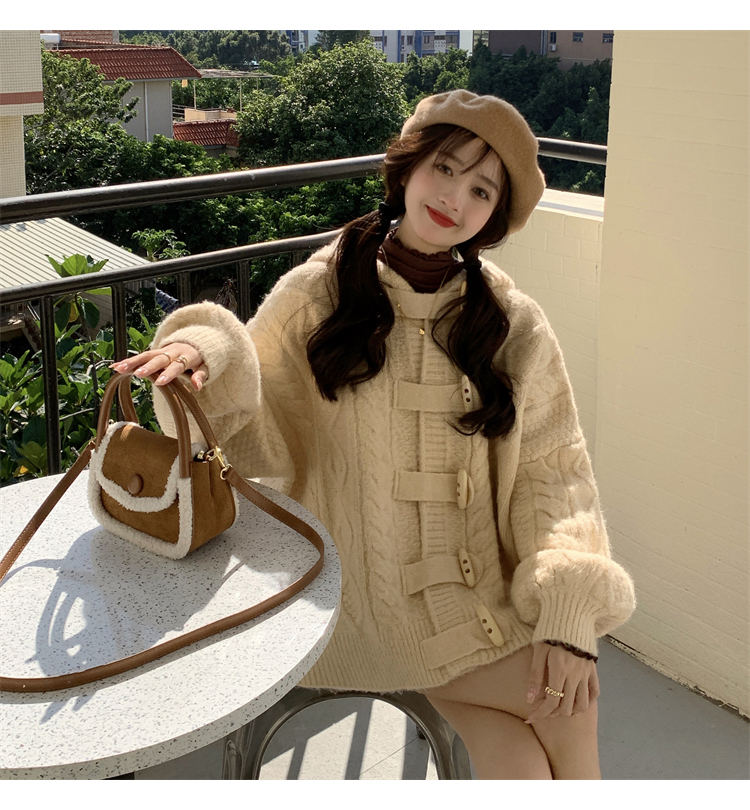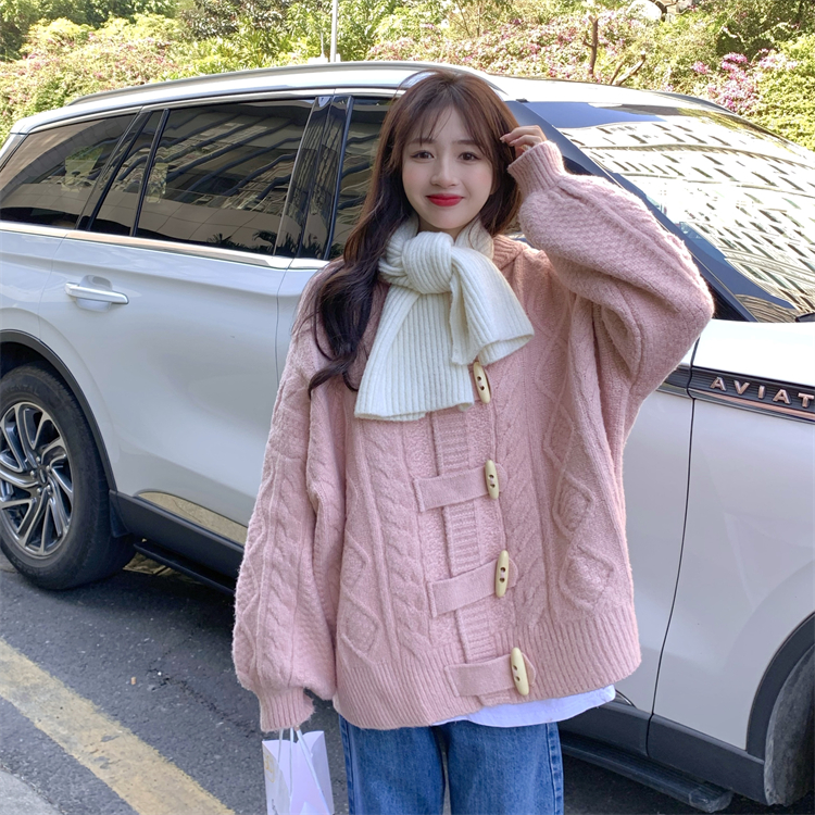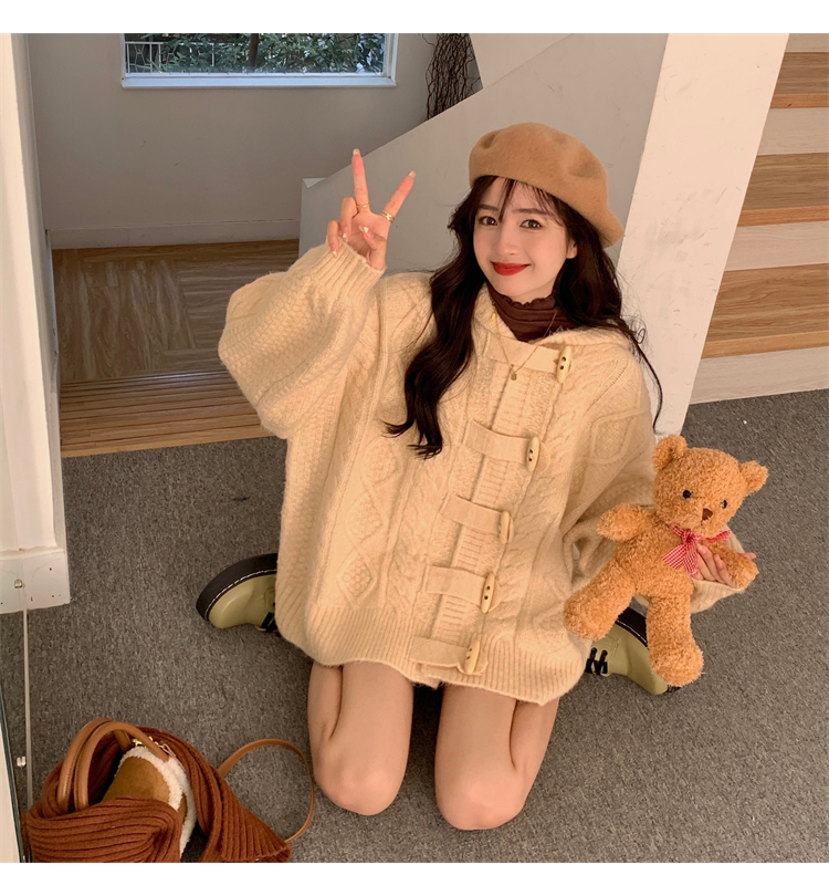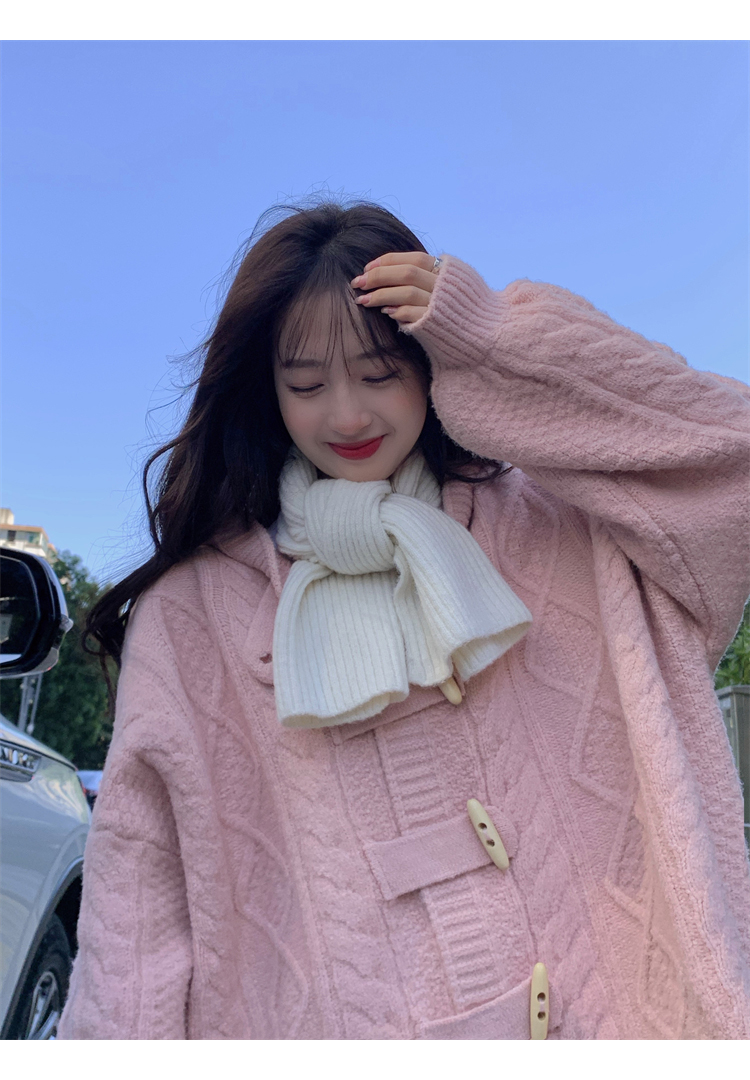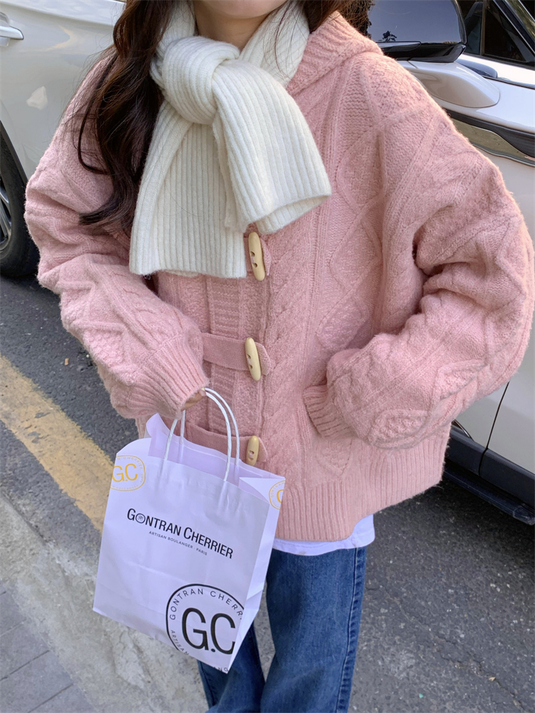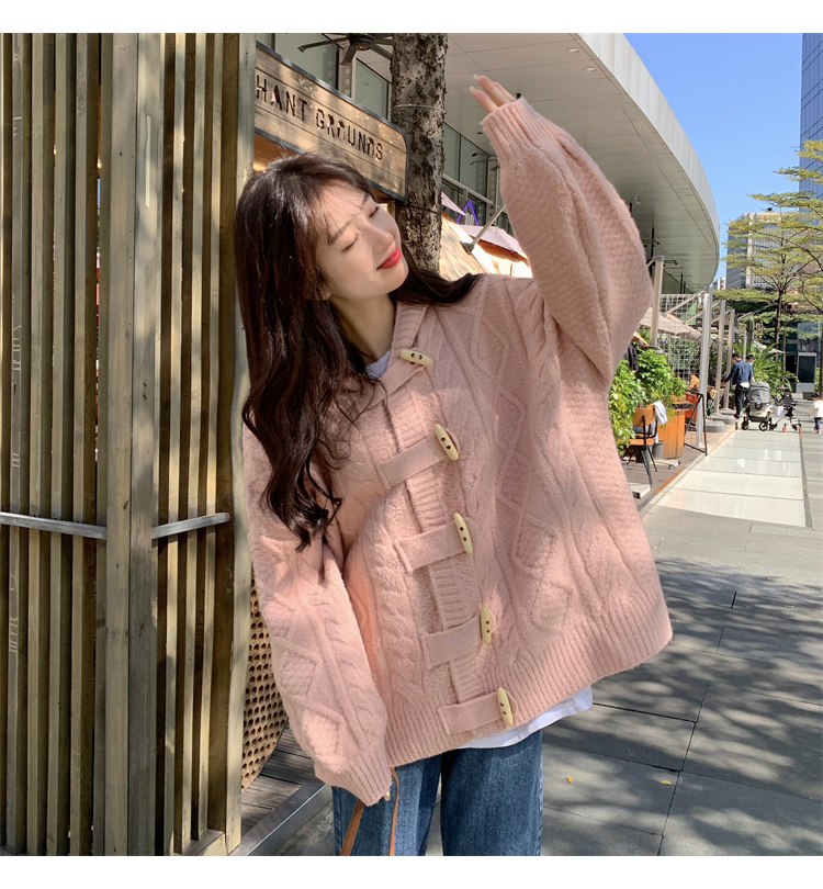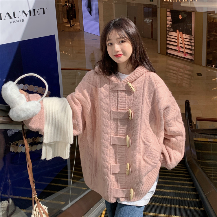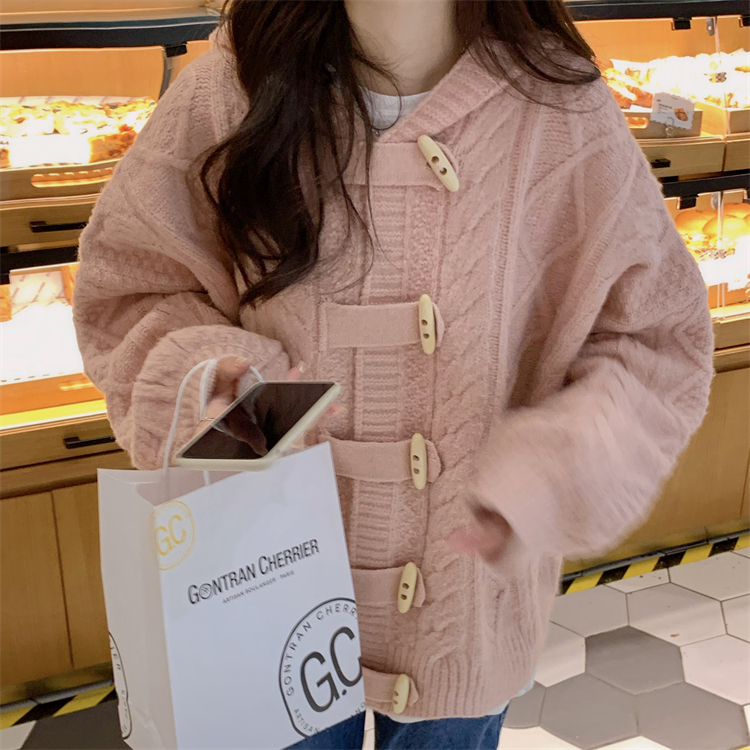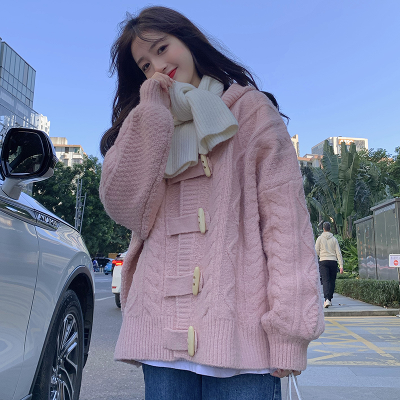 牛角扣連帽粉色毛衣開衫女秋冬軟糯溫柔甜美可愛慵懶寬鬆針織外套