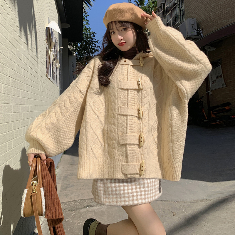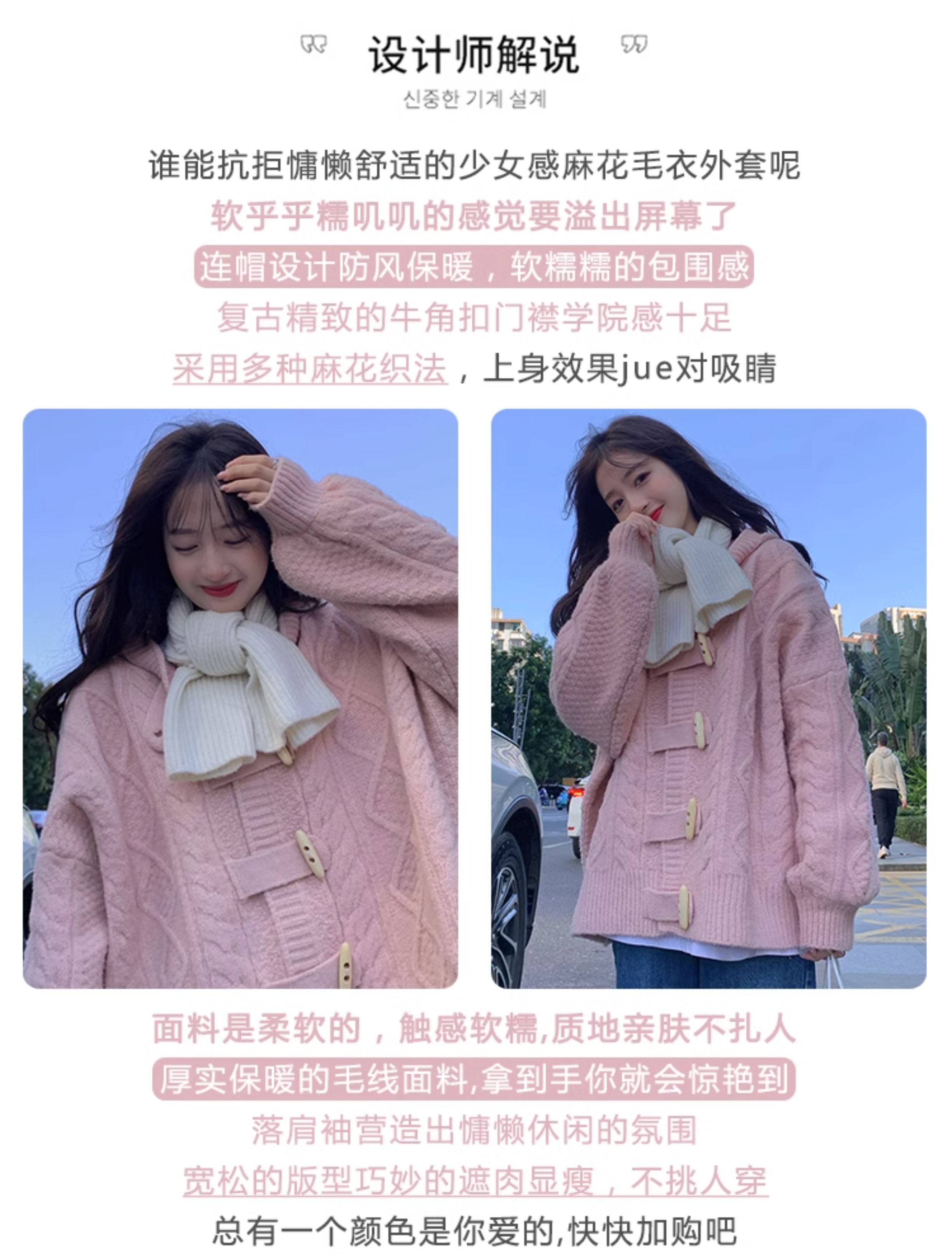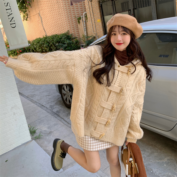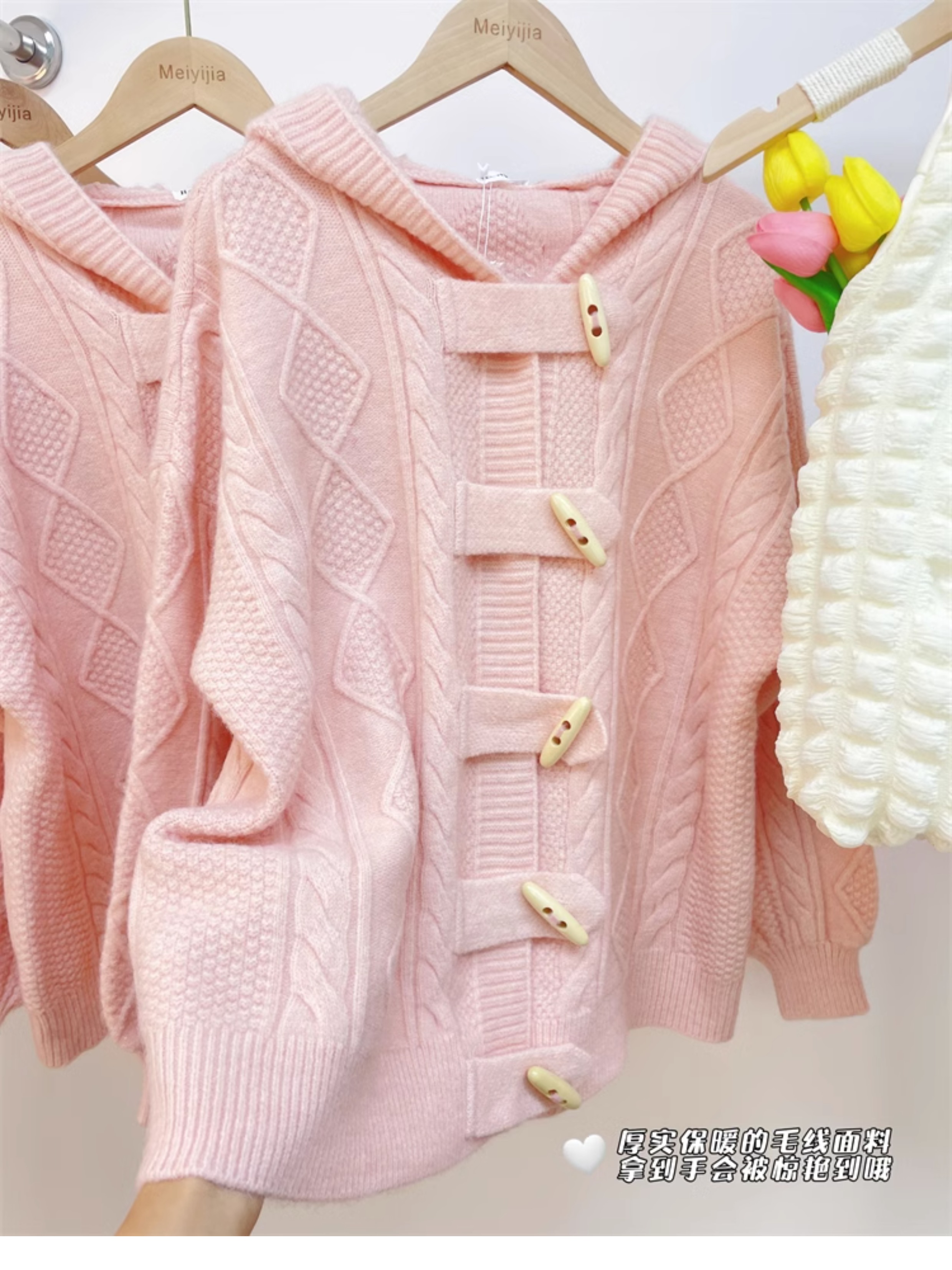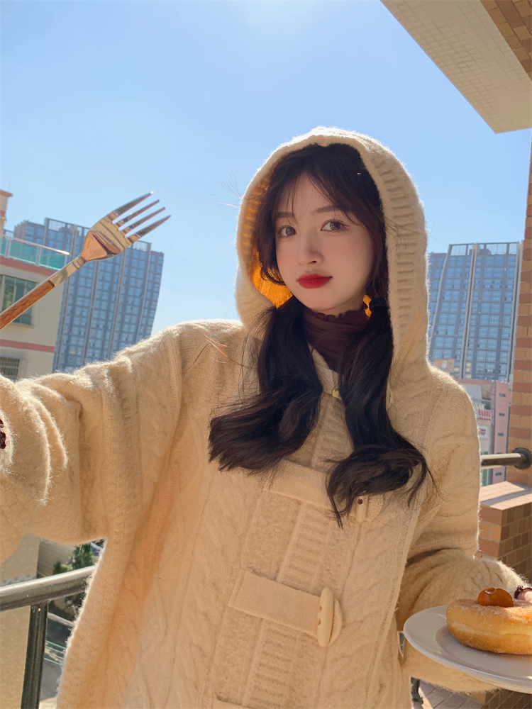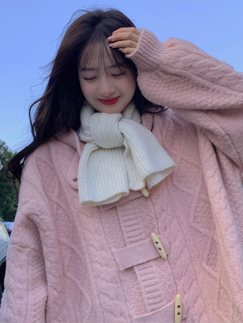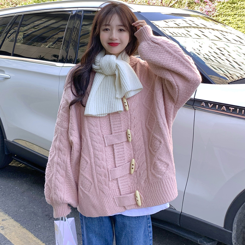 牛角扣連帽粉色毛衣開衫女秋冬軟糯溫柔甜美可愛慵懶寬鬆針織外套