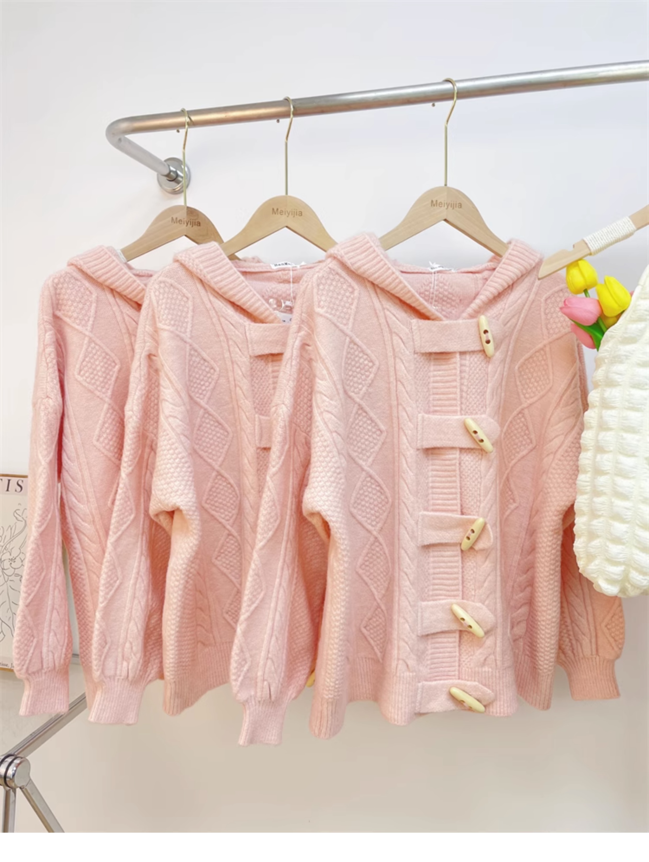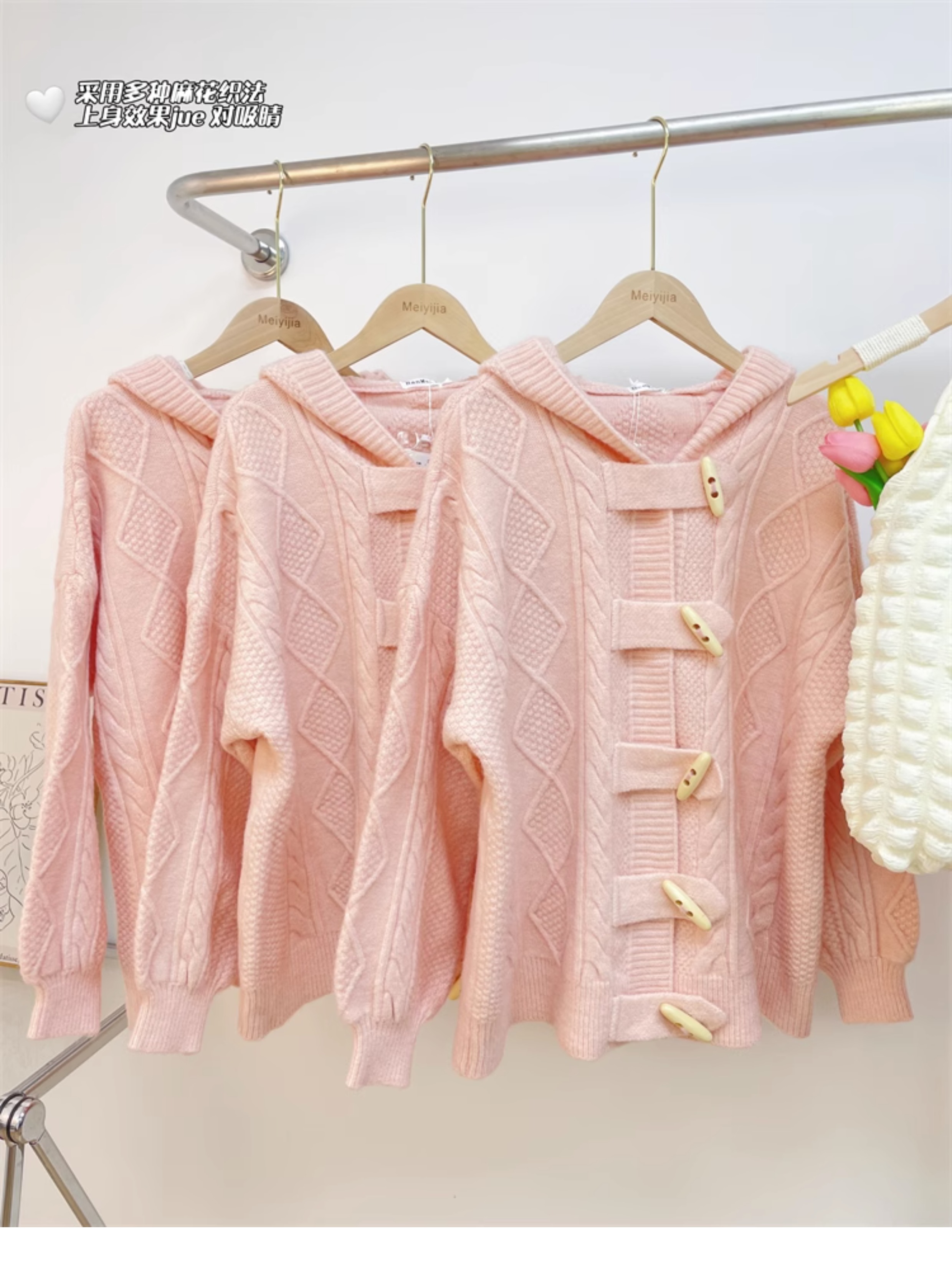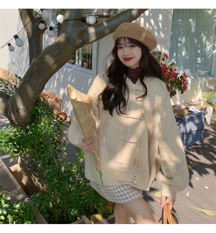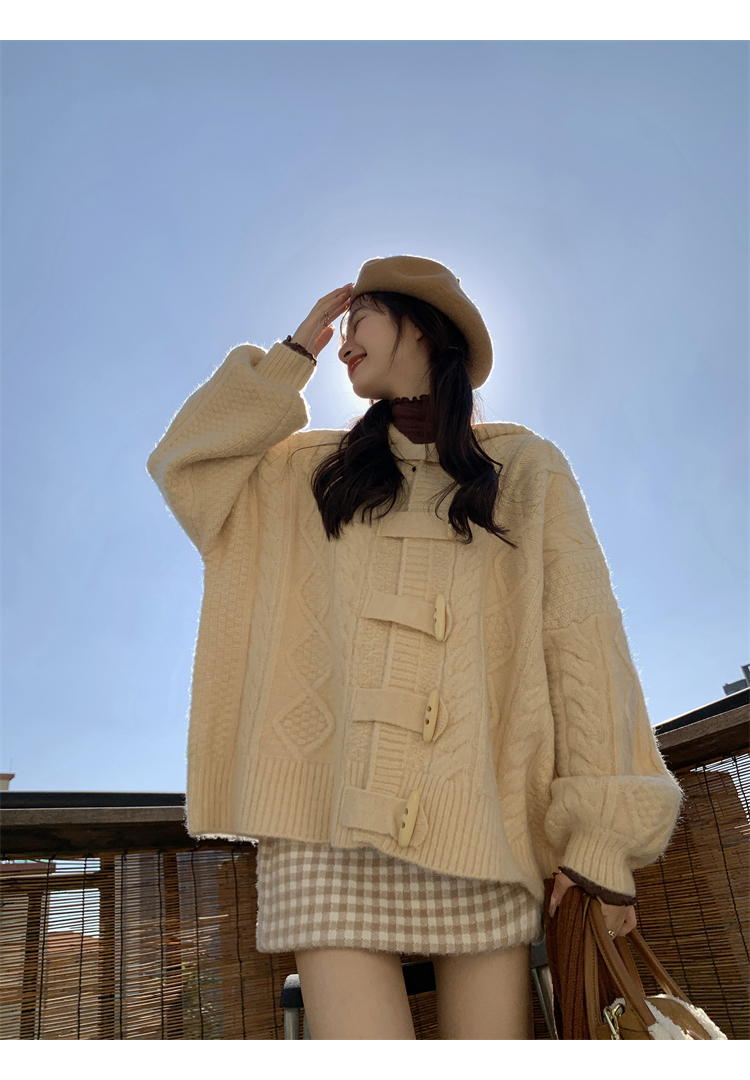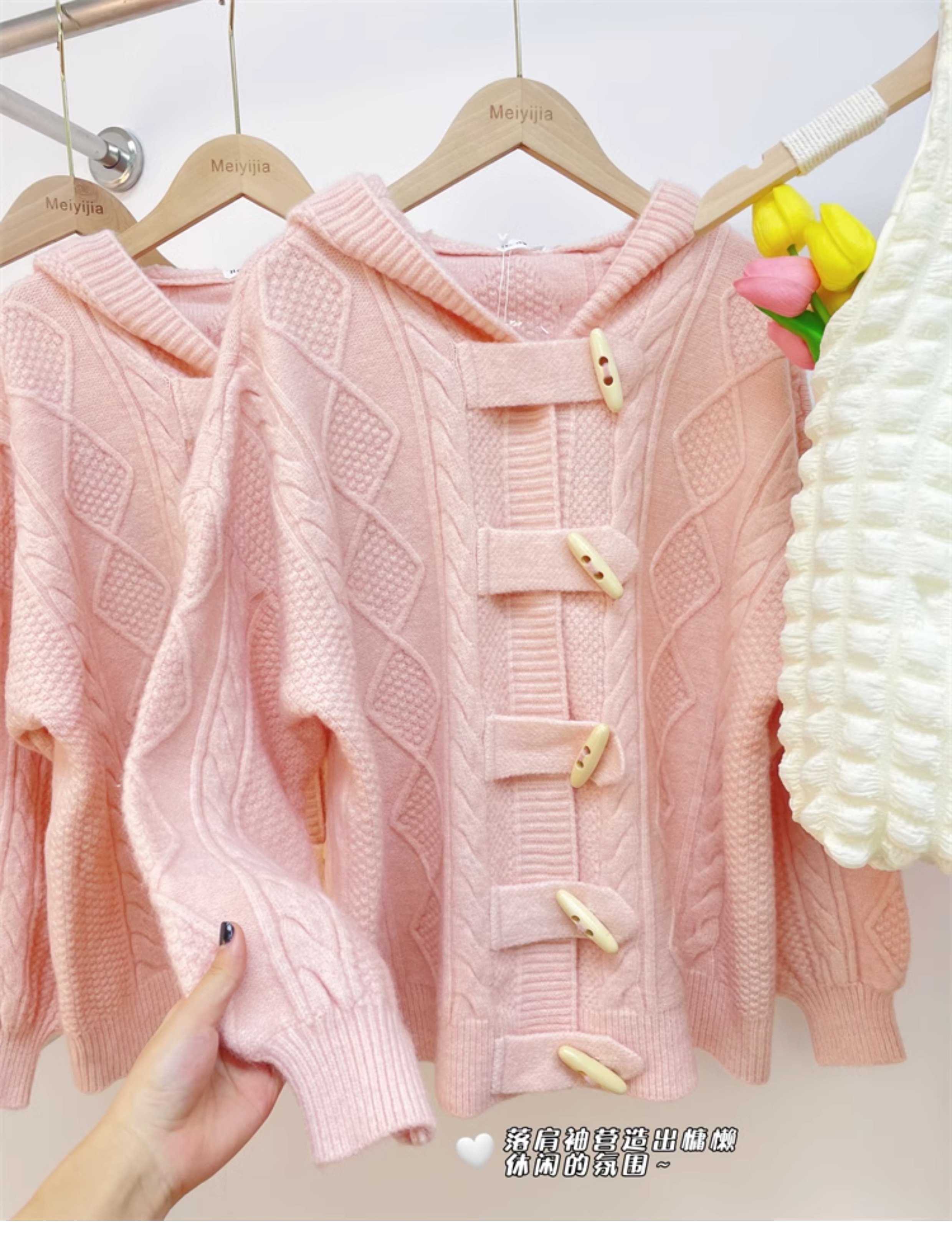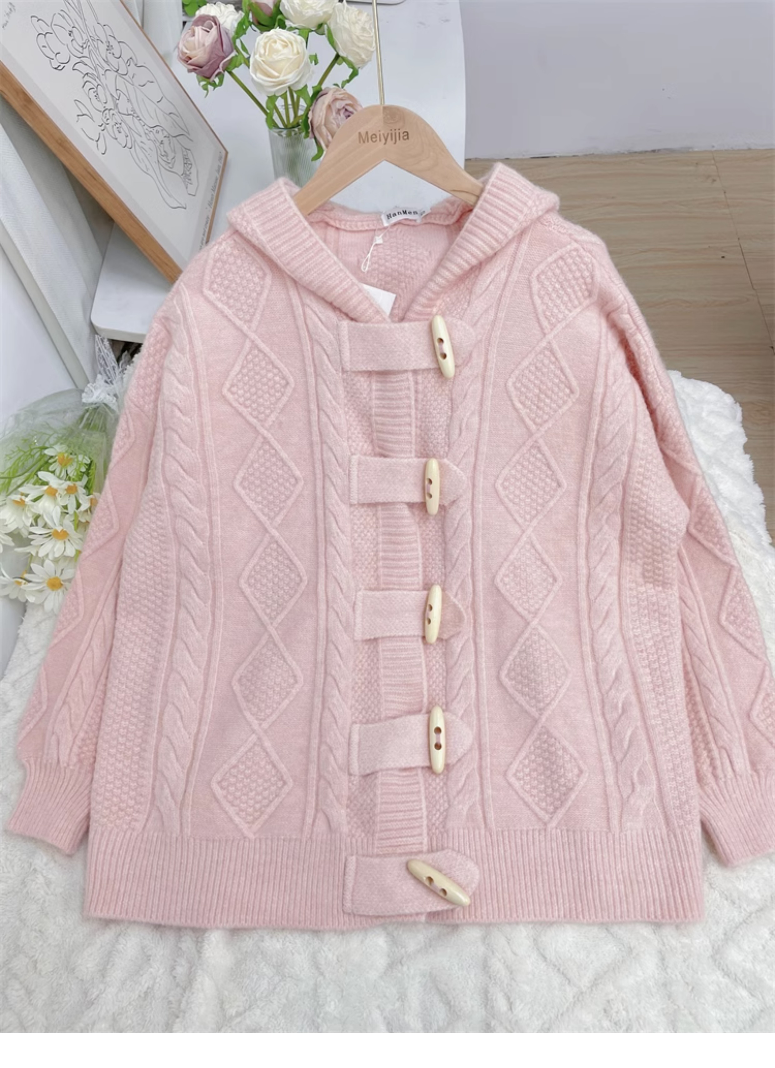 牛角扣連帽粉色毛衣開衫女秋冬軟糯溫柔甜美可愛慵懶寬鬆針織外套
