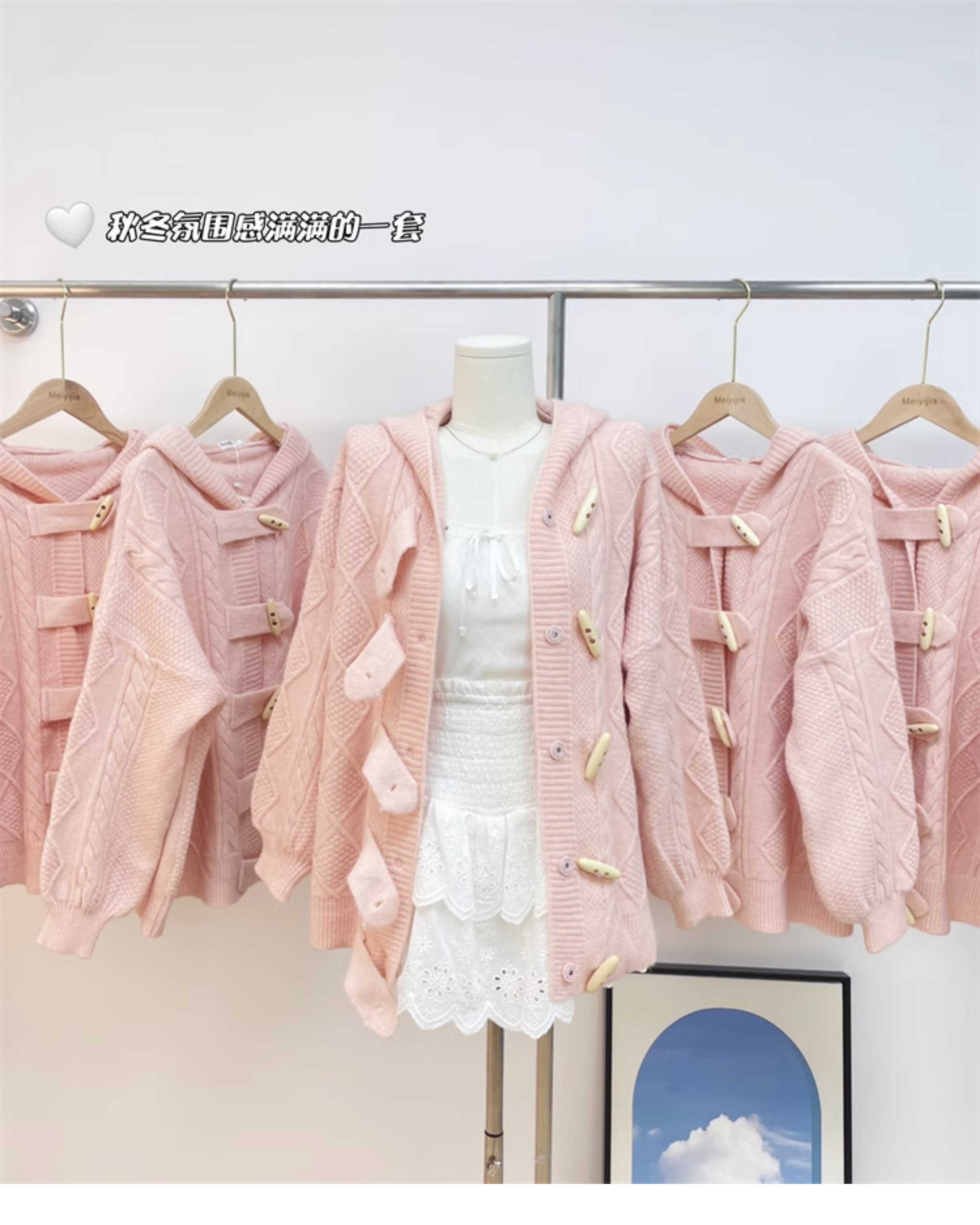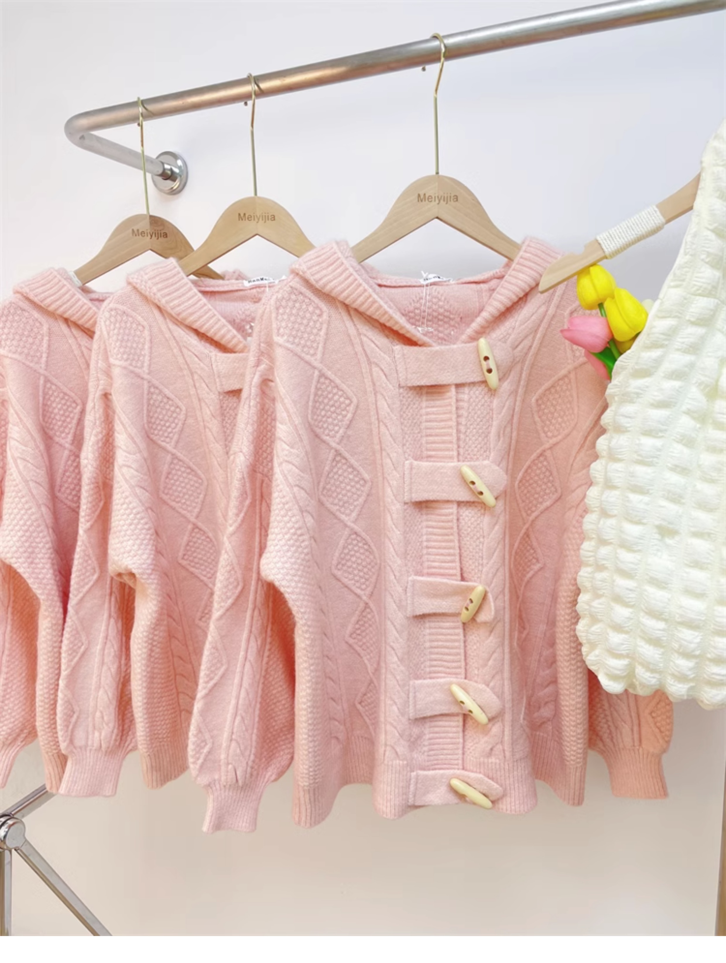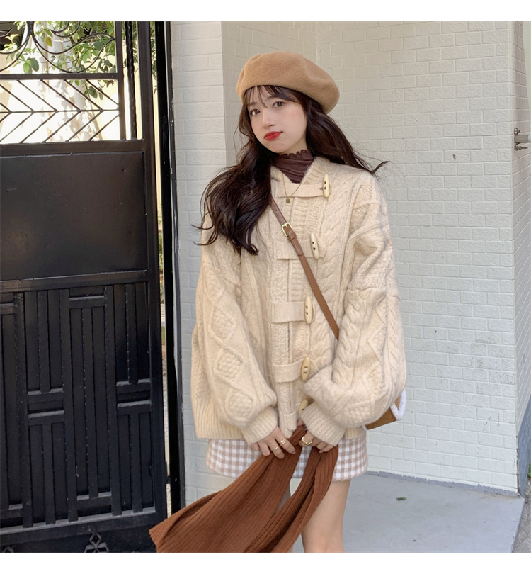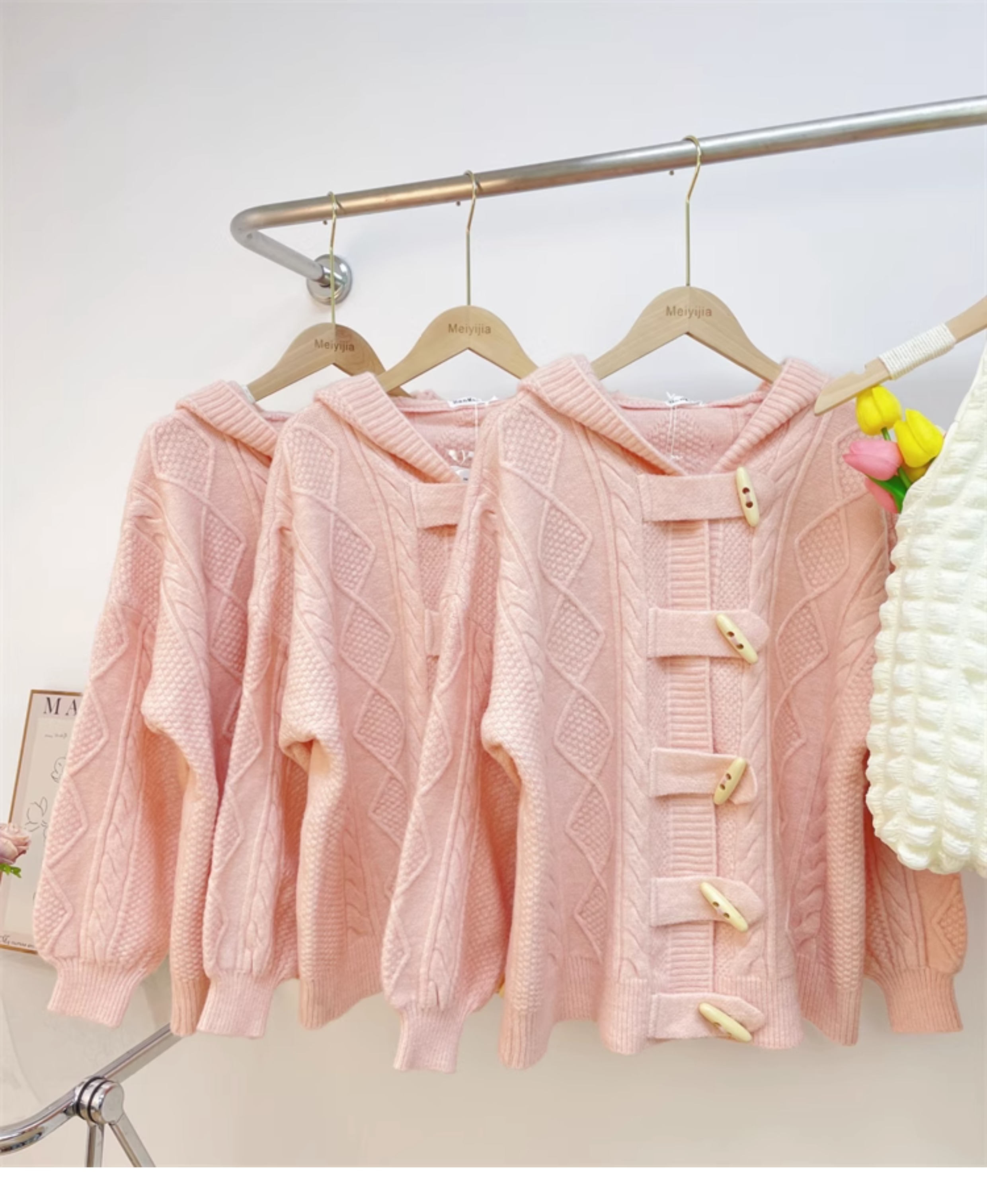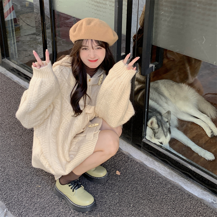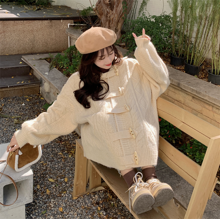 牛角扣連帽粉色毛衣開衫女秋冬軟糯溫柔甜美可愛慵懶寬鬆針織外套