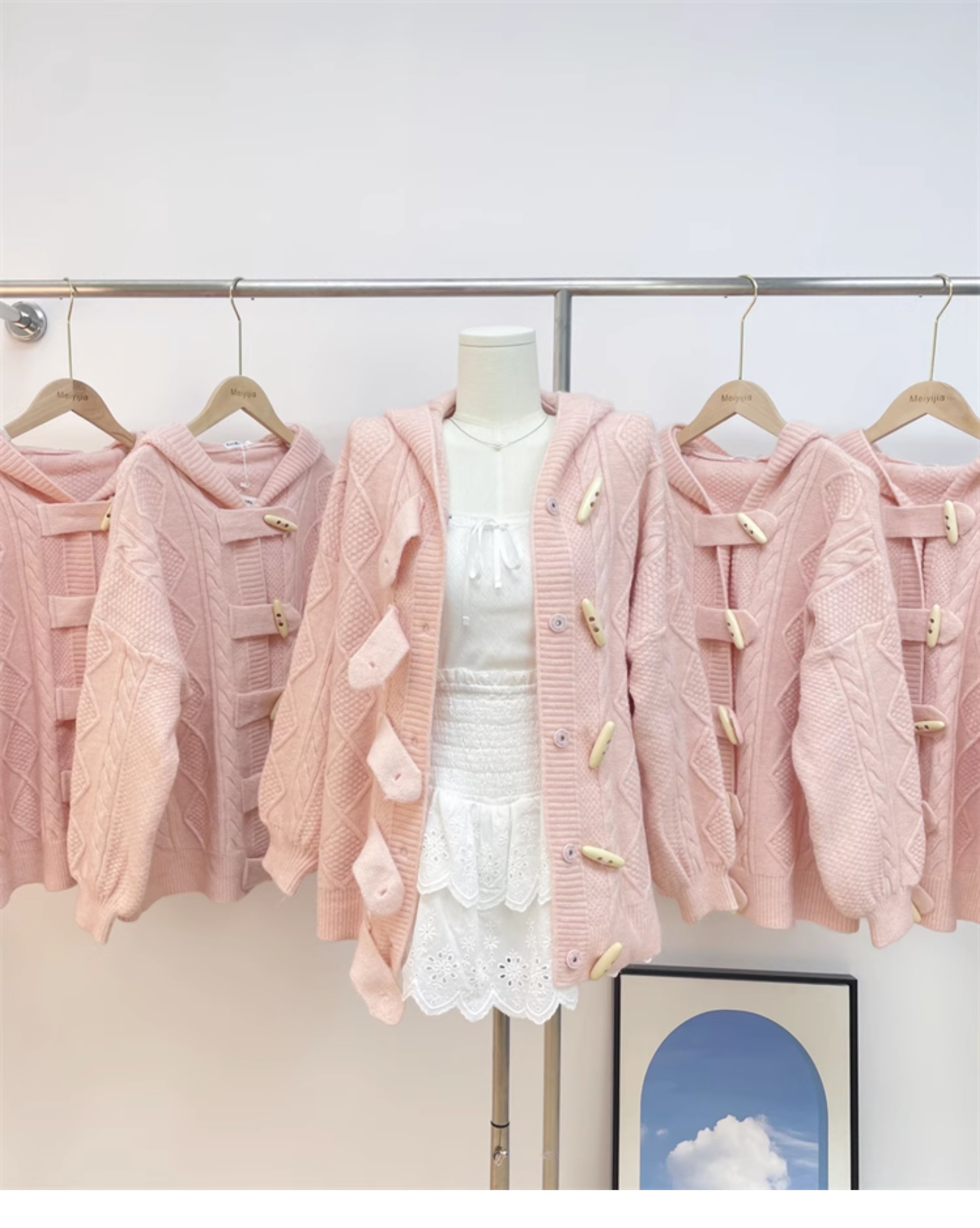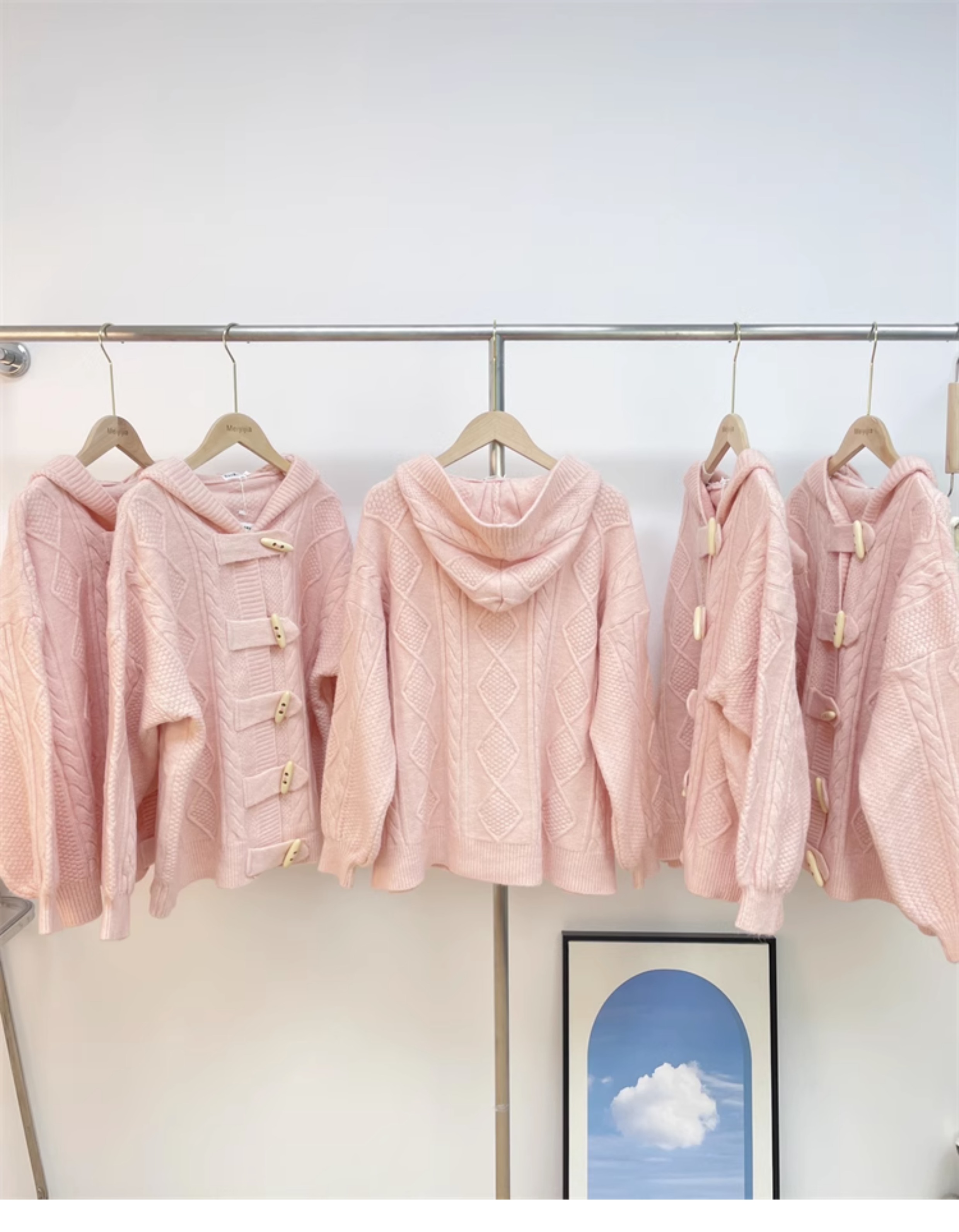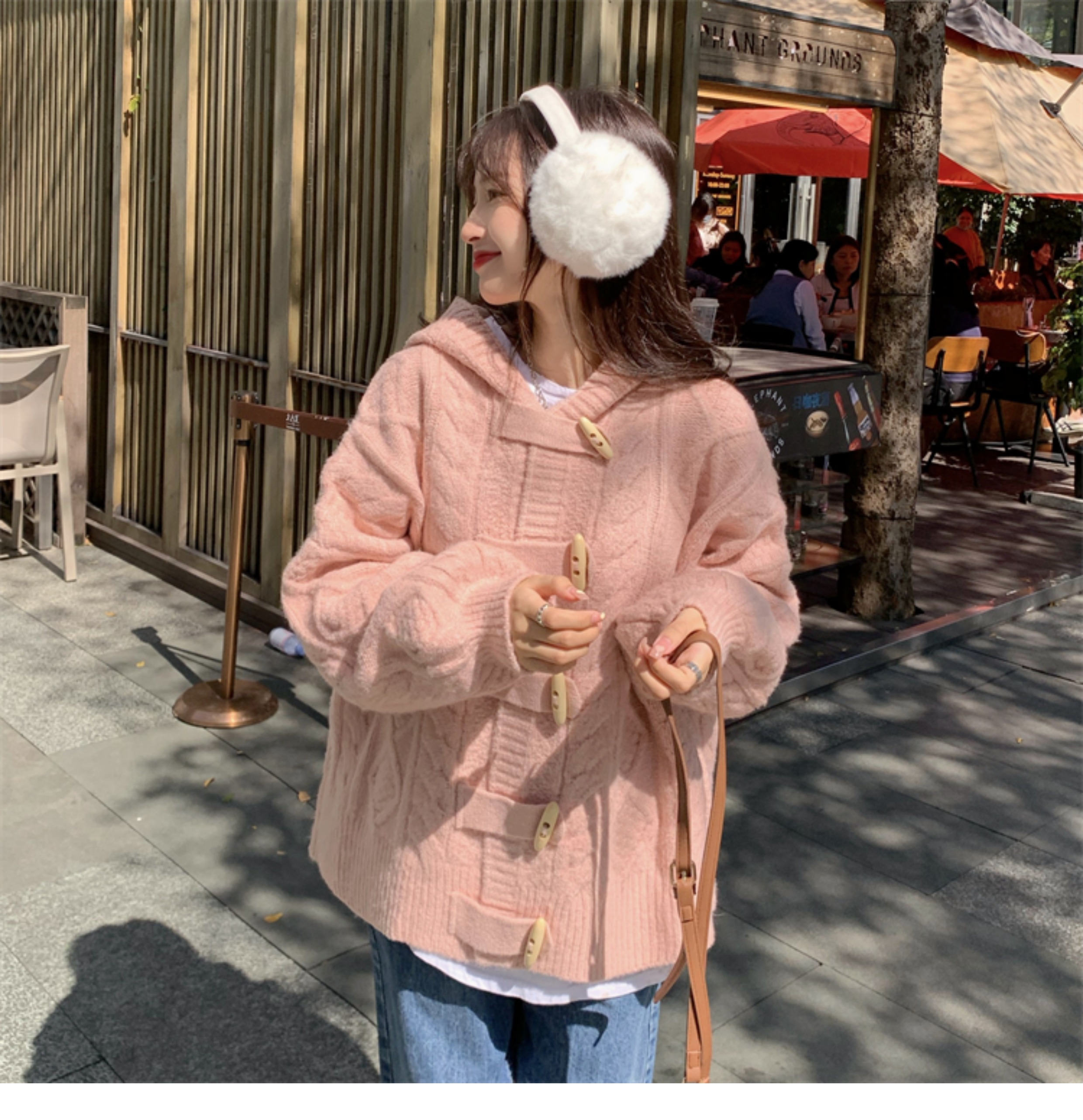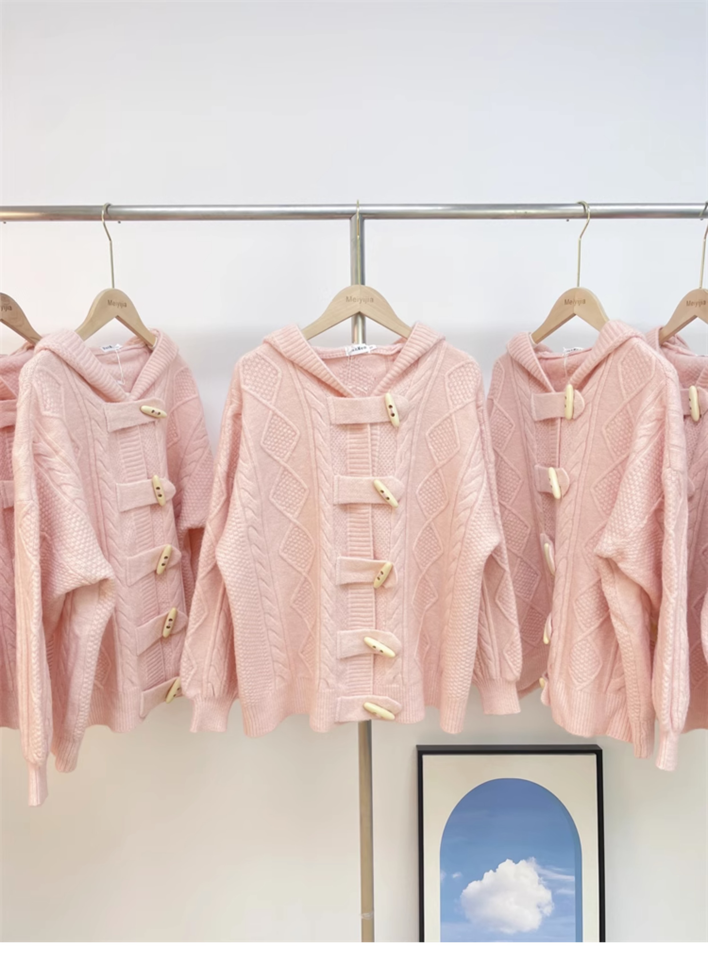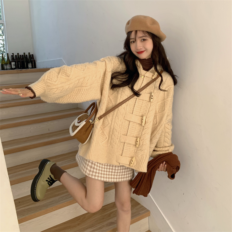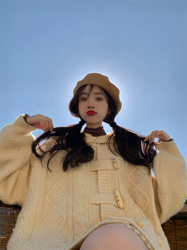 牛角扣連帽粉色毛衣開衫女秋冬軟糯溫柔甜美可愛慵懶寬鬆針織外套