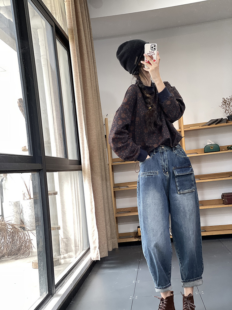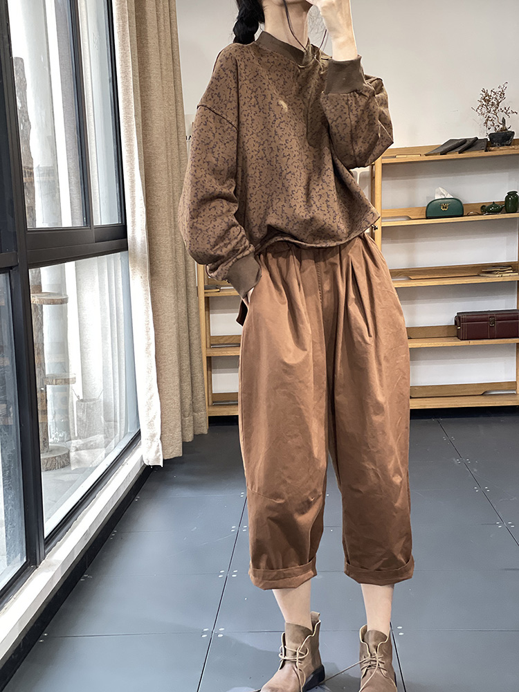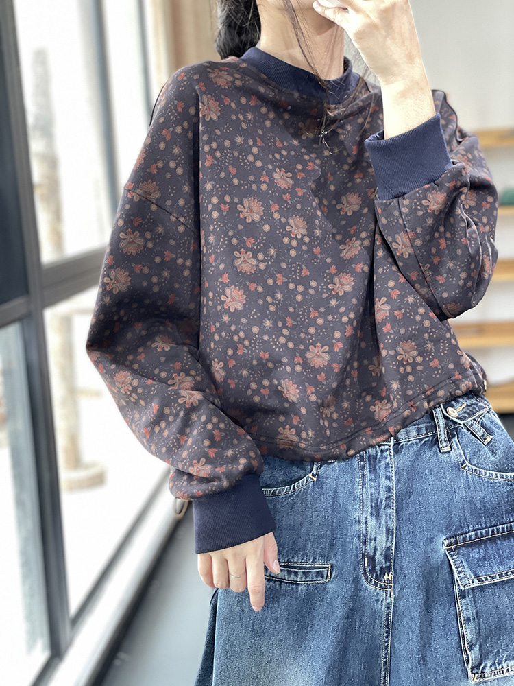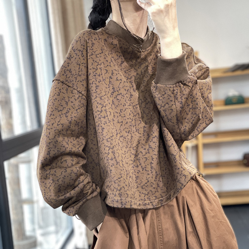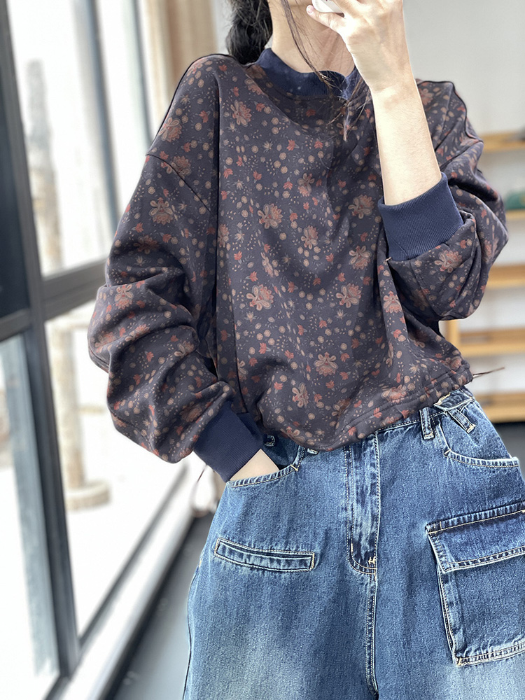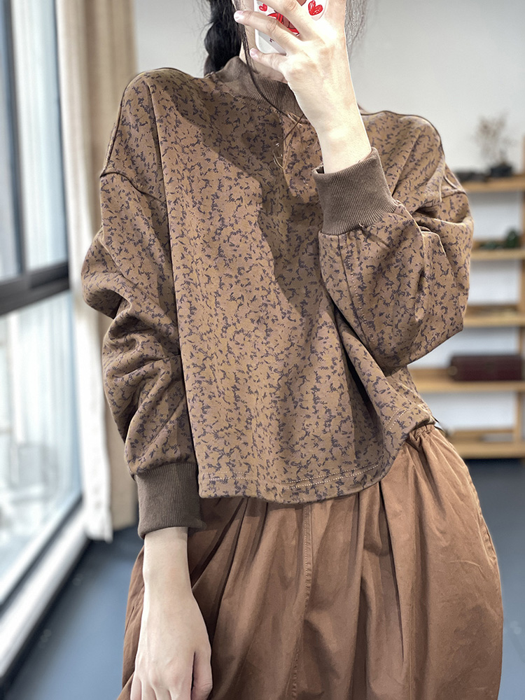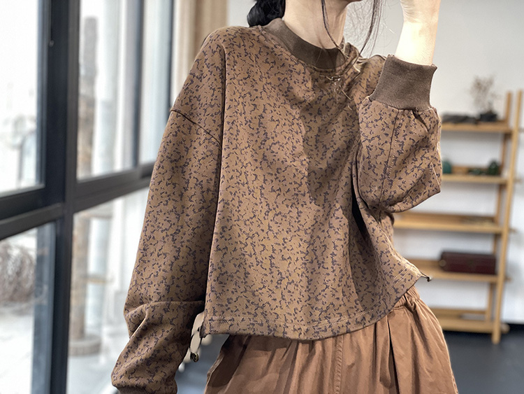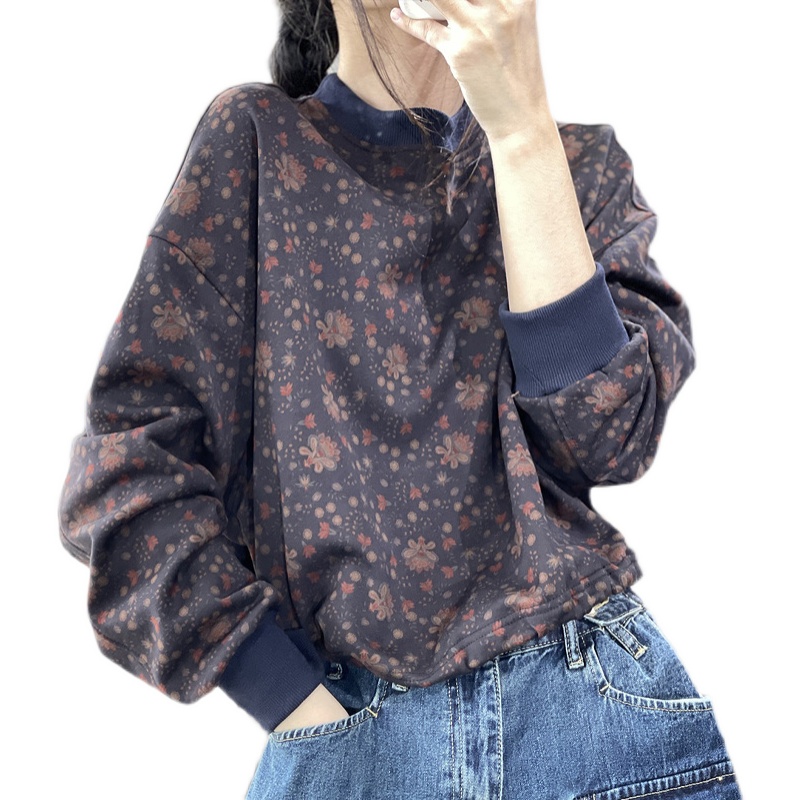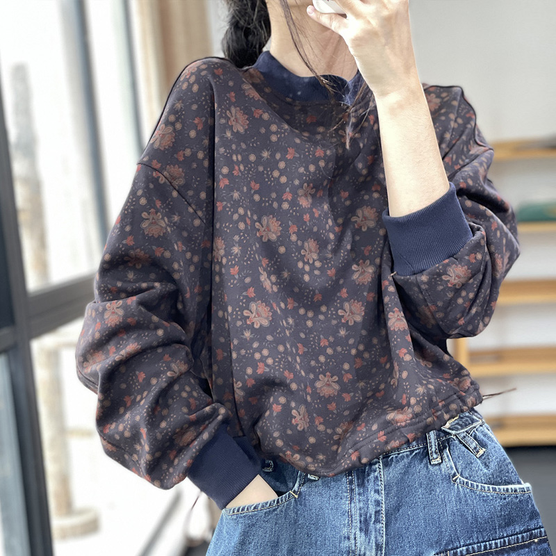 古與色秋冬季復古文藝蝙蝠袖寬鬆顯瘦抽繩休閒碎花純棉休閒上衣女上衣
