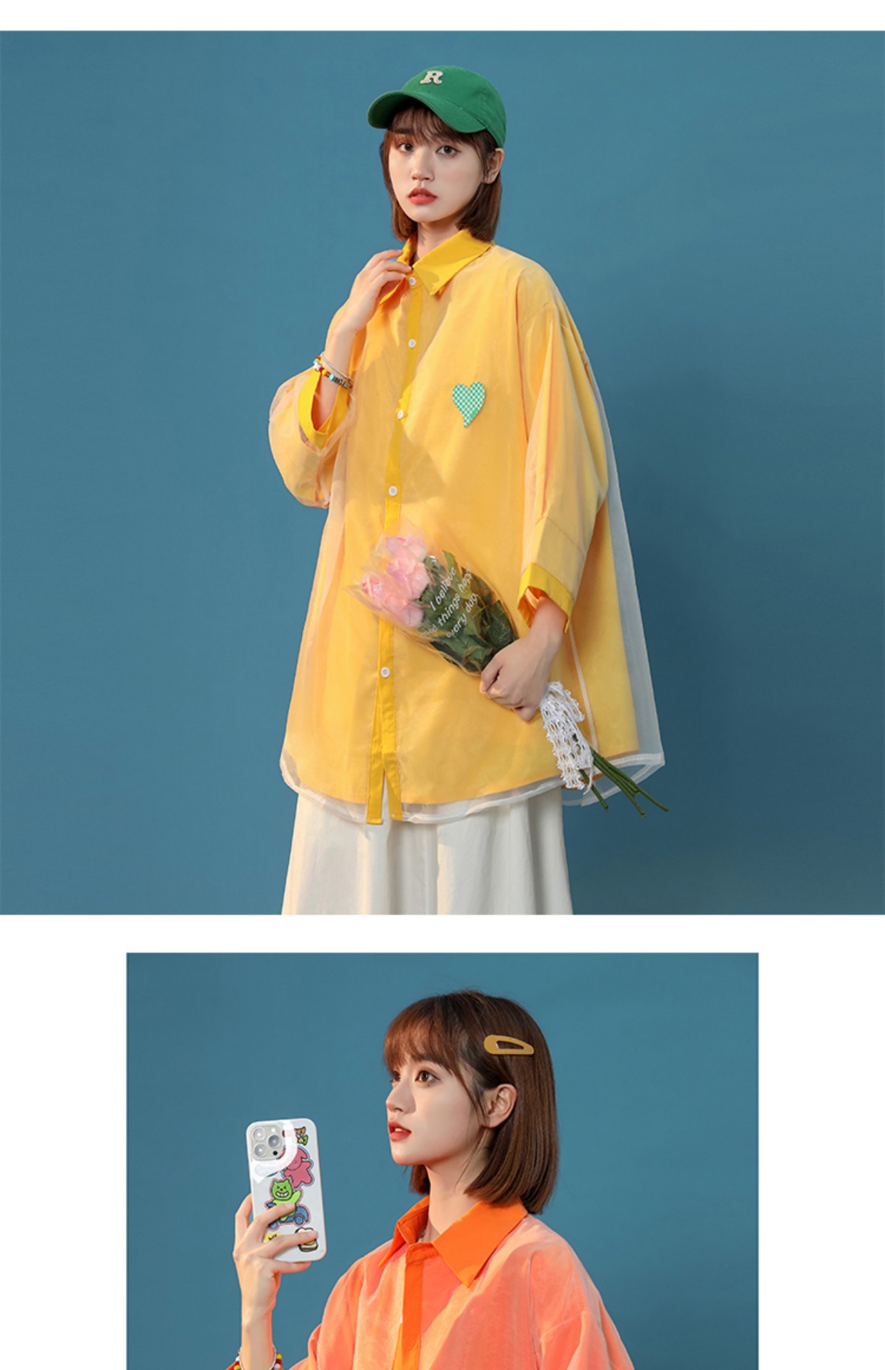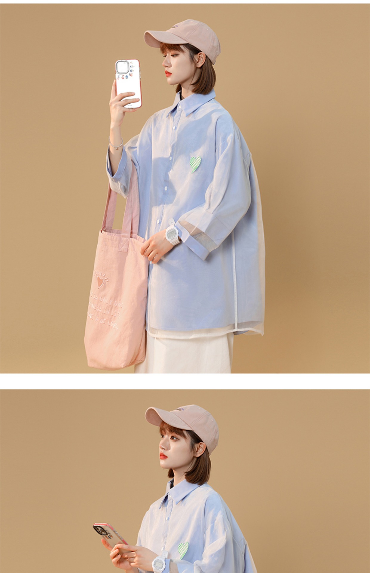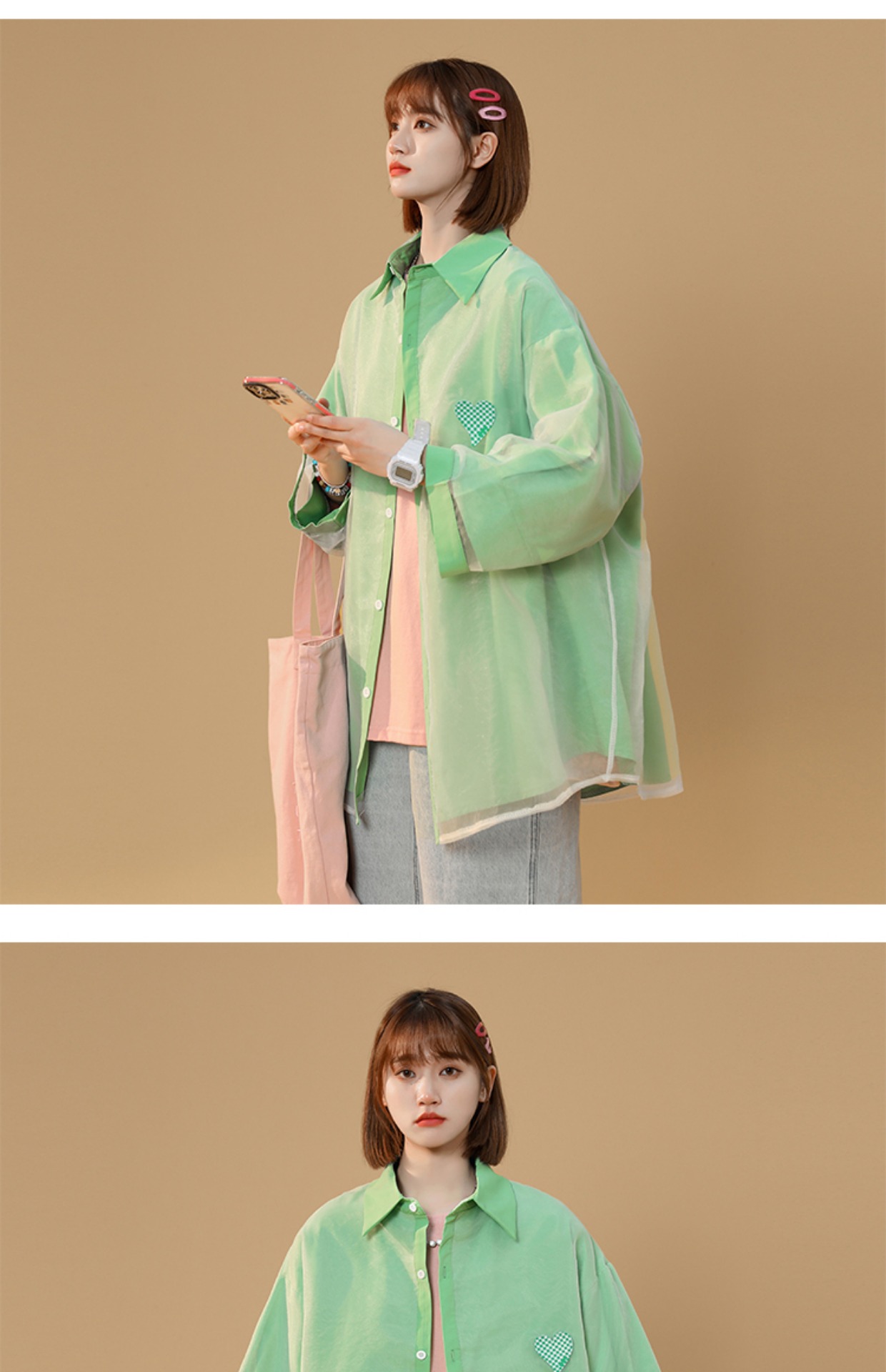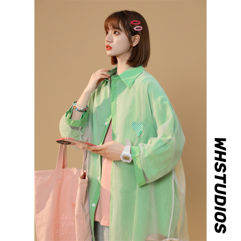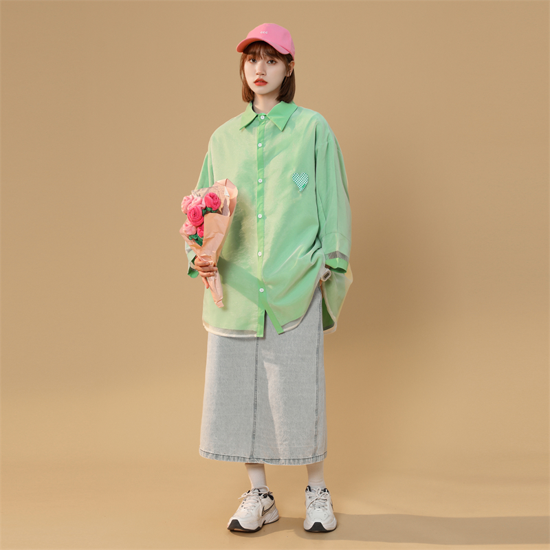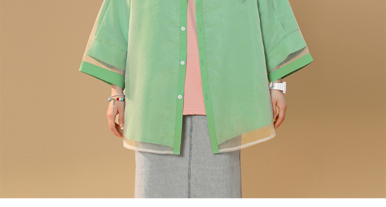 牛油果綠襯衫女短袖夏季薄款假兩件網紗防衫衣女中性風九分袖外套