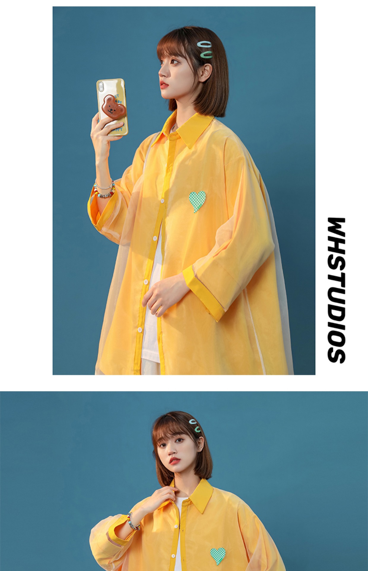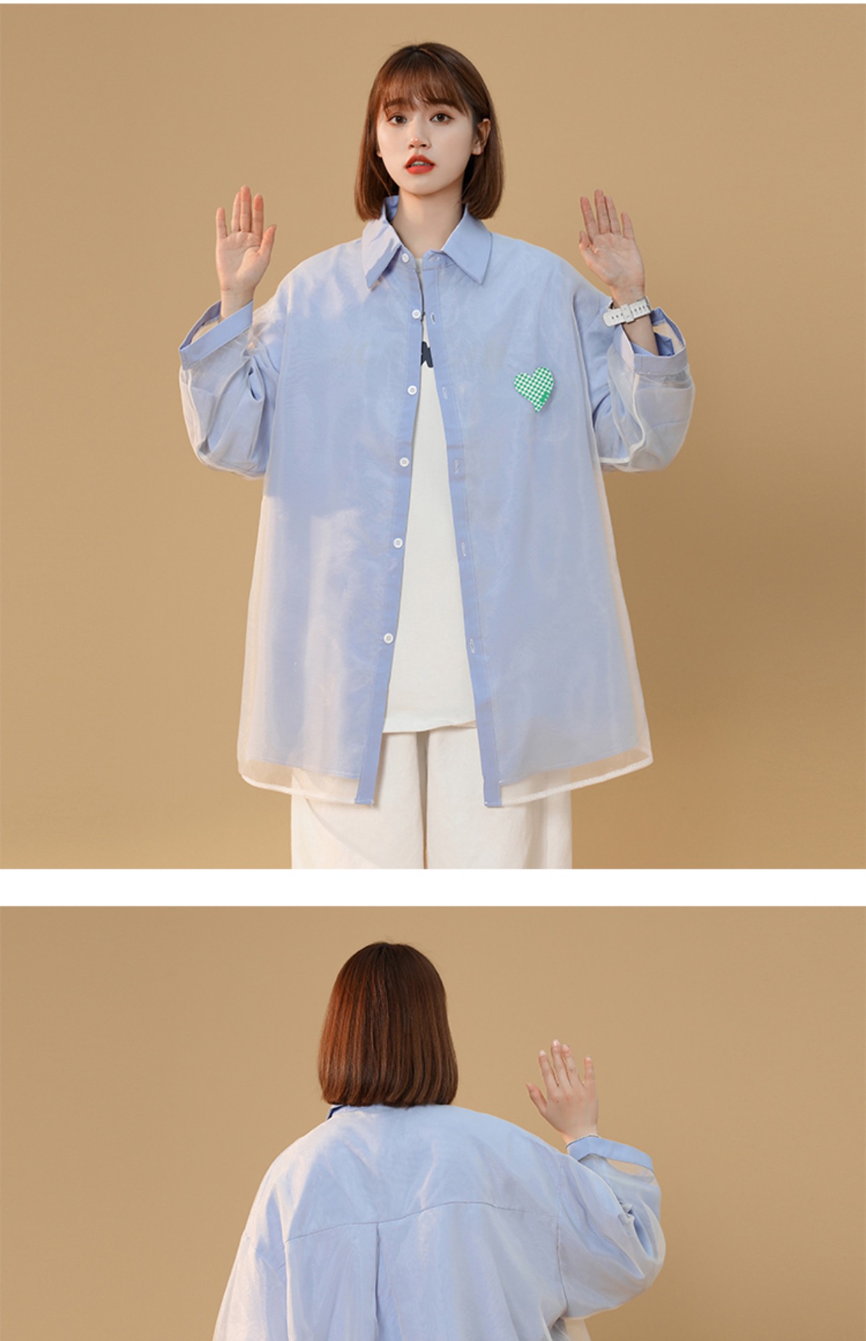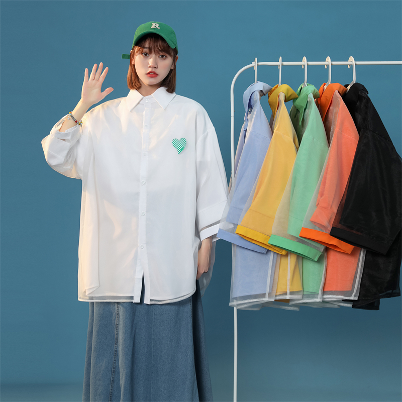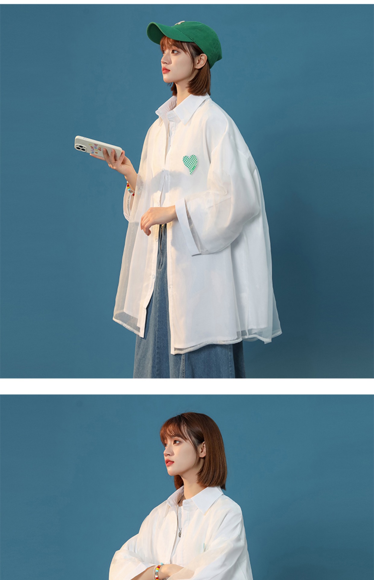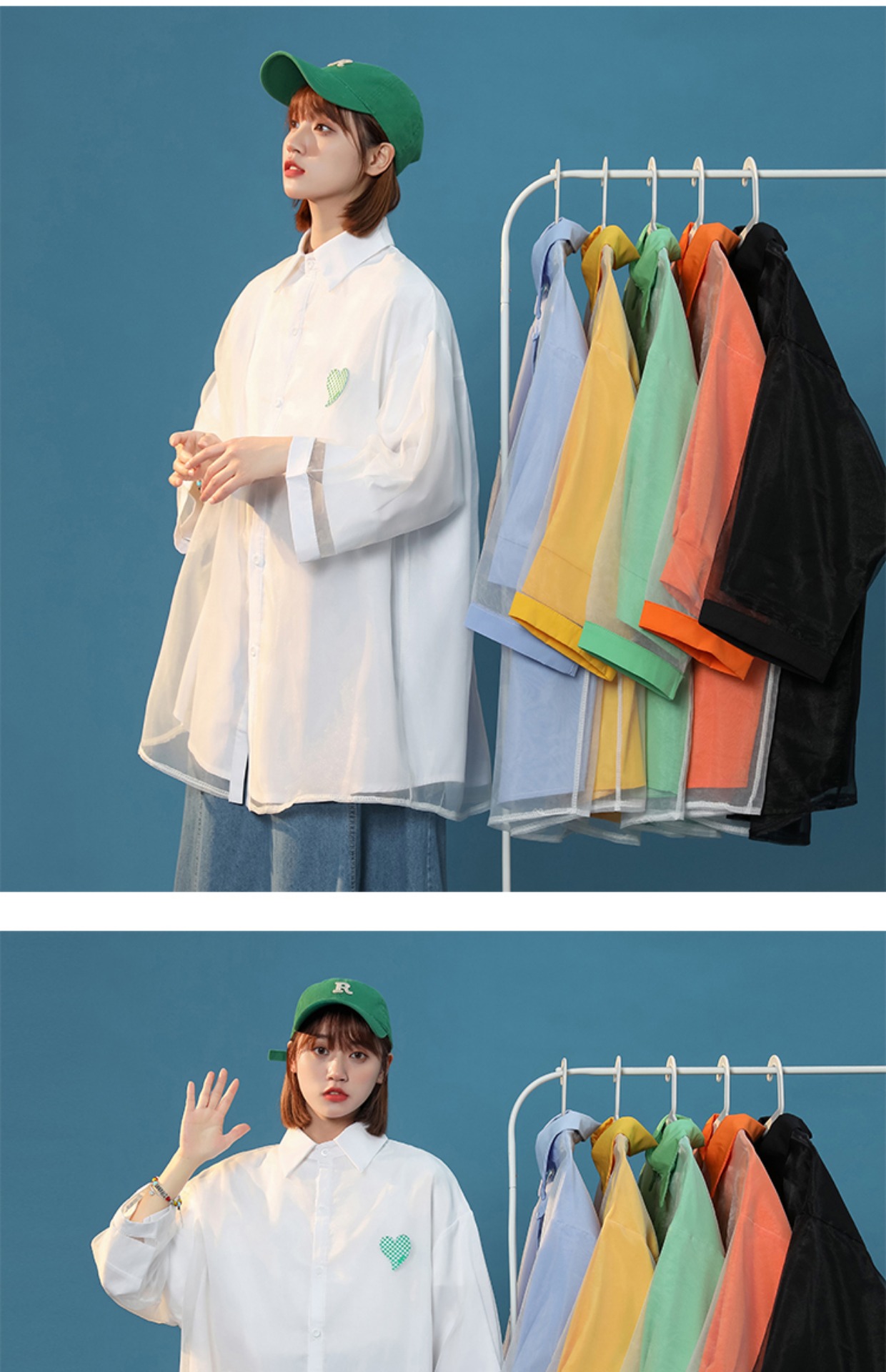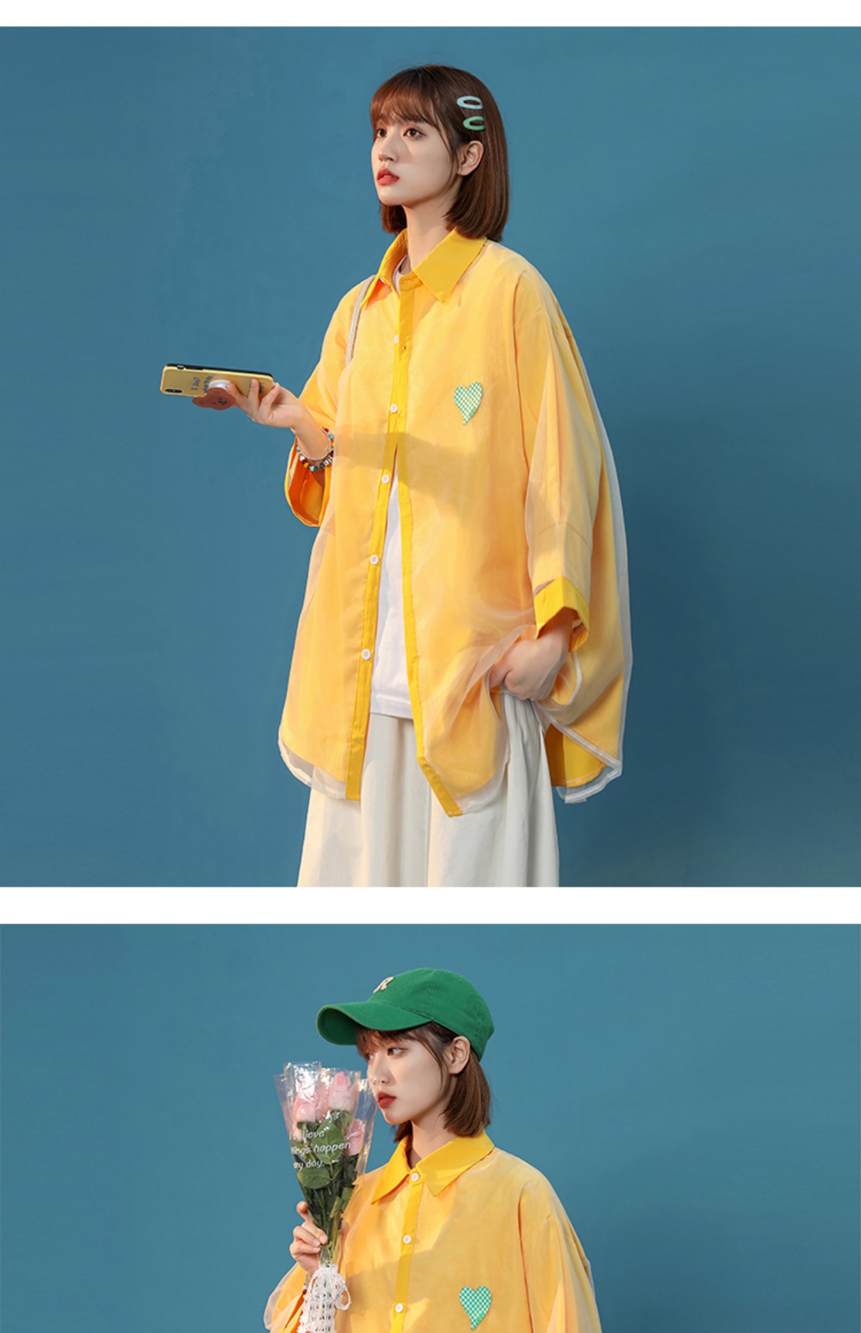 牛油果綠襯衫女短袖夏季薄款假兩件網紗防衫衣女中性風九分袖外套