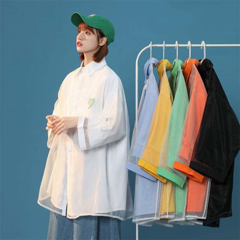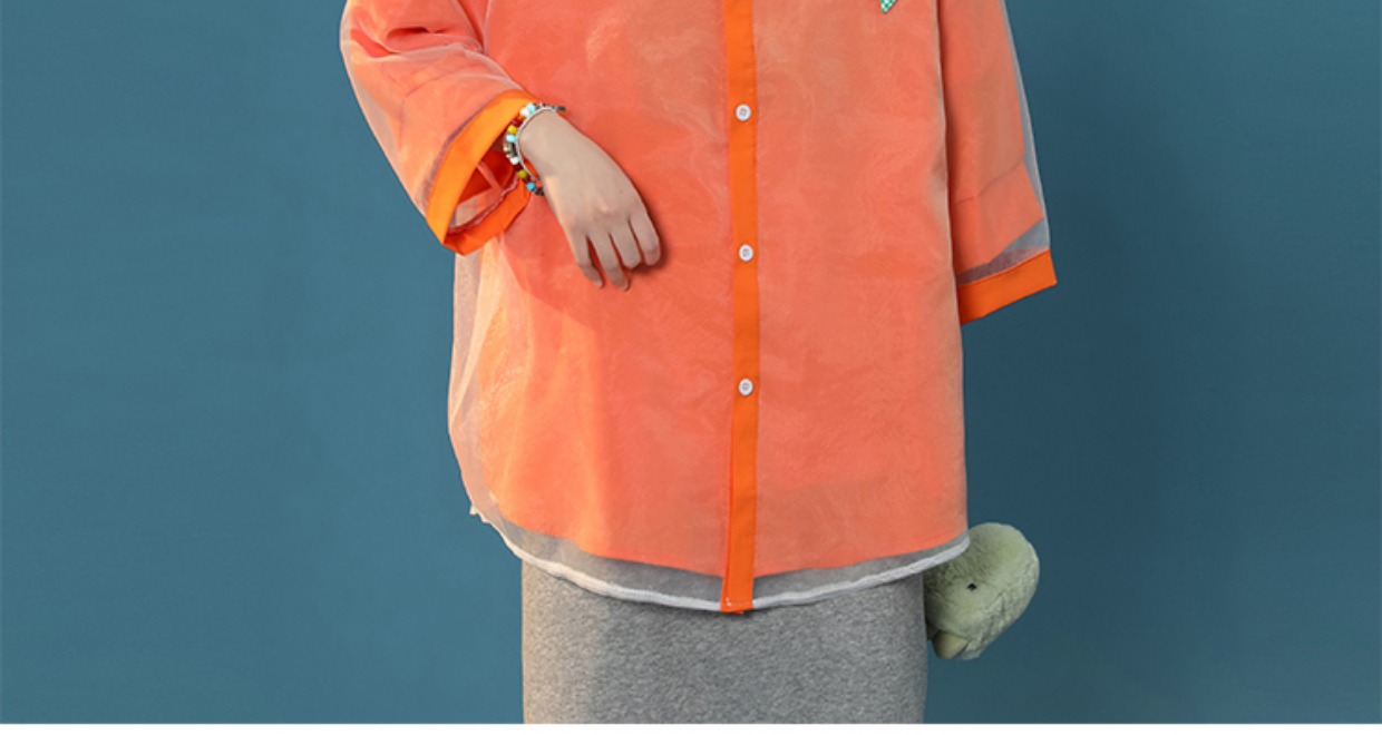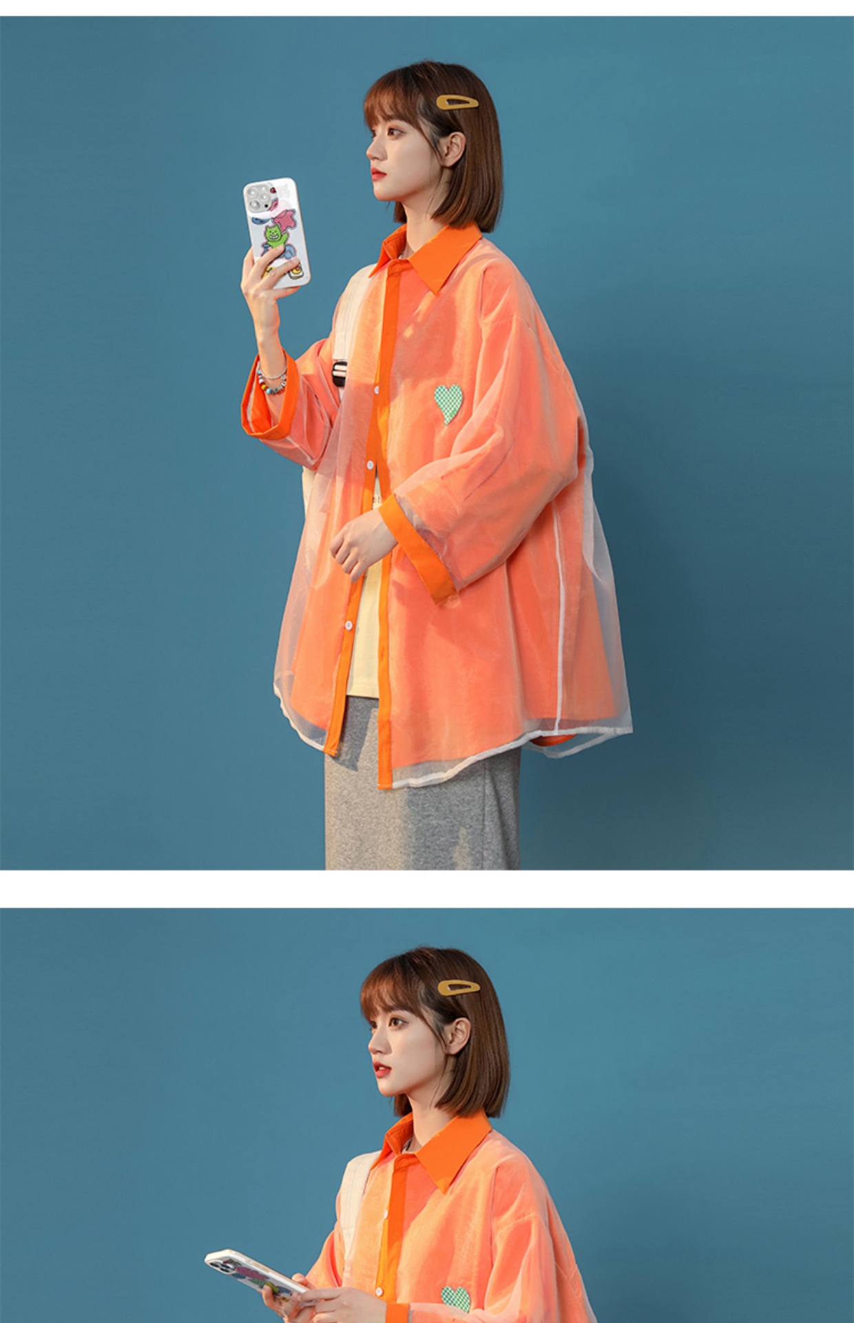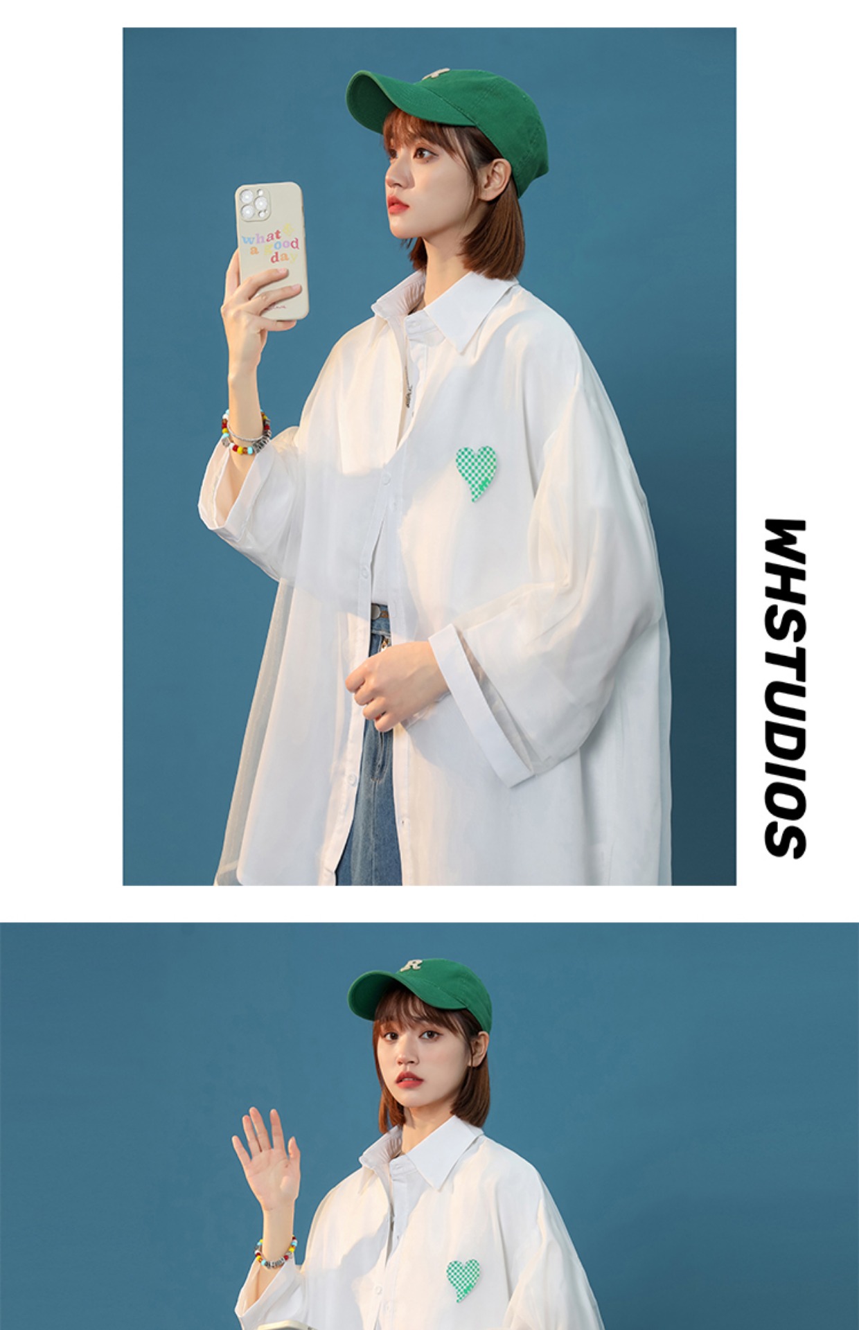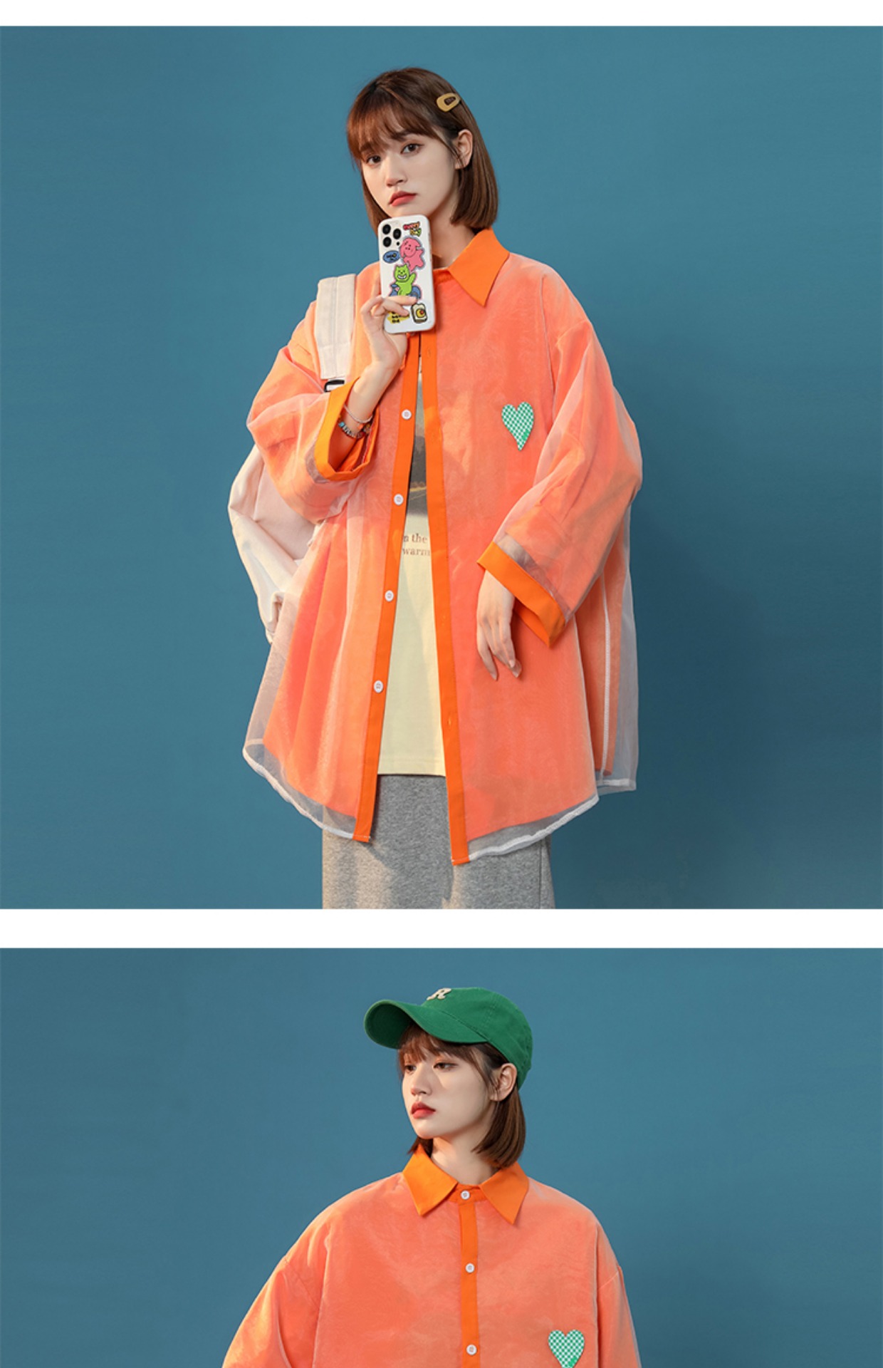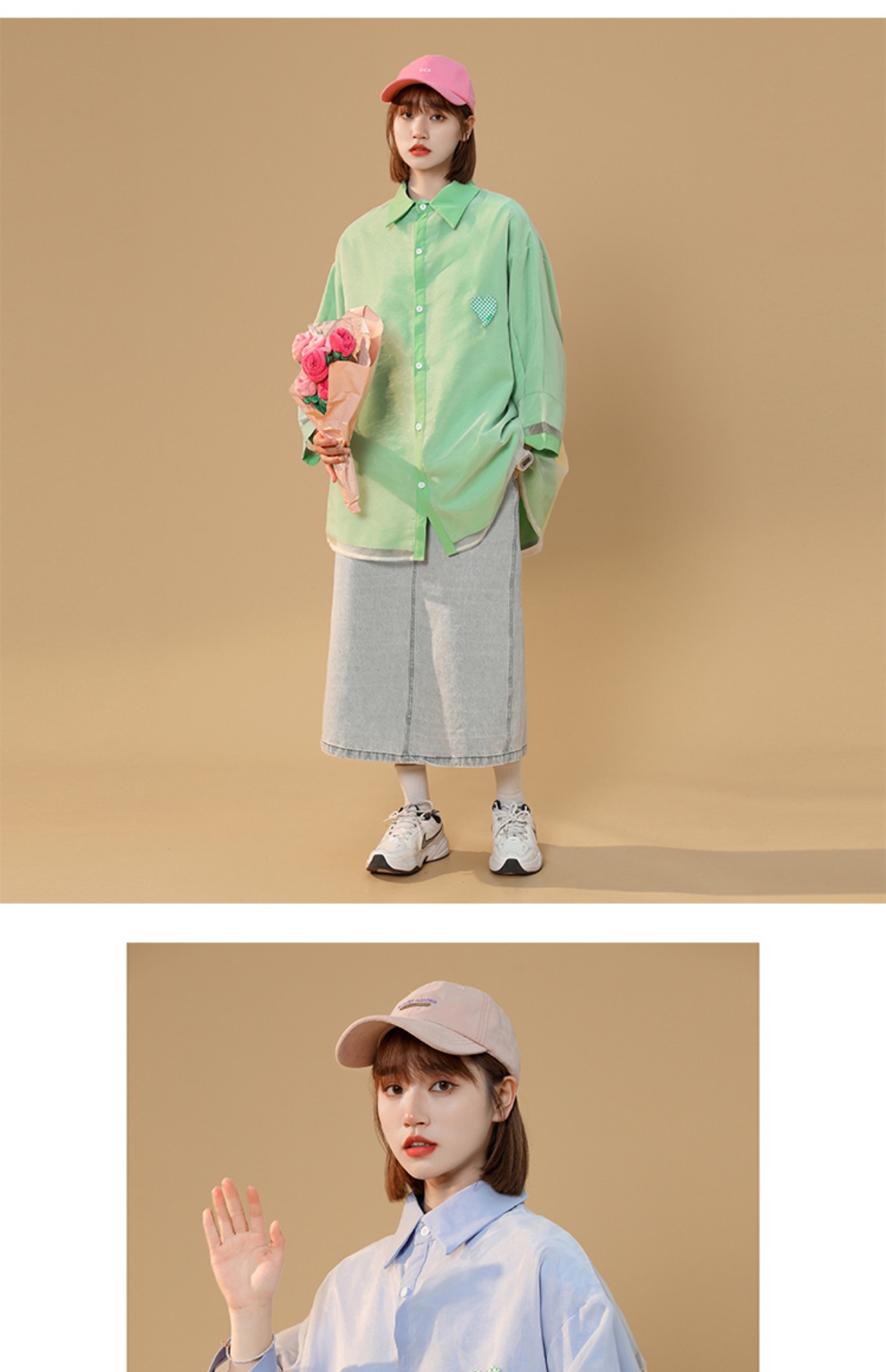 牛油果綠襯衫女短袖夏季薄款假兩件網紗防衫衣女中性風九分袖外套