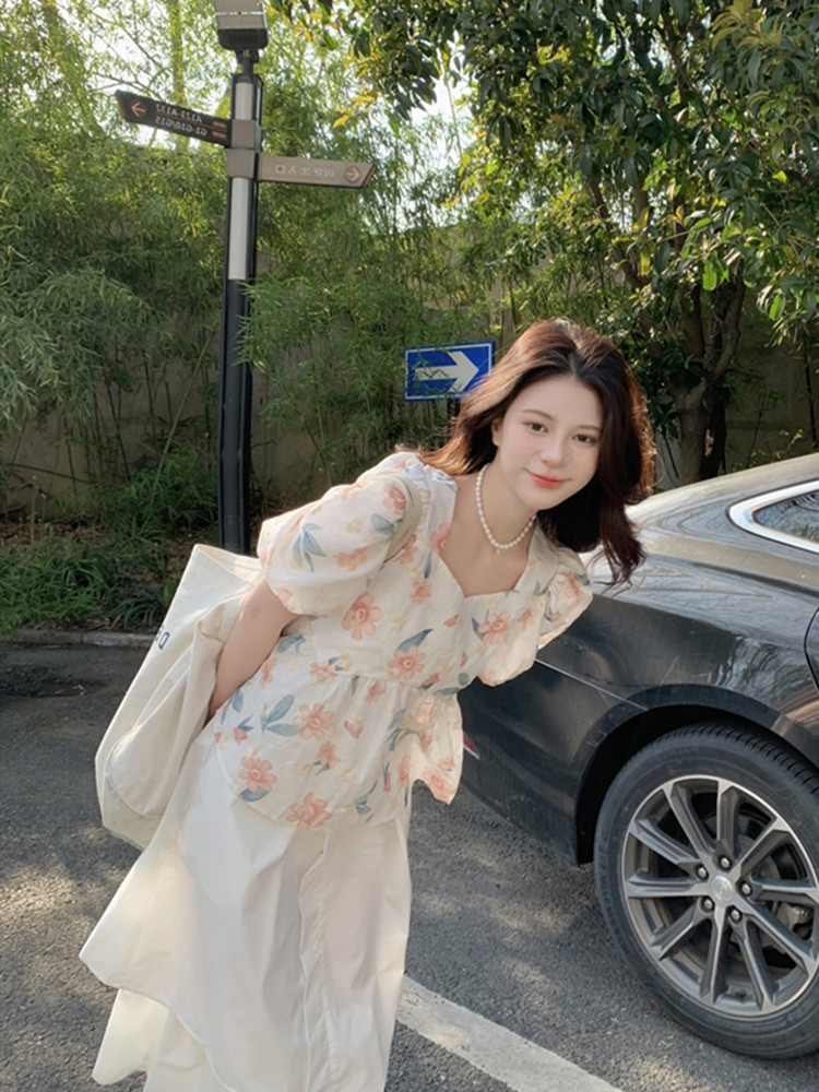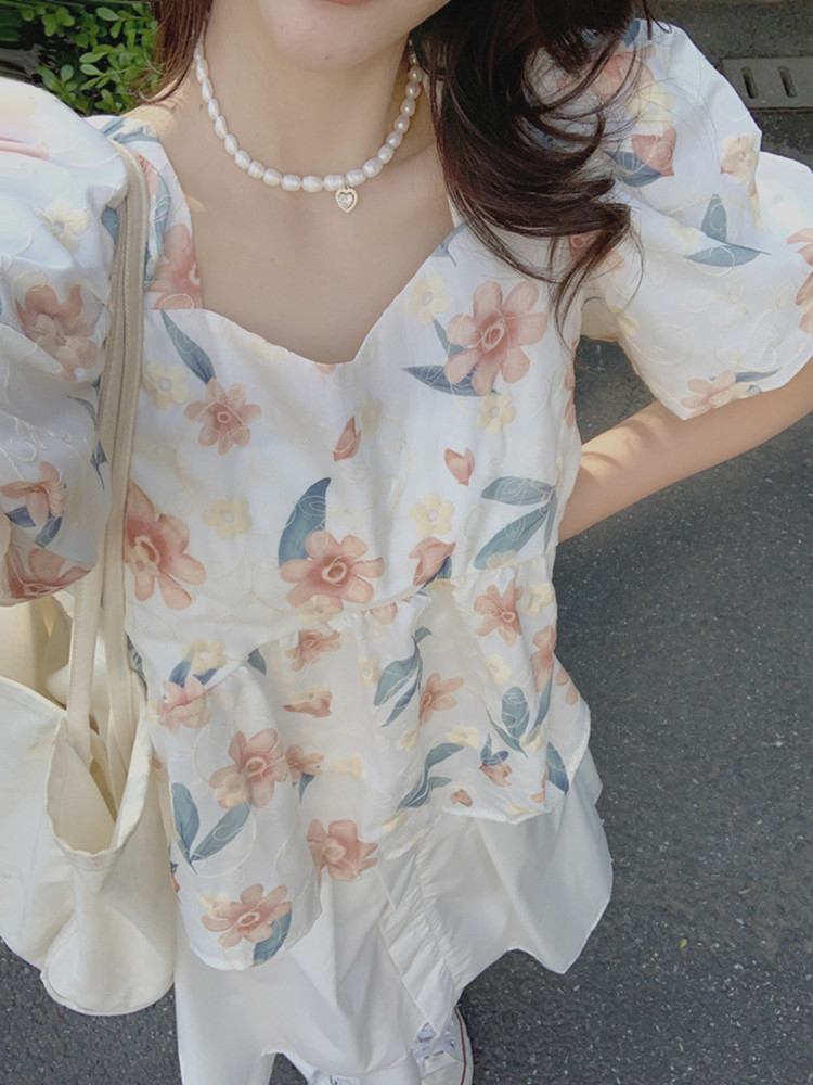 溫柔顯白泡泡袖印花上衣女夏季韓系甜美感俏皮超仙氣質小衫雪紡衫