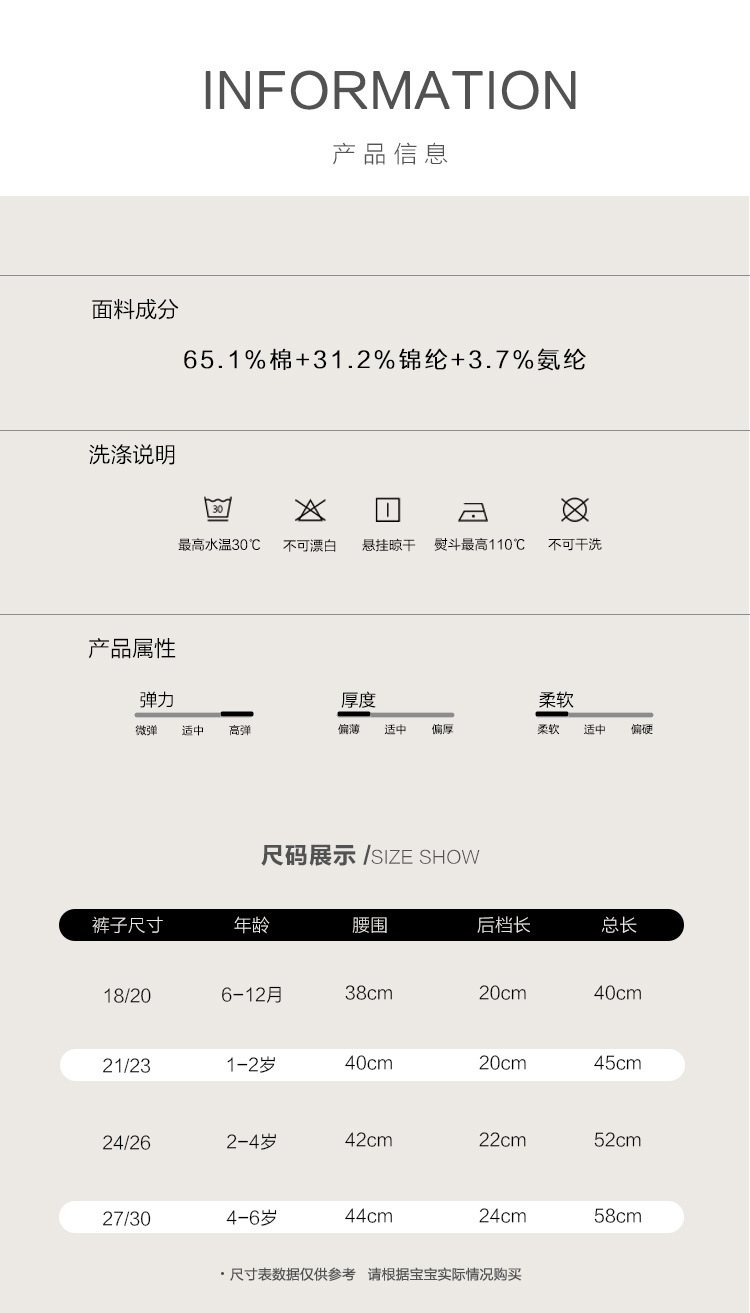 童袜尺码 18-20【6-12个月】,21-23【1-2岁】,24-26【2-4岁】,27-30【4-6岁】,31-34【6-8岁】