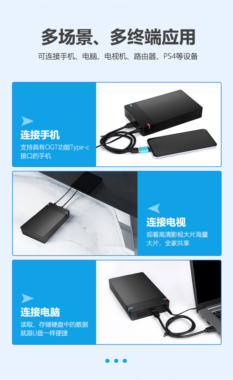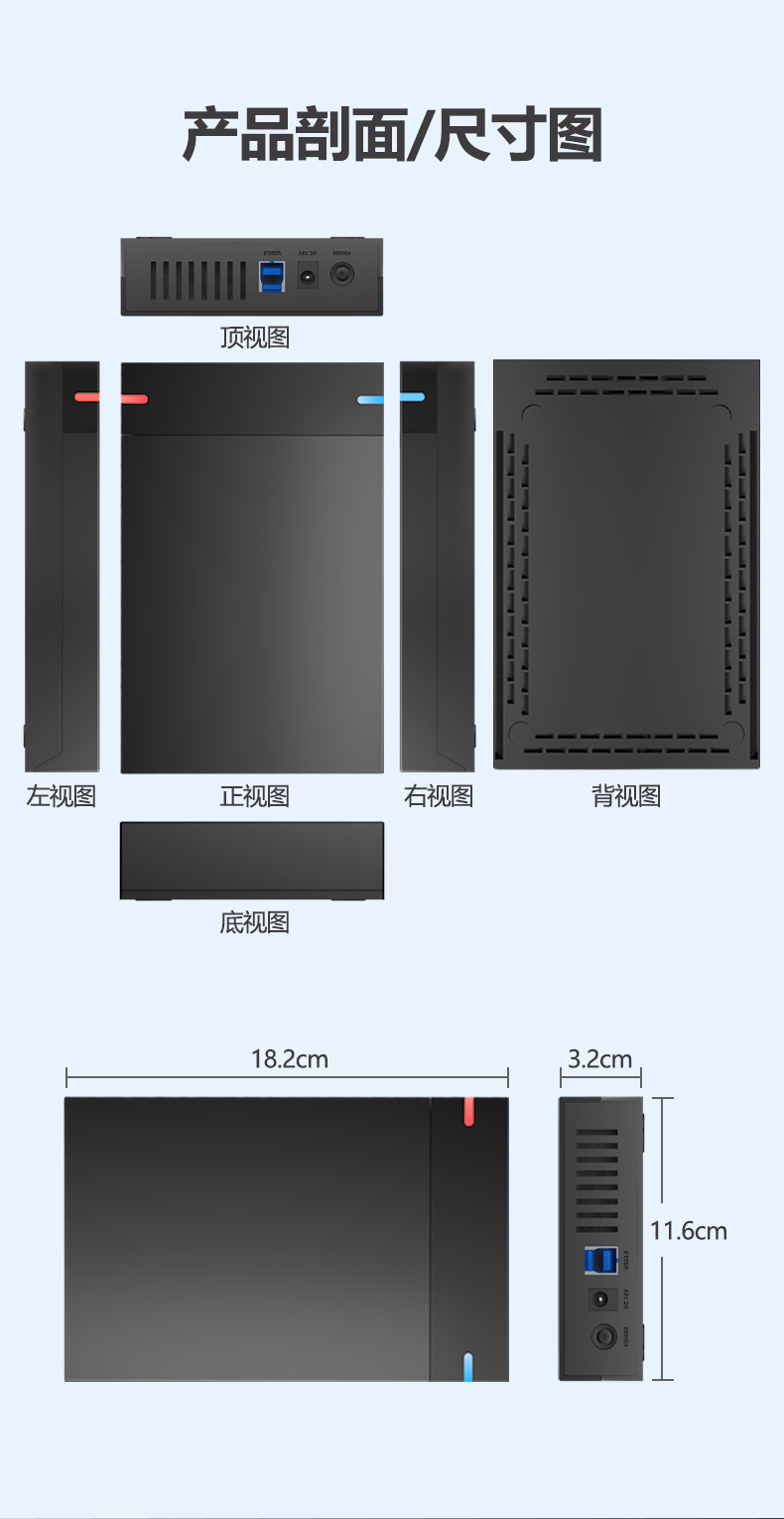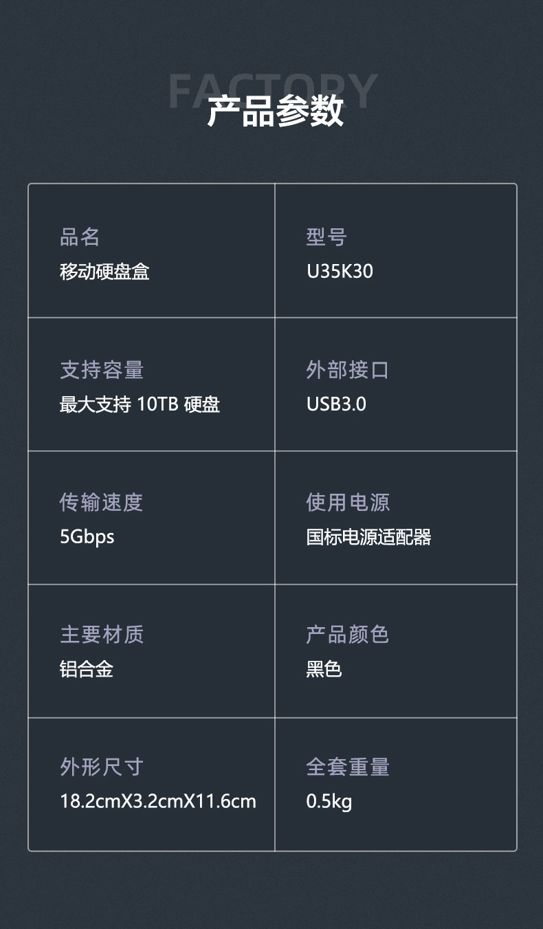 包装清单 硬盘盒、数据线、电源、包装盒