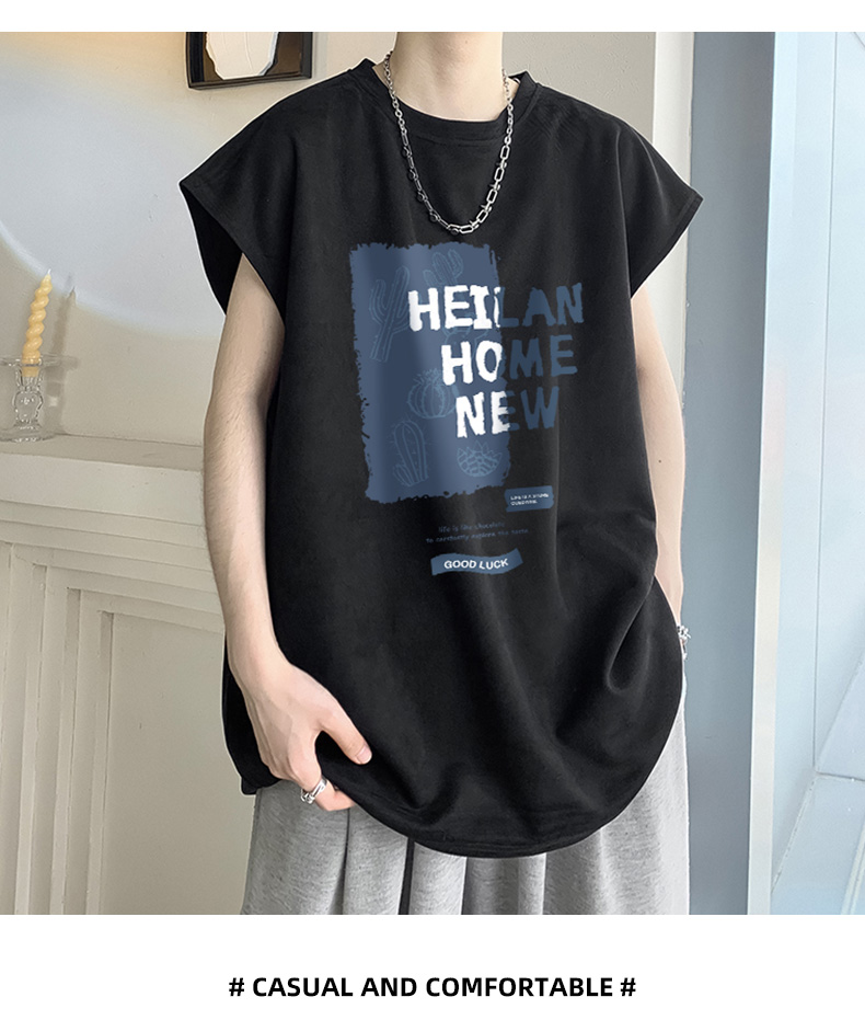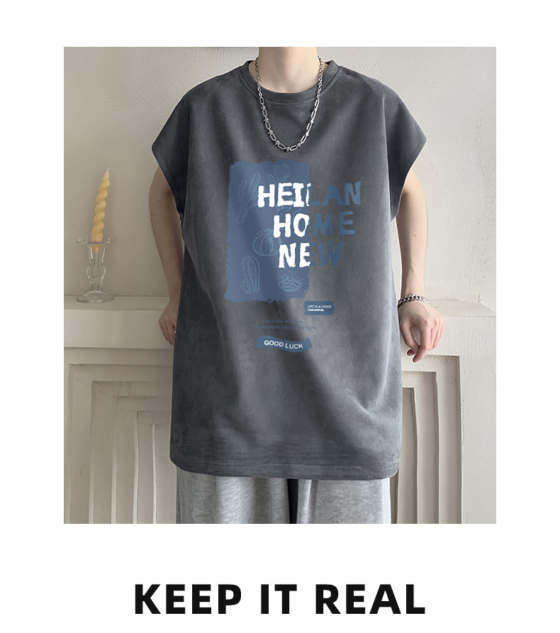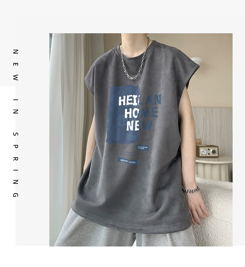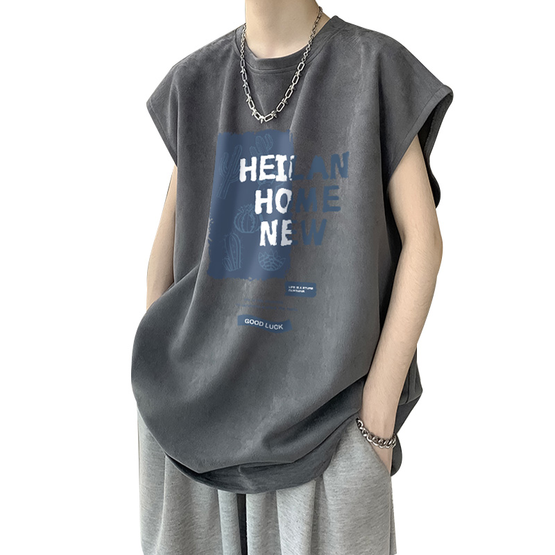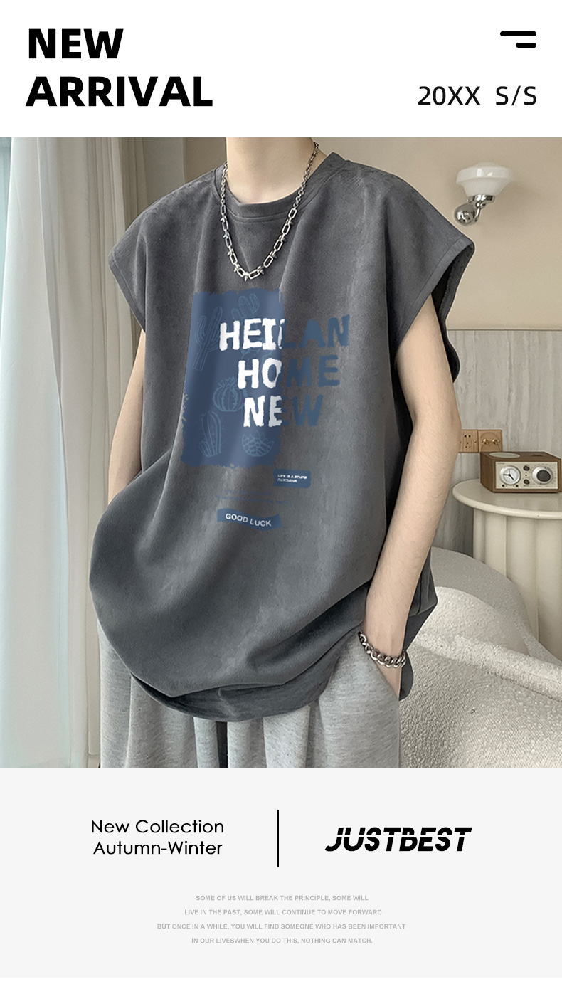 麂皮絨無袖T恤男款夏季寬鬆坎肩背心美式潮牌潮流男生短袖上衣服