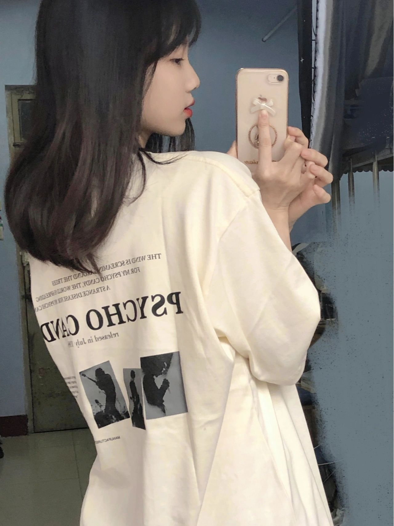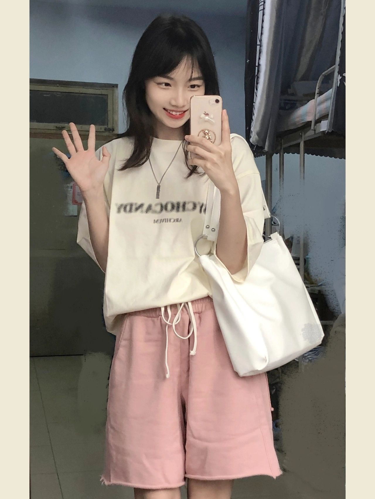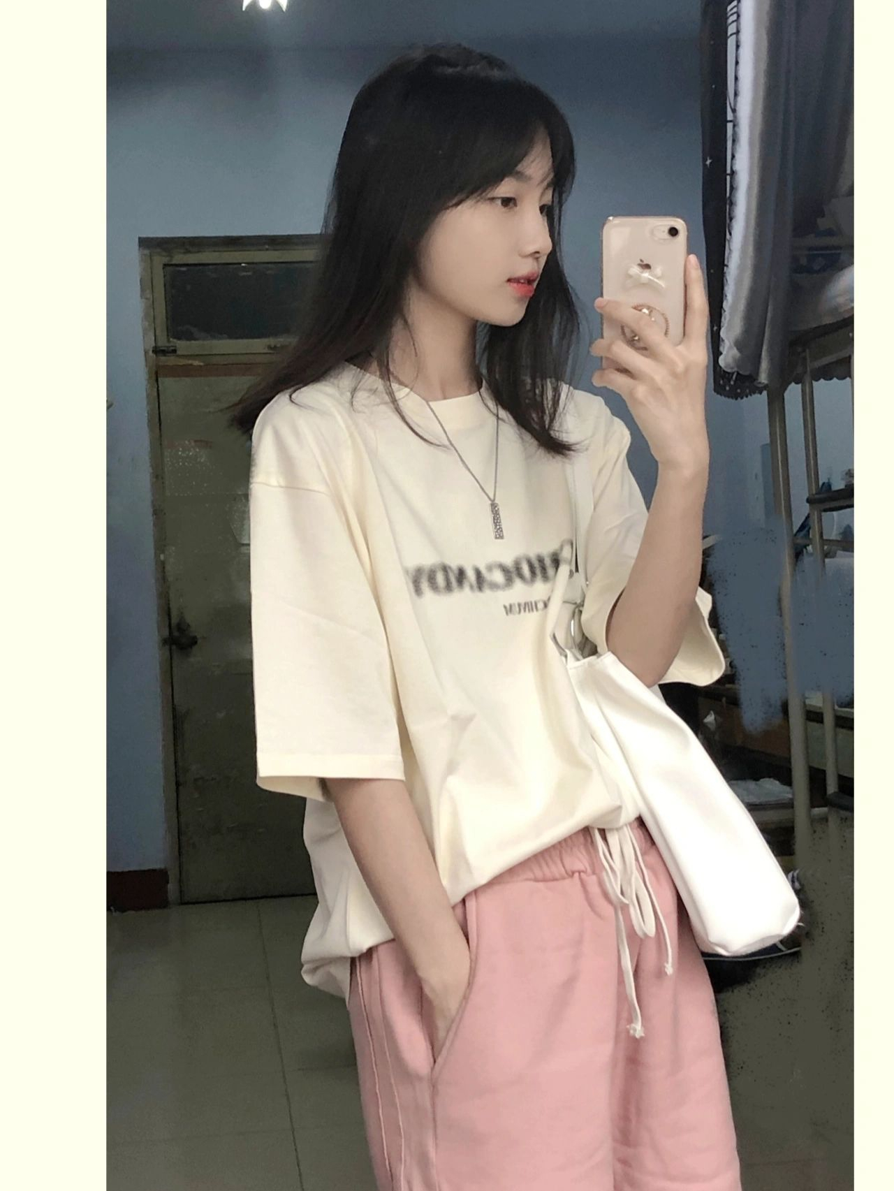 美式復古杏色短袖t恤女潮牌ins夏季2023新款寬鬆百搭高街國潮上衣