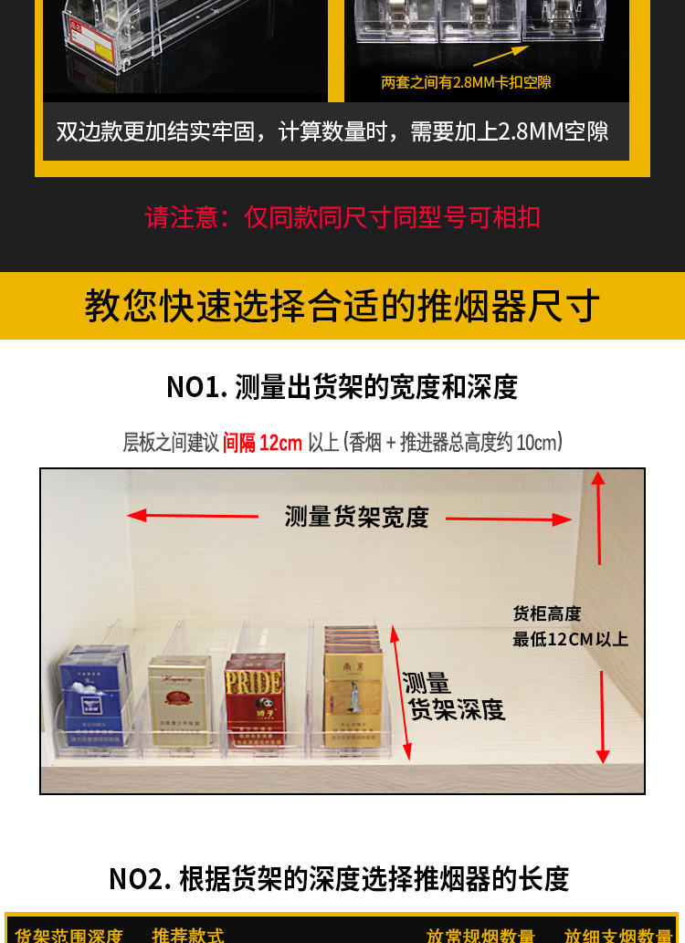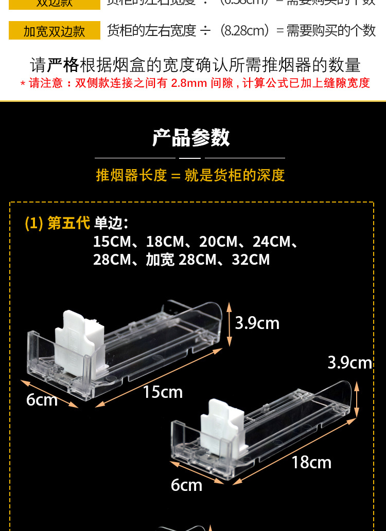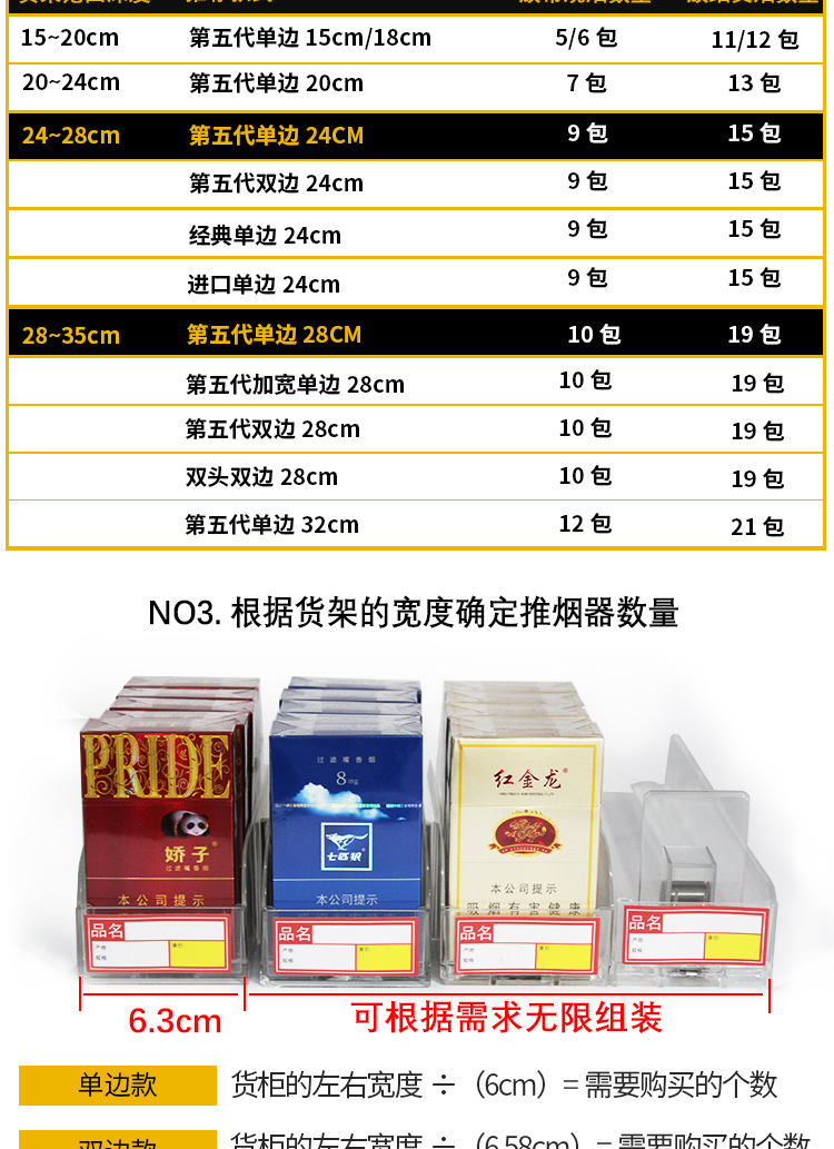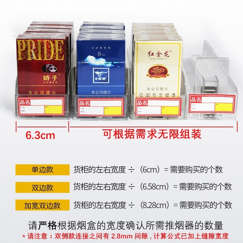 规格型号 第五代单边28cm(放10包烟/送标签)*1*39*180*60*39,经典款单边15CM(质保3年)(放5包烟/送标签)*1*39*180*60*39,经典款单边18CM(质保3年)(放6包烟/送标签)*1*39*180*60*39,经典款单边20CM(质保3年)(放7包烟/送标签)*1*39*180*60*39,第五代单边24cm(放9包烟/送标签)*1*39*180*60*39,经典款单边32CM(质保3年)(放12包烟/送标签)*1*39*180*60*39,经典款双边28CM(质保3年)(放10包烟/送标签)*1*39*180*60*39,推烟器加厚标签*10张*1*39*180*60*39,其他规格进店咨询客服
