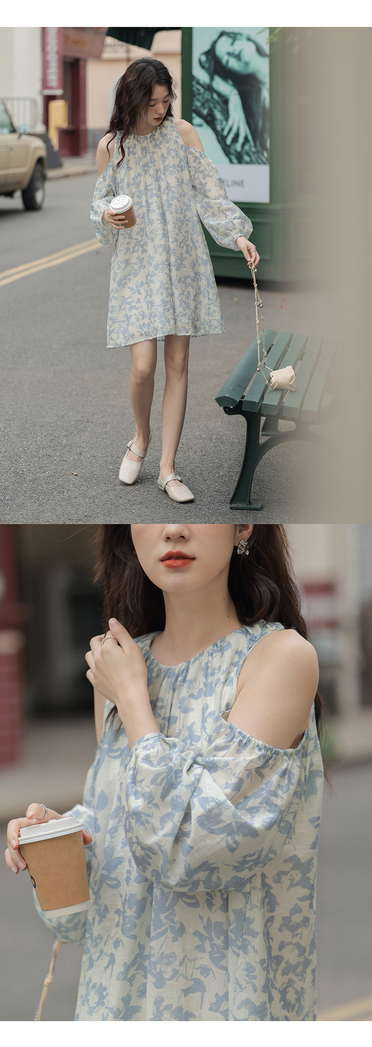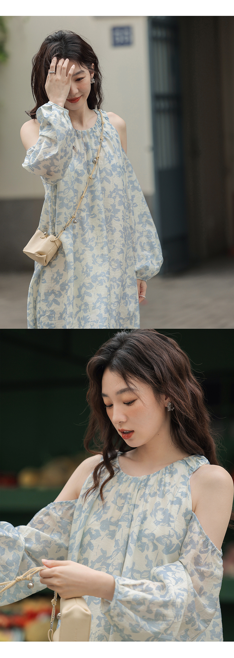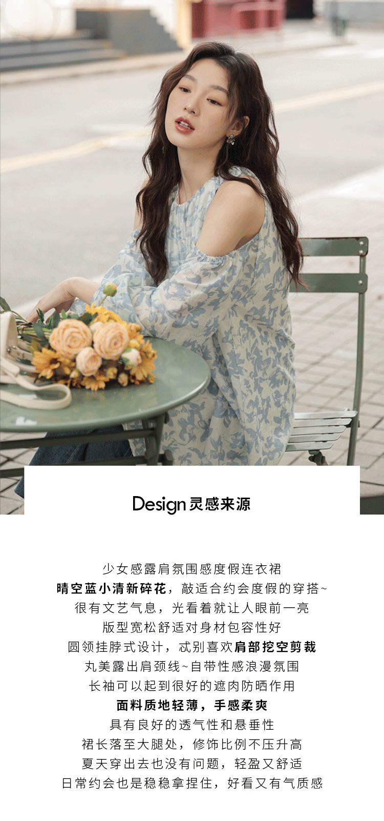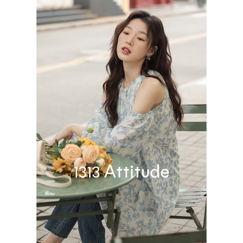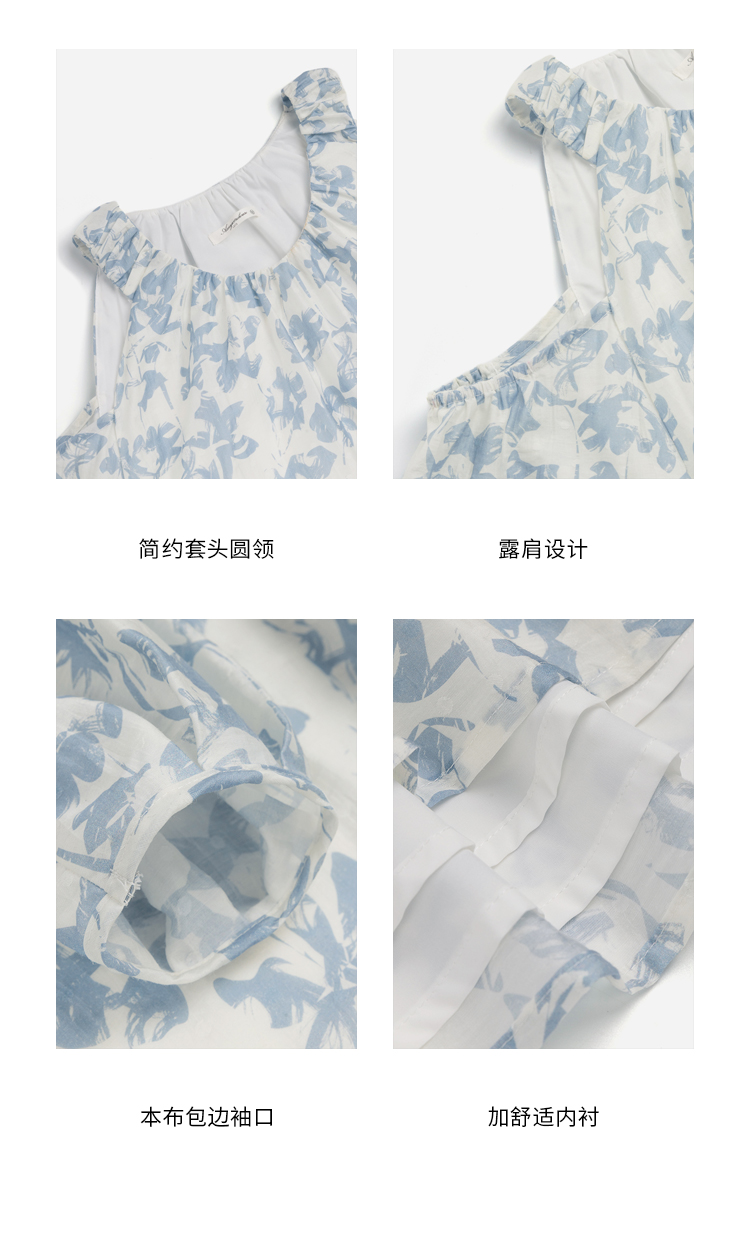 【現貨】1313肩部挖空設計85%天絲藍碎花 露肩掛頸洋裝娃娃短裙