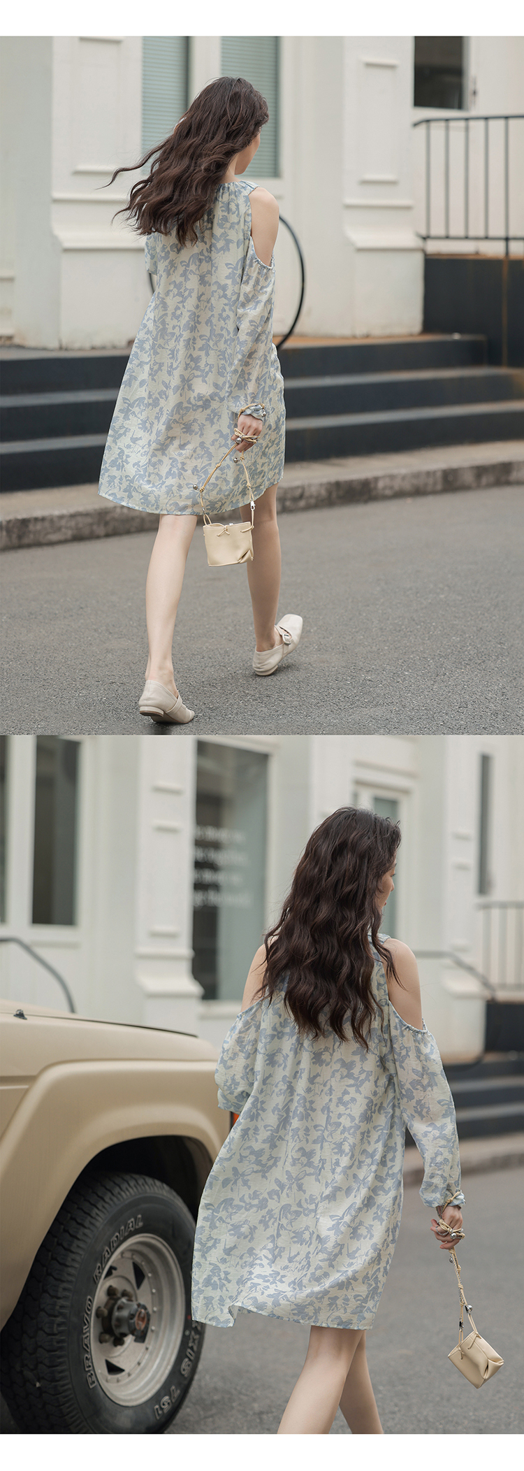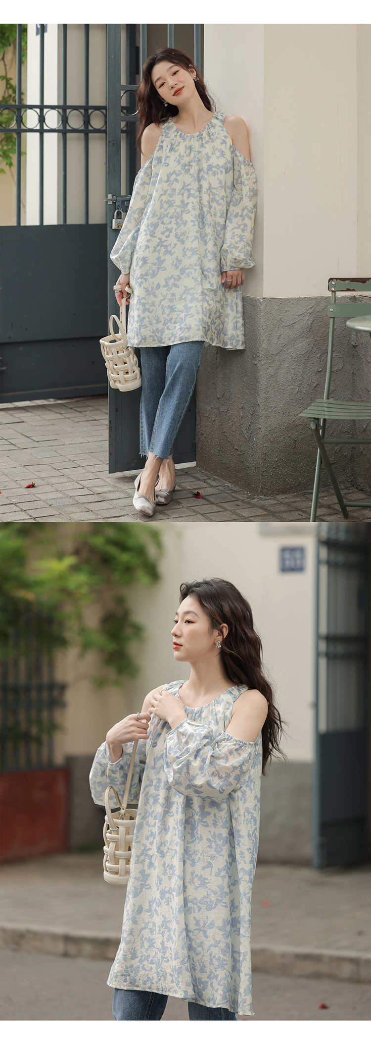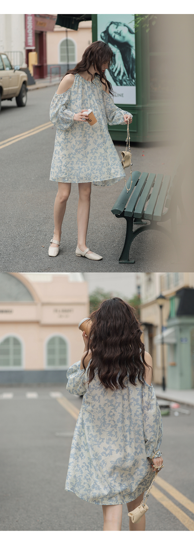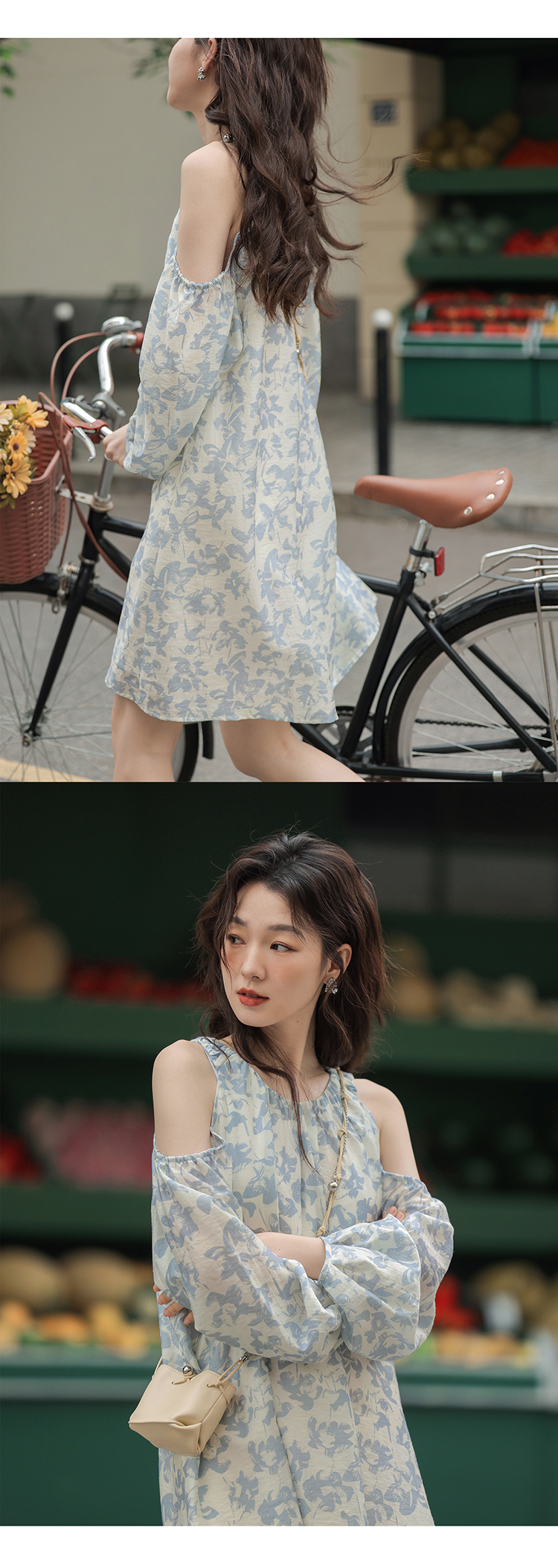 【現貨】1313肩部挖空設計85%天絲藍碎花 露肩掛頸洋裝娃娃短裙