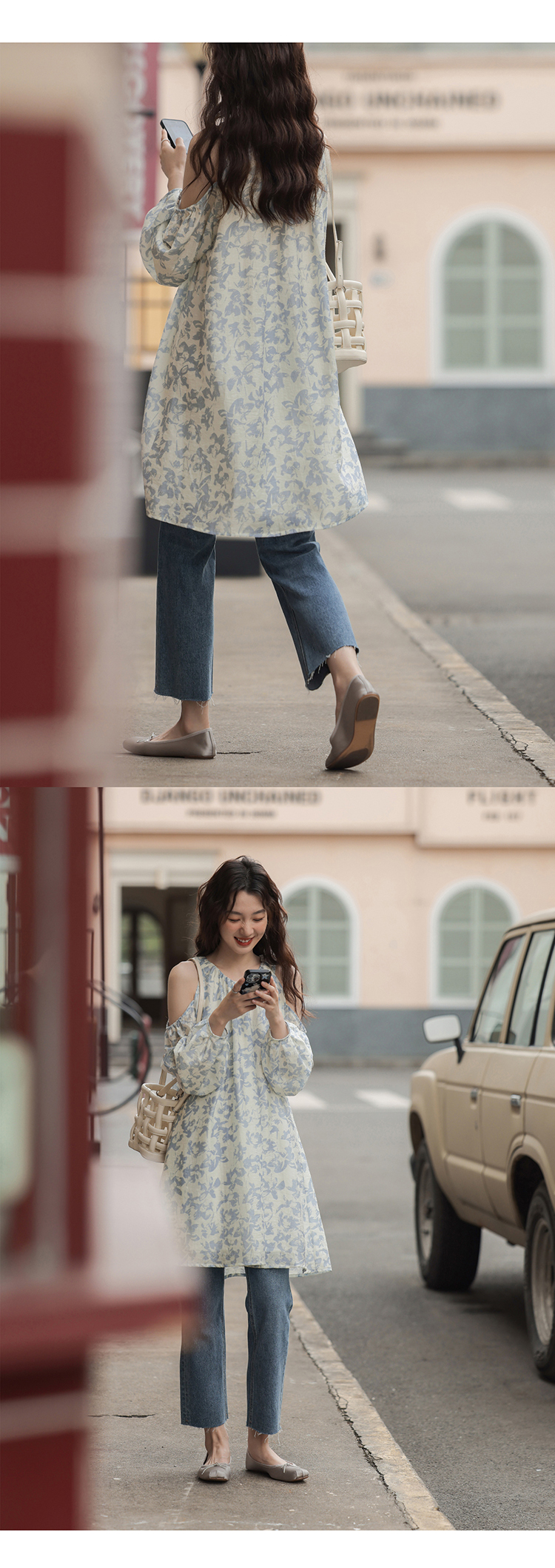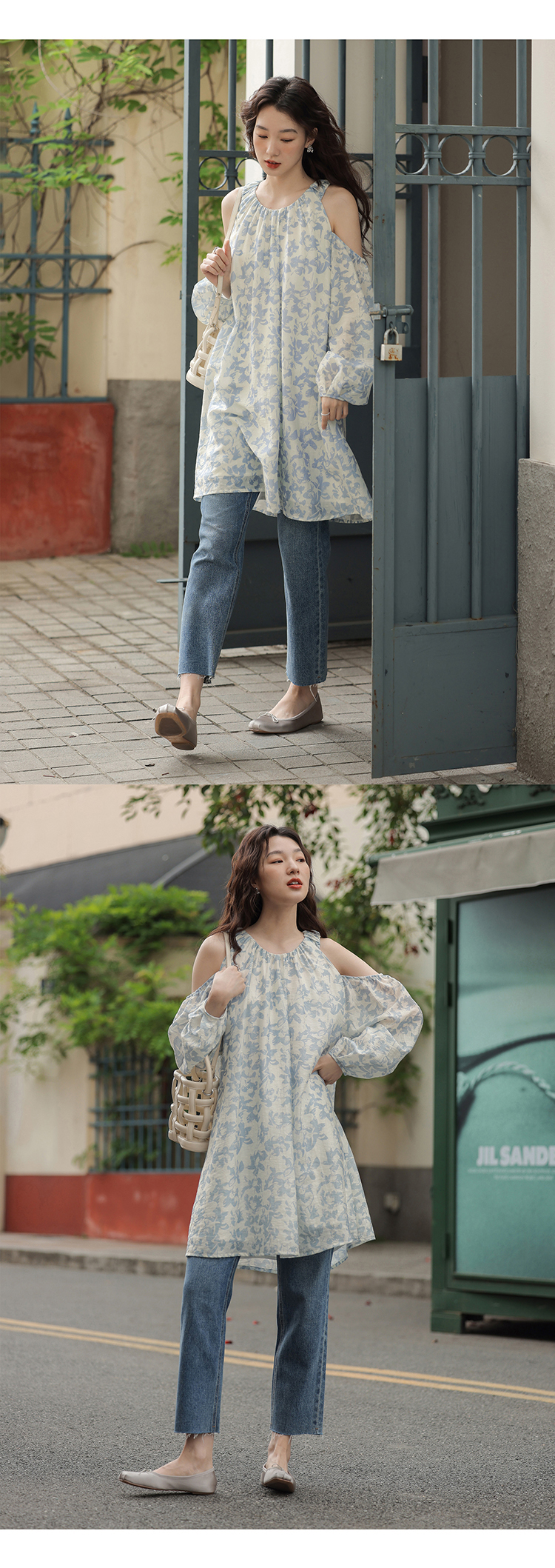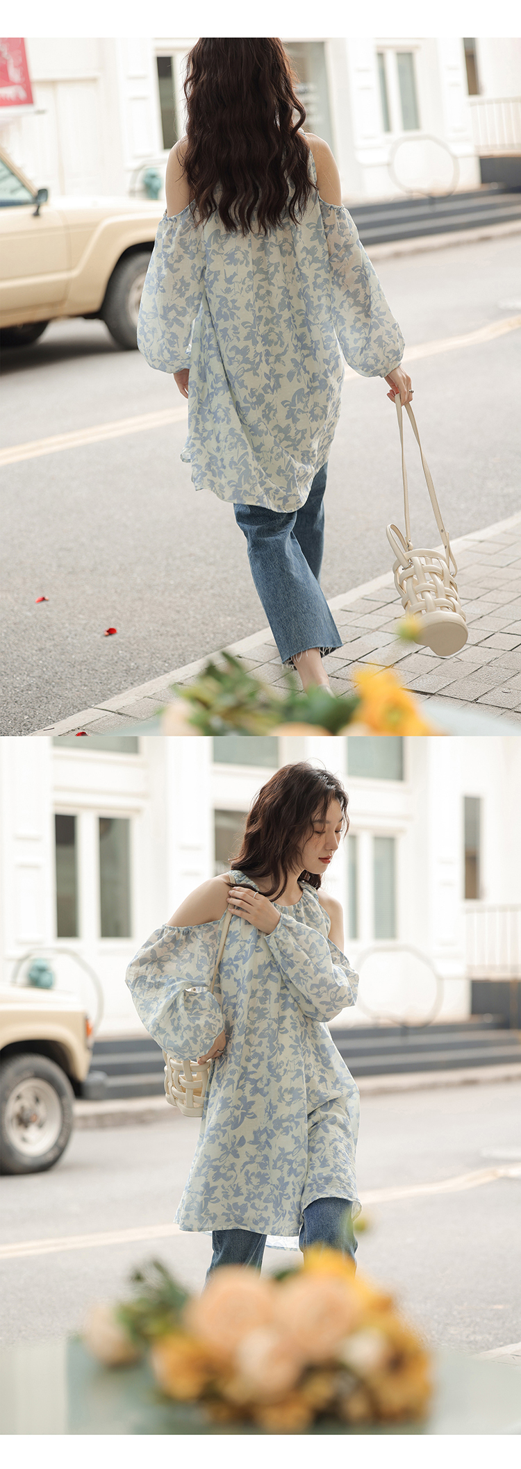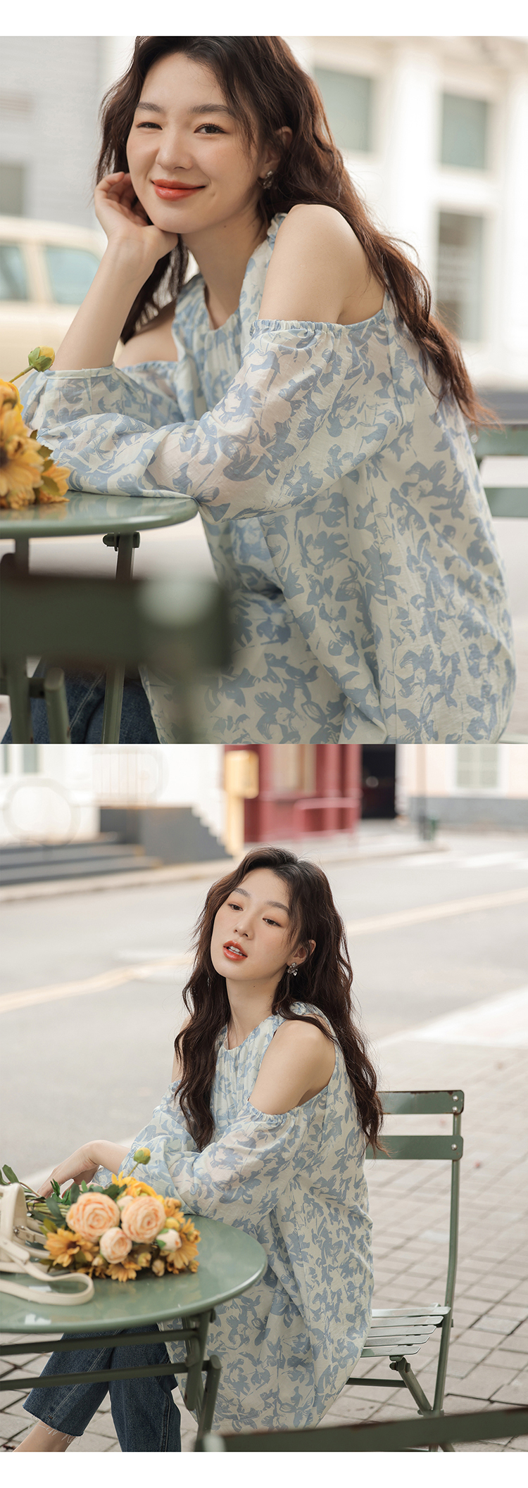 【現貨】1313肩部挖空設計85%天絲藍碎花 露肩掛頸洋裝娃娃短裙