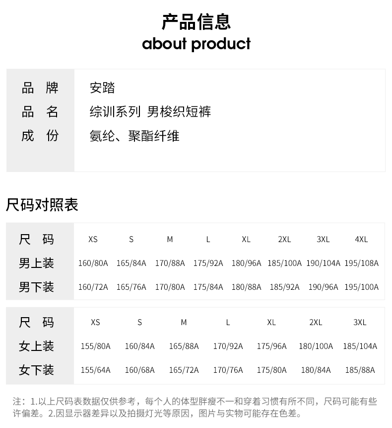 尺碼 160/XS 165/S 170/M 175/L 180/XL 185/2XL 190/3XL
