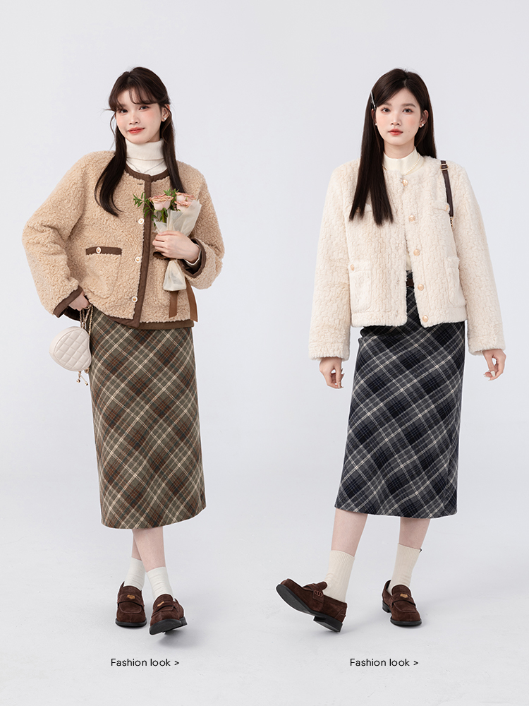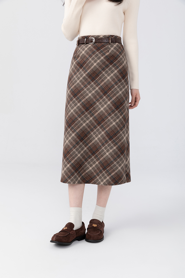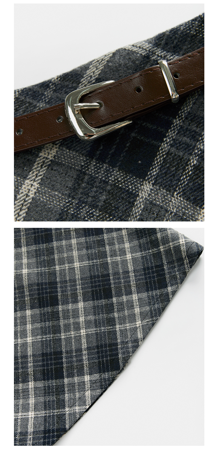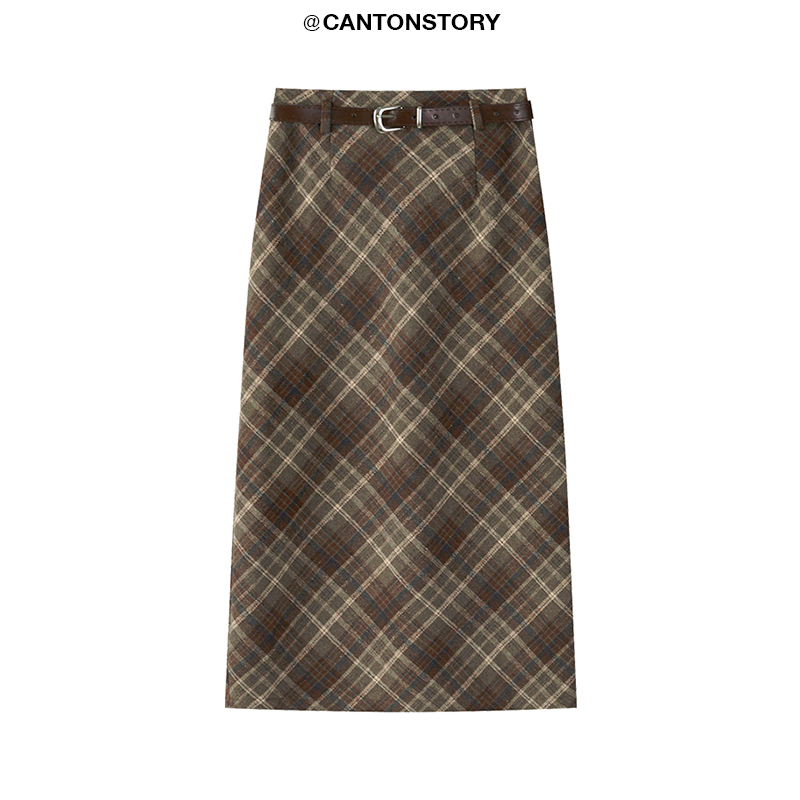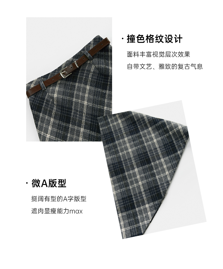 羊城故事法式復古配皮帶格紋半身裙女2023秋冬學院休閒高腰a字裙