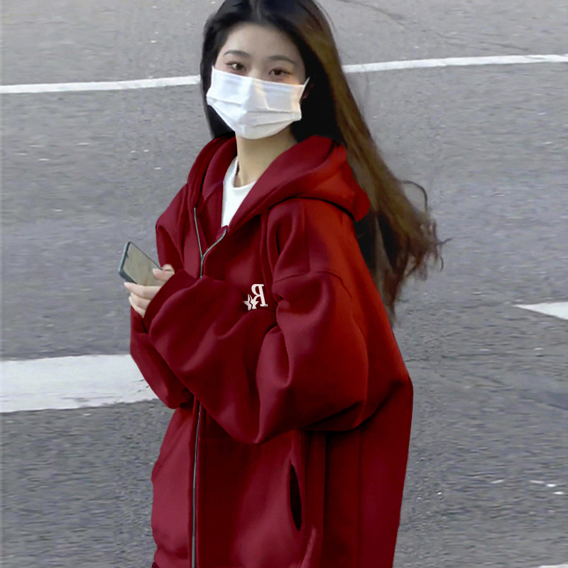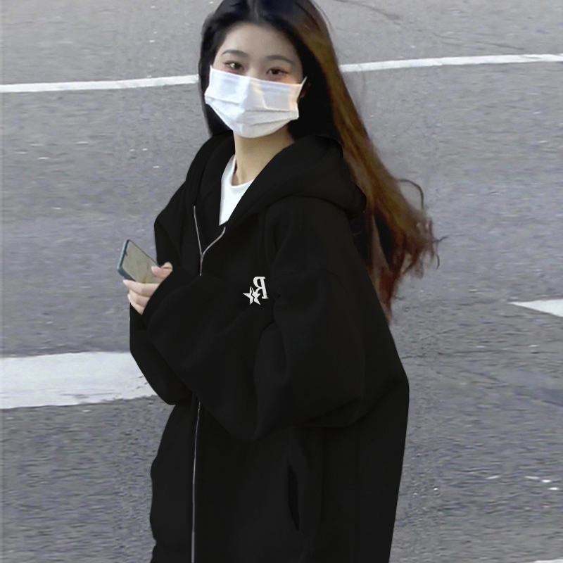 藏青色國潮hiphop高級感連帽運動衫女寬鬆薄款春秋2023新款拉鍊外套