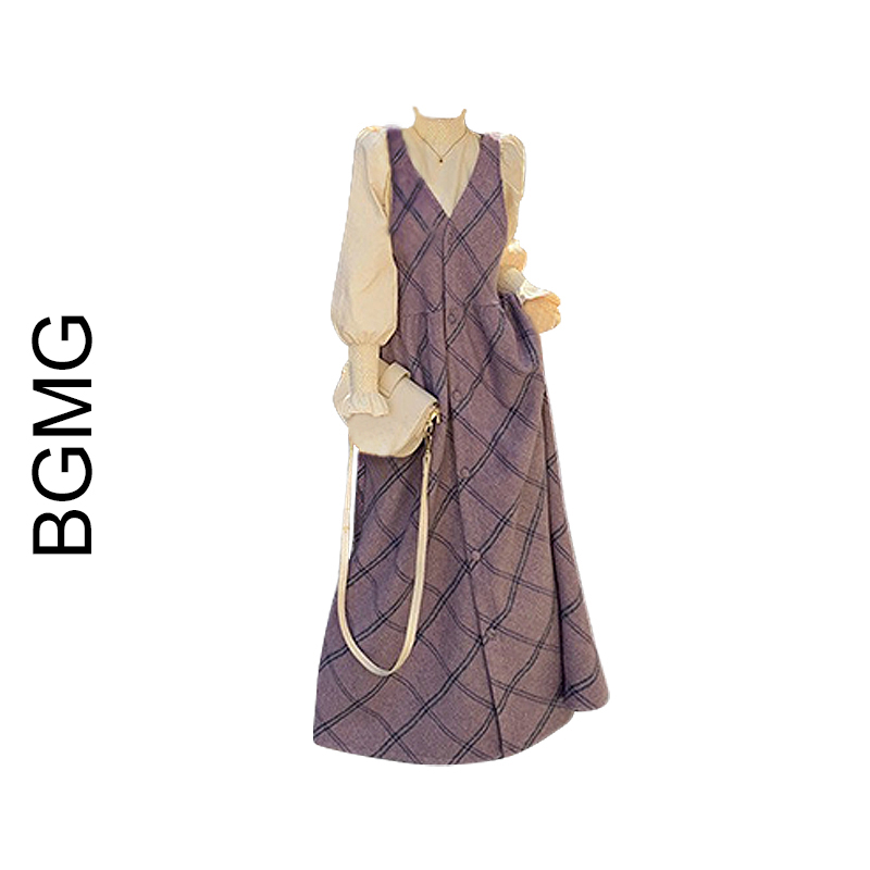 顏色分類 紫色格紋背心裙,白色打底上衣/半高領燈籠袖,背心裙+上衣,收藏加購送運費險