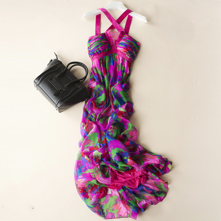 撿漏品牌專櫃撤回度假沙灘裙紫色印花吊帶真絲洋裝修身顯瘦長裙