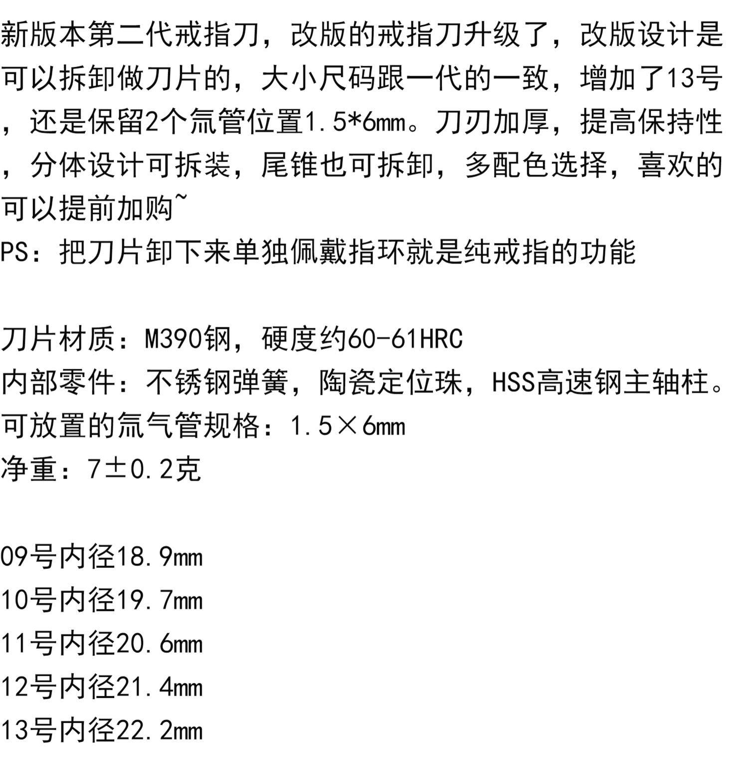 顏色分類 第一代鈦合金8號,第一代鈦合金9號,二代鈦合金9號 原色,二代鈦合金10號 原色,二代鈦合金11號 原色,二代鈦合金12號 原色,二代鈦合金13號 原色,二代藍色,二代鈦合金9號 藍色,二代鈦合金10號 藍色,二代鈦合金11號 藍色,二代鈦合金12號 藍色,二代鈦合金13號 藍色,二代黑色,二代鈦合金9號 黑色,二代鈦合金10號 黑色,二代鈦合金11號 黑色,二代鈦合金12號 黑色,二代鈦合金13號 黑色