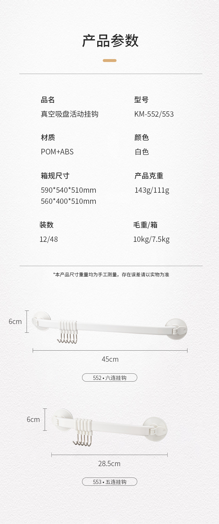 颜色 552#吸盘挂钩(6连钩),553#吸盘挂钩(5连钩),516#小号-两枚入,517#中号-单个装,518#大号-单个装