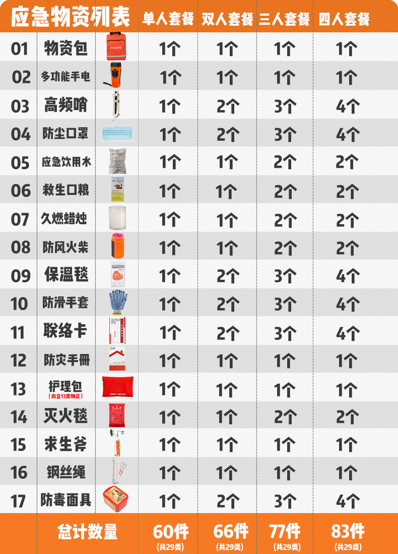顏色分類 家庭應急基礎版,單人防災戰備逃生包(72件套),雙人防災戰備逃生包(84件套),三人防災戰備逃生包(132件套),四人防災戰備逃生包(152件套),人防標準版(單人),人防標準版(2人),人防標準版(3人),人防標準版(4人),應急救援包基礎版,應急救援包升級版,人防逃生包