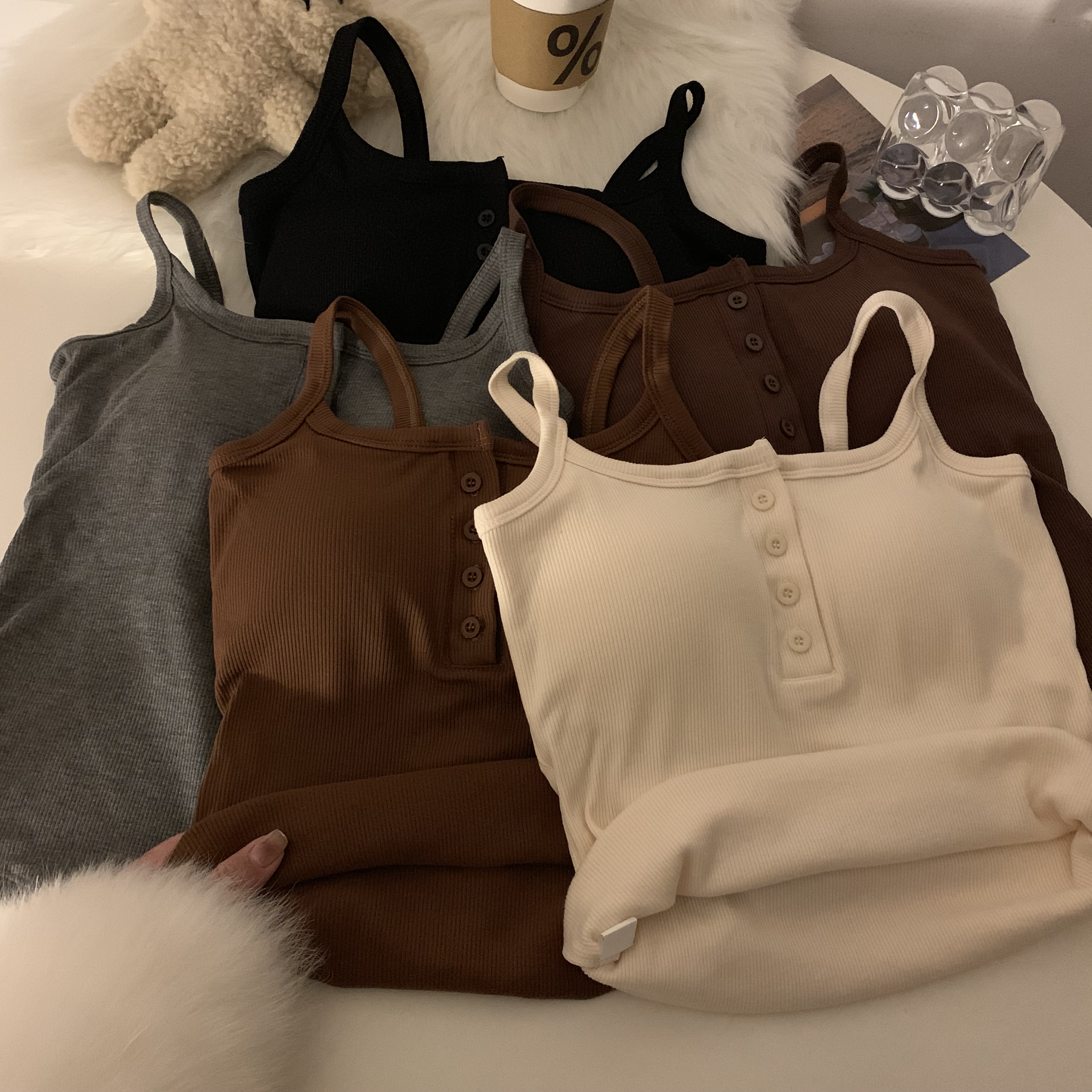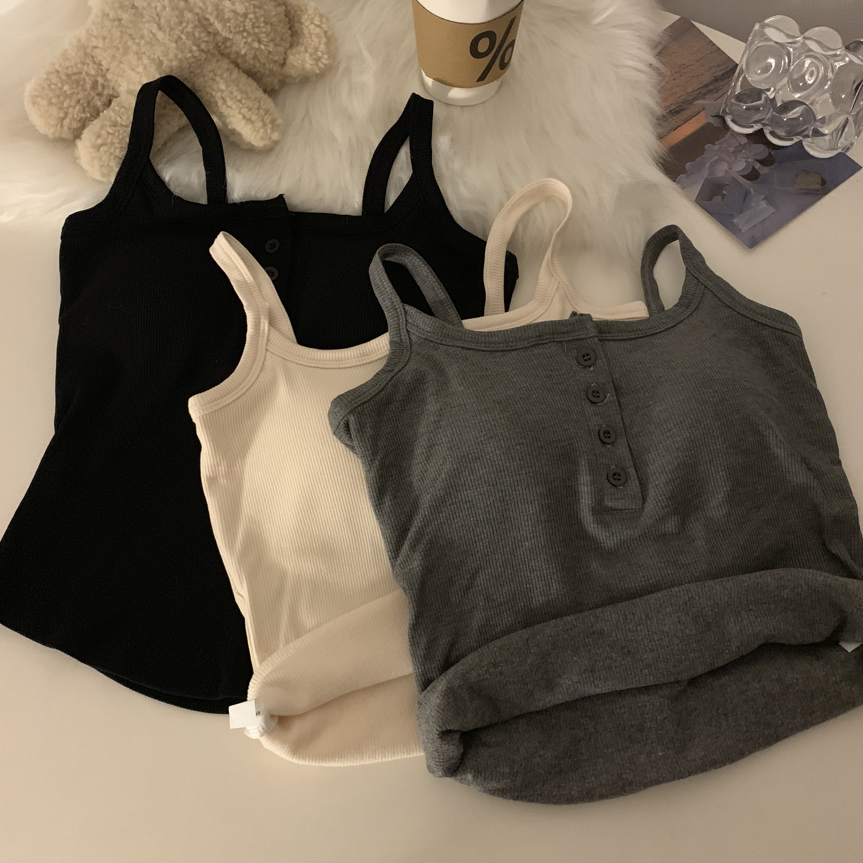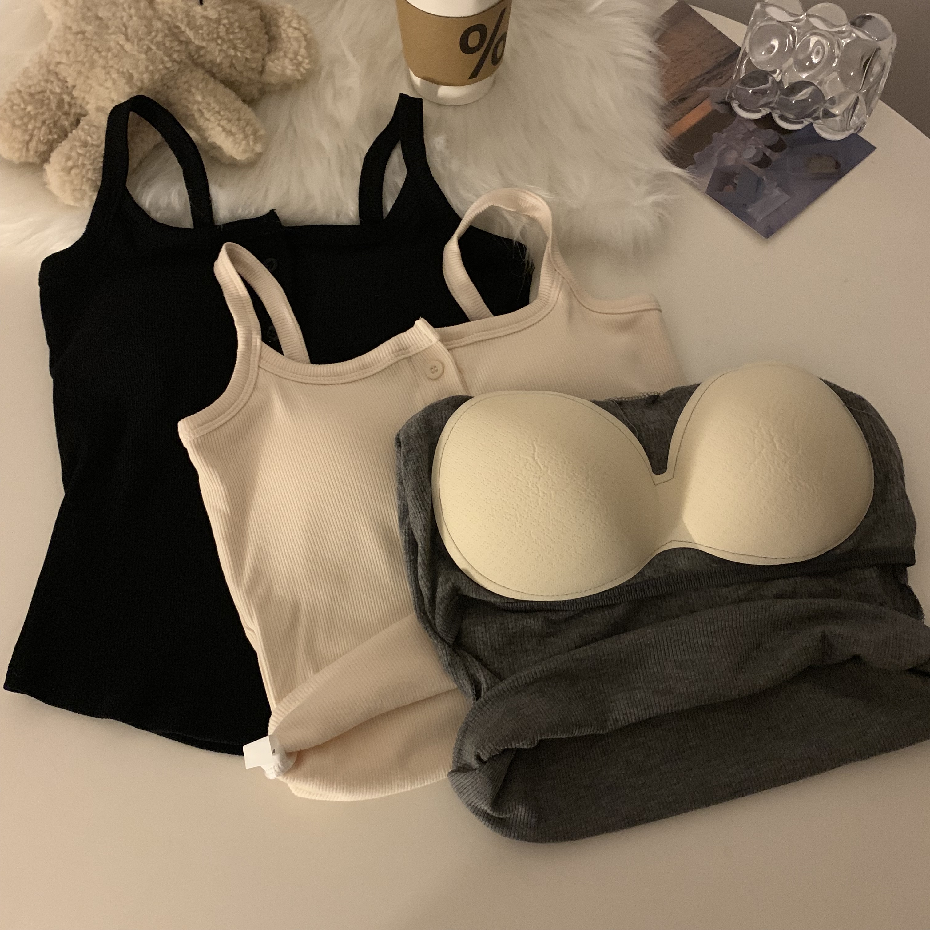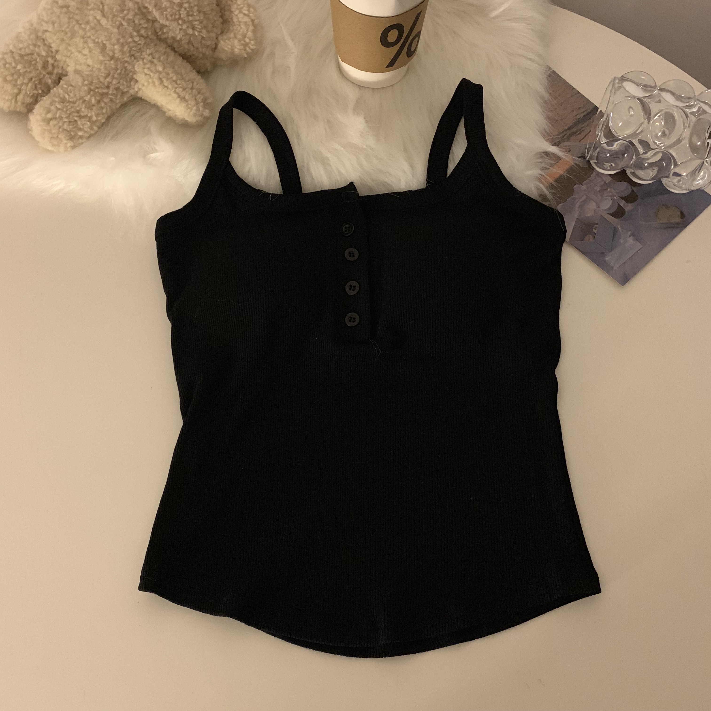 短款帶胸墊杏色吊帶秋季外穿無袖黑色背心女內搭加絨加厚打底上衣